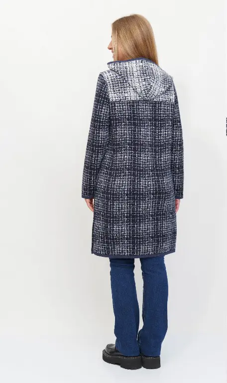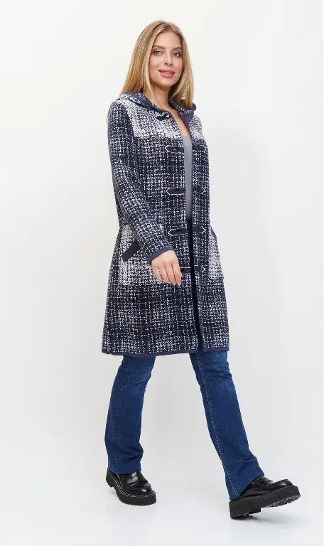 Женский кардиган с капюшоном и длиной до колена. Рукава втачные длинные. Вязаный кардиган на пуговицах, два прорезных кармана с листочкой. Кардиган выполнен жаккардовым переплетением. Кокетка на полочках, караманы и капюшон контрастного цвета