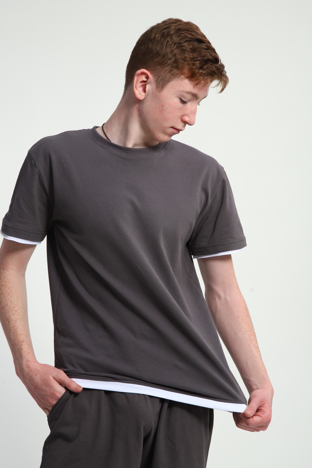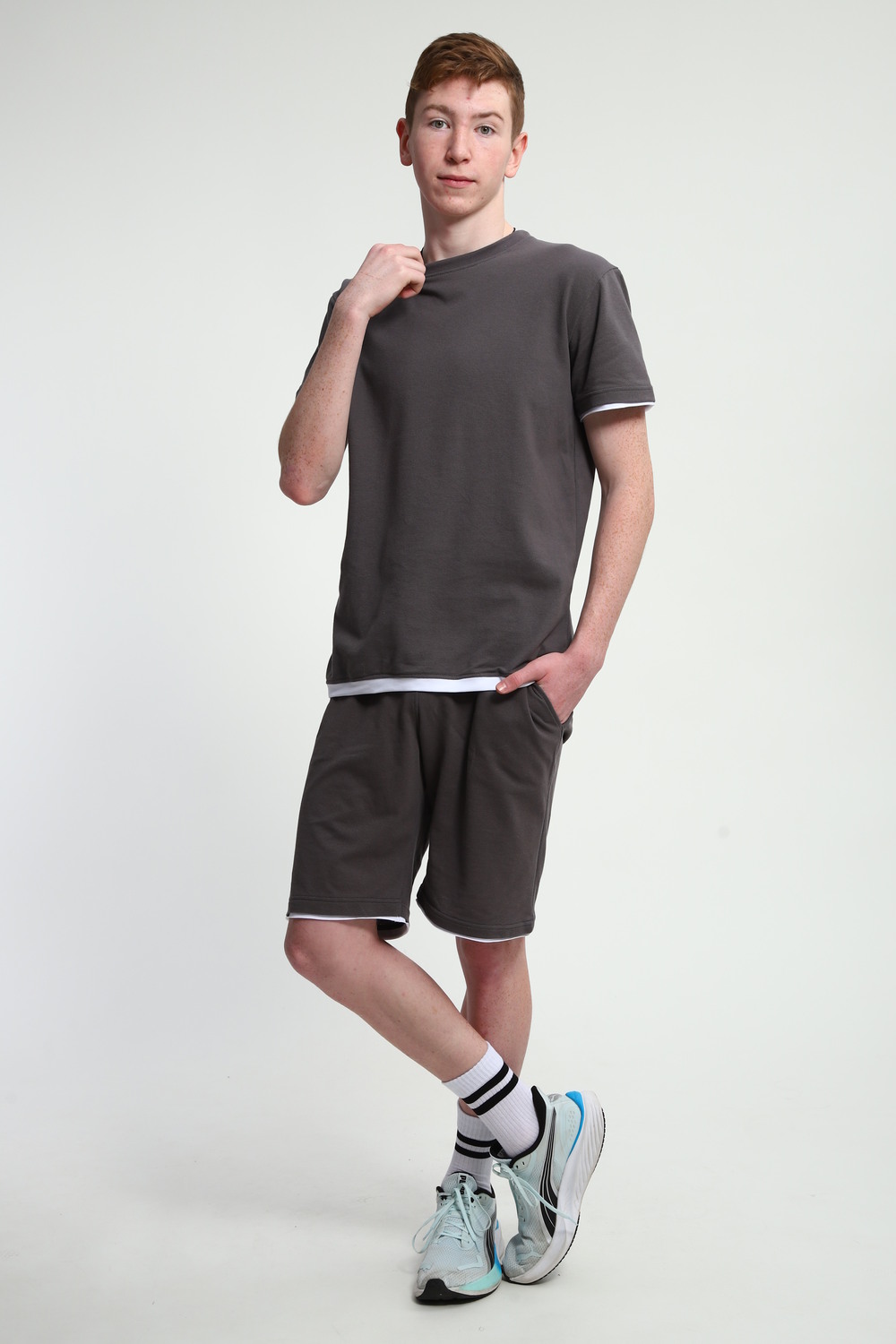 Костюм мужской состоит из футболки и шорт, выполнен из лакост 100% хлопок. Футболка отделана по низу планкой контрастного белого цвета, горловина обработана обтачкой из рибаны. Низ рукава и шорт обработан тканью контрастного белого цвета с необработанным краем. На шортах карманы в боку, пояс на резике с шнурком. Костюм идеально подойдет для спорта, отдыха и дома.