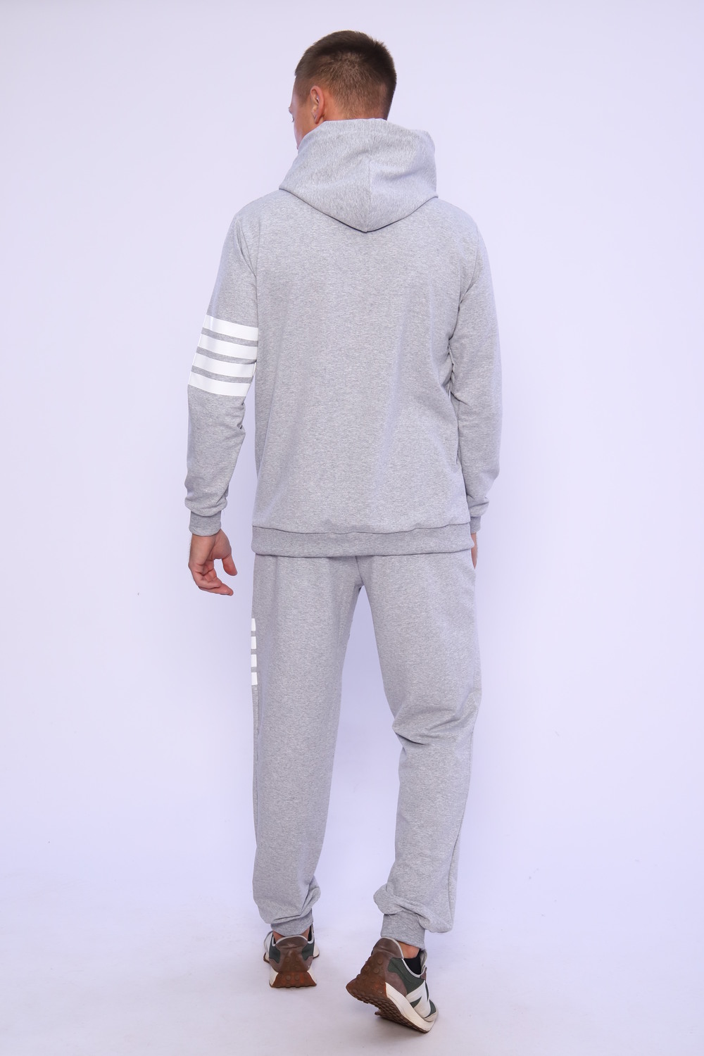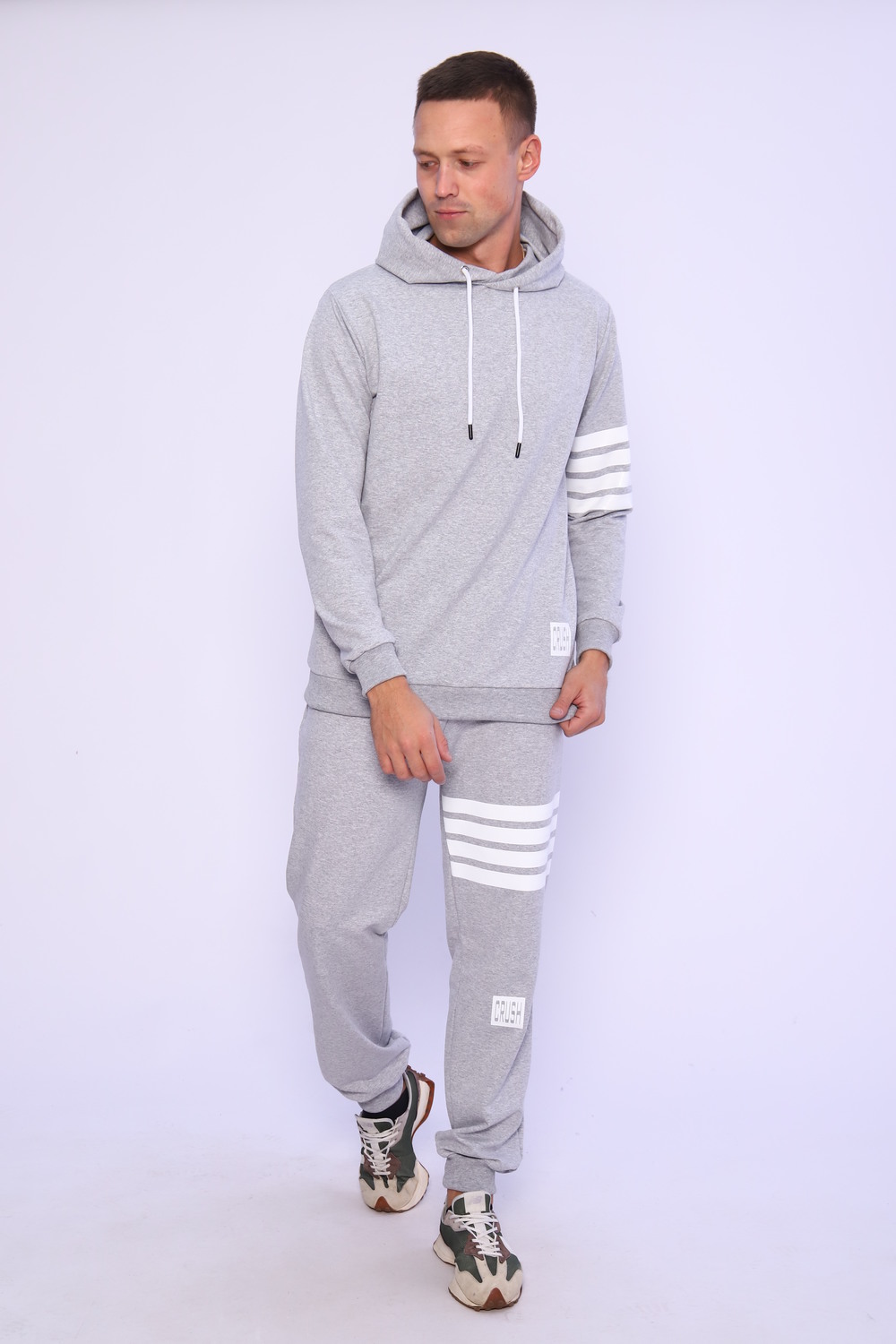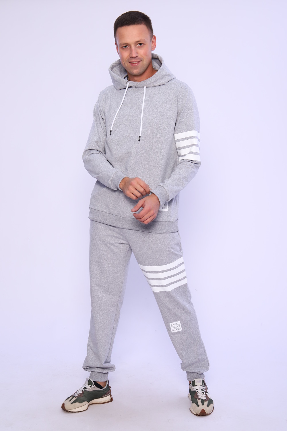 Спортивный мужской костюм отлично подойдет для тренировок дома и игр на улице. Этот модный, мягкий трикотажный костюм с прямыми и аккуратными швами. Толстовка прямого силуэта с двойным капюшоном и карманом кенгуру. Брюки на манжете с карманами в боковых швах.