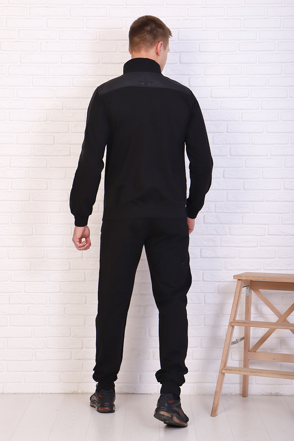 Мужской костюм спортивного плана. Кофта и карманы по бокам на молнии, сверху карман - обманка. На рукавах, по бокам кофты и сверху - вставка из плащевки. Воротник - стойка, рукава и низ кофты на манжетах. Брюки на манжетах, карманы на молнии, с декоративной листочкой. Сбоку на брюках и толстовке вышивная надпись.