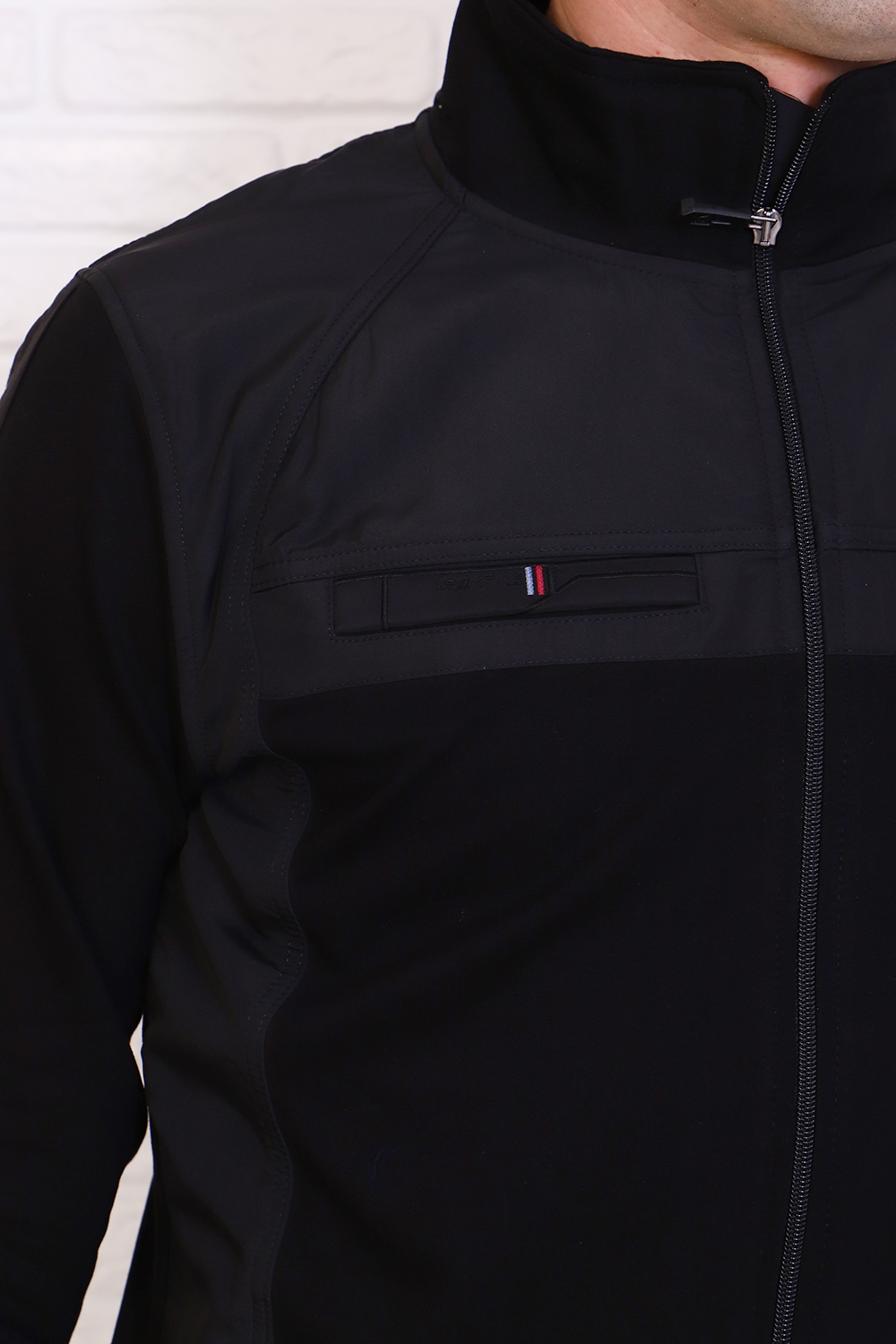 Мужской костюм спортивного плана. Кофта и карманы по бокам на молнии, сверху карман - обманка. На рукавах, по бокам кофты и сверху - вставка из плащевки. Воротник - стойка, рукава и низ кофты на манжетах. Брюки на манжетах, карманы на молнии, с декоративной листочкой. Сбоку на брюках и толстовке вышивная надпись.