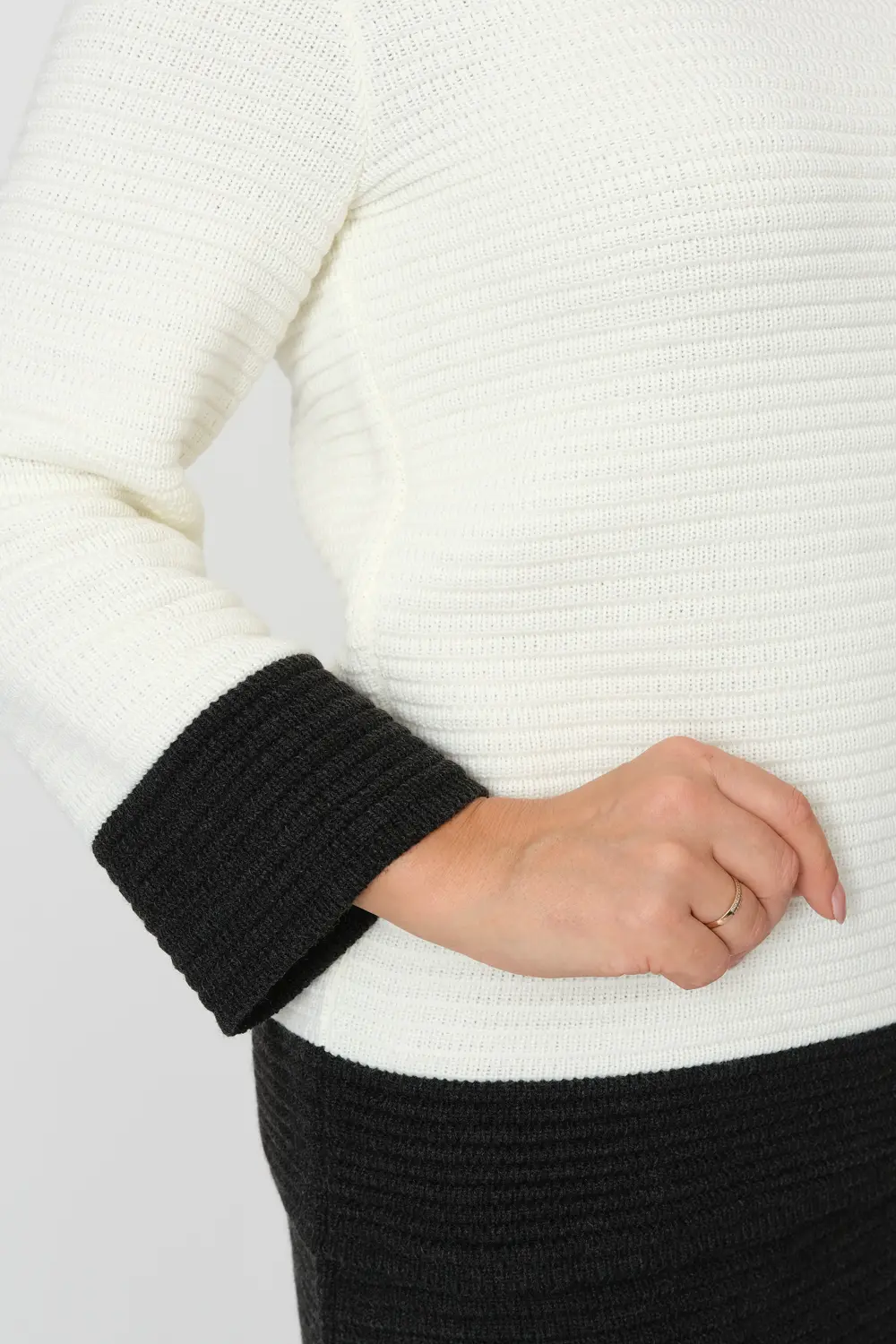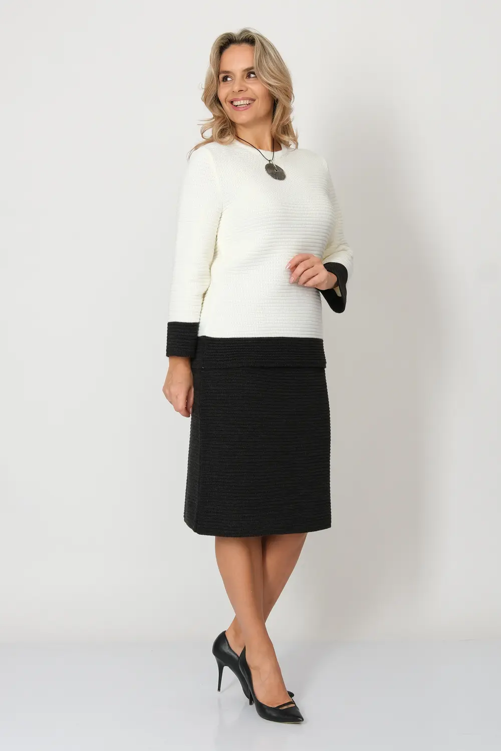 Костюм состоит из джемпера и юбки. Джемпер свободного силуэта с круглой горловиной. Рукава втачные длинные расклешенные к низу. По низу изделия и рукавов отделка контрастного цвета.