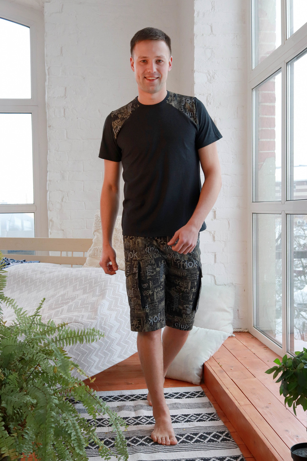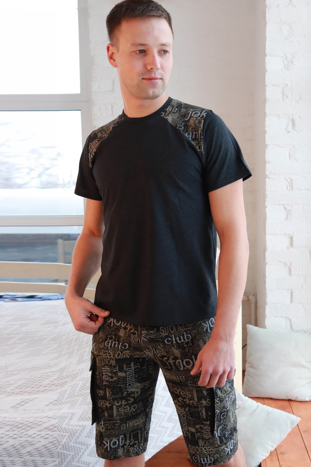 Мужской костюм. В комплекте футболка классического кроя с коротким рукавом. Яркие шорты с карманами, длина чуть ниже колена.