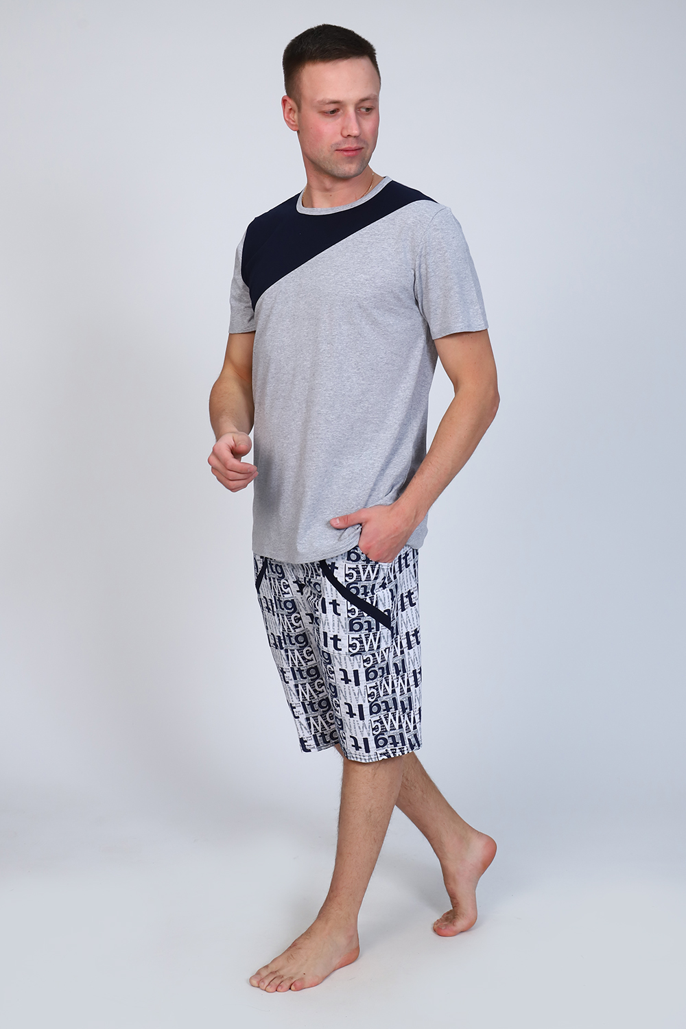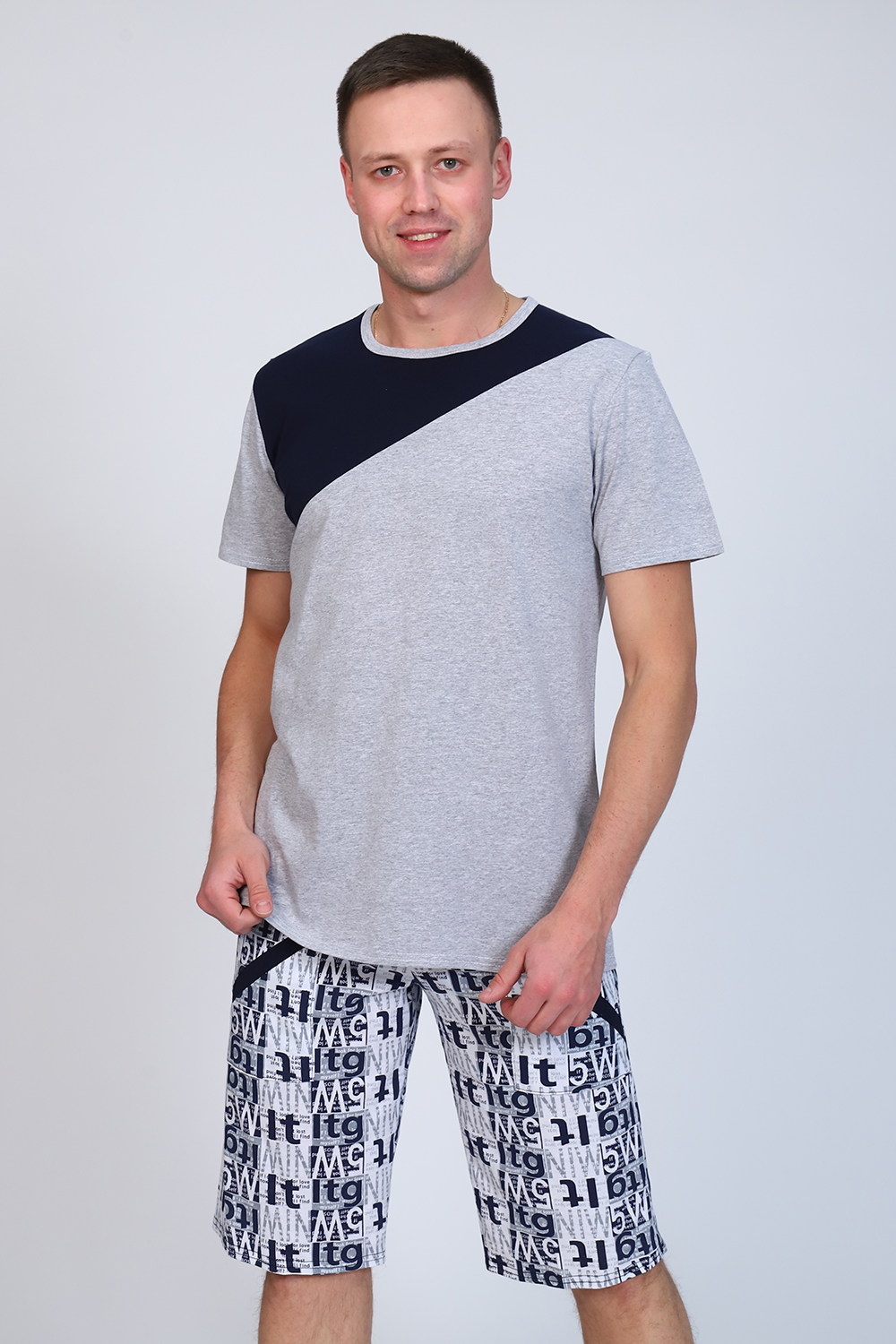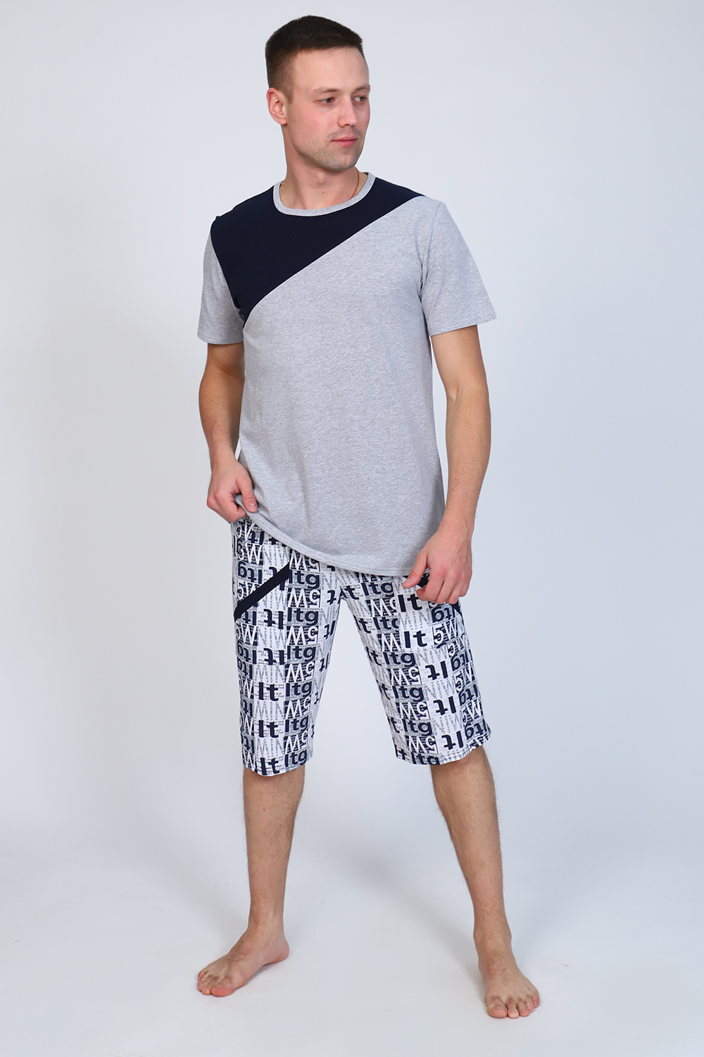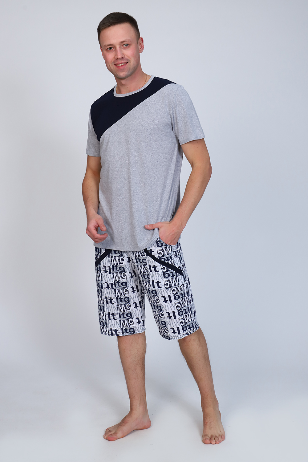 Мужской костюм состоит из футболки и бриджей. Бриджи с карманами, длина чуть ниже колена. Есть черный и серый цвет, состав серого цвета верх: 60% хб + 40% ПЭ; низ: 60% ХБ+ 40% ПЭ и черного цвета верх: 55% хб + 40% ПЭ + 5% эластан; низ: 60% хб + 40% ПЭ. Комплект костюма состоит из широкого размерного ряда. Отличный и удобный вариант на каждый день.