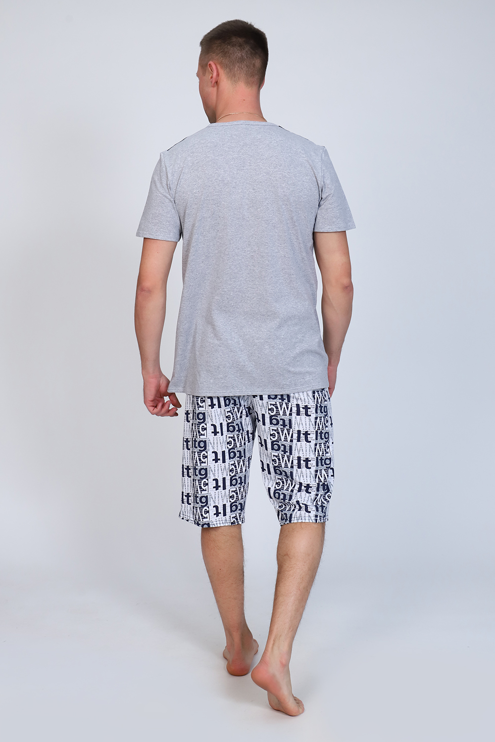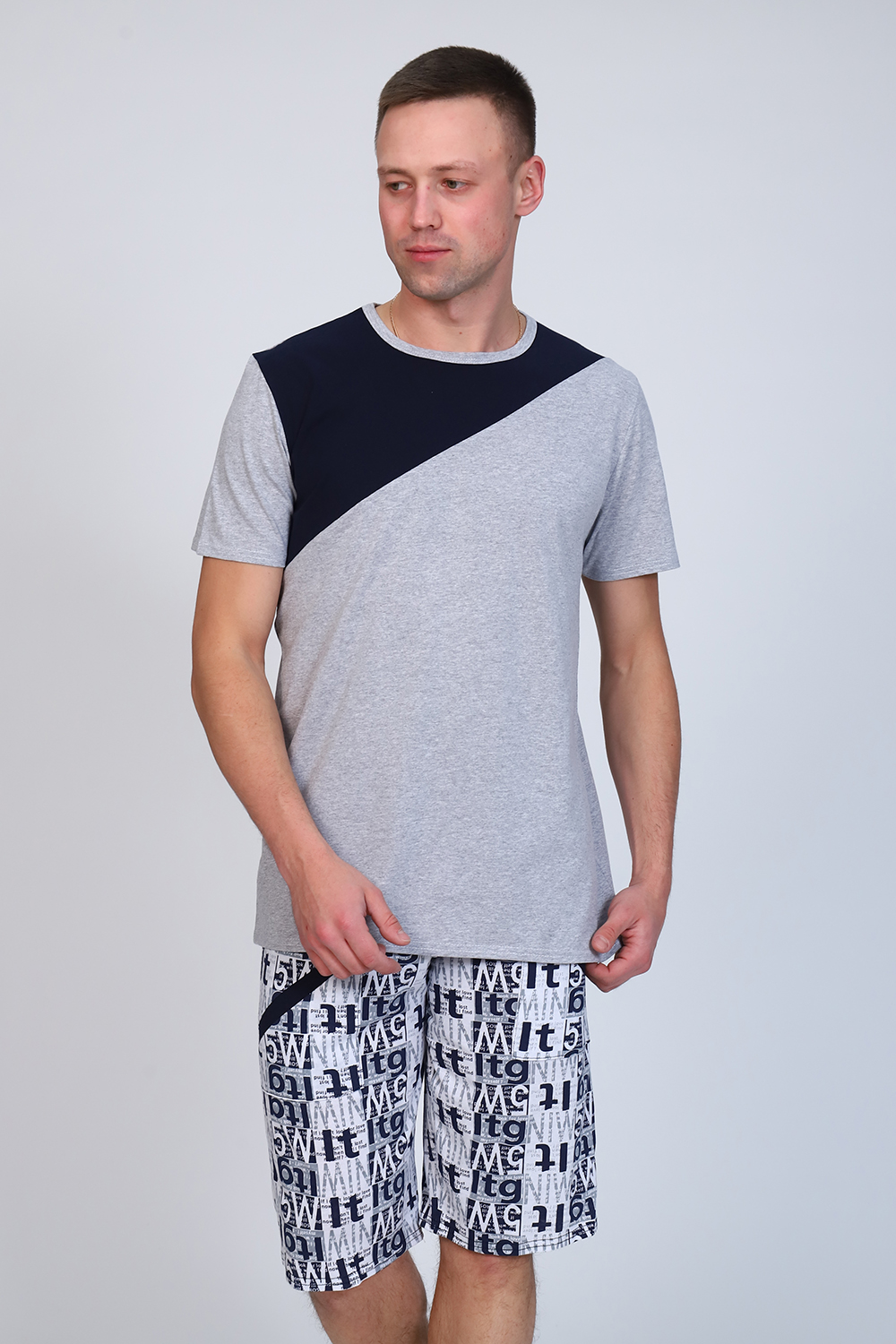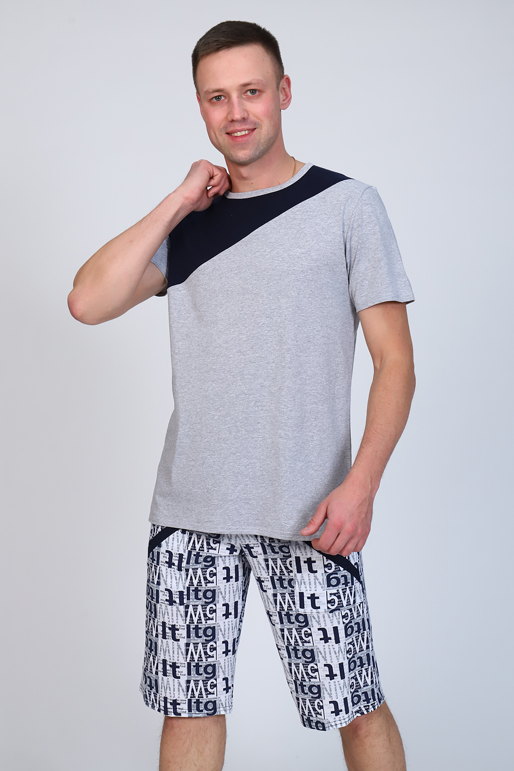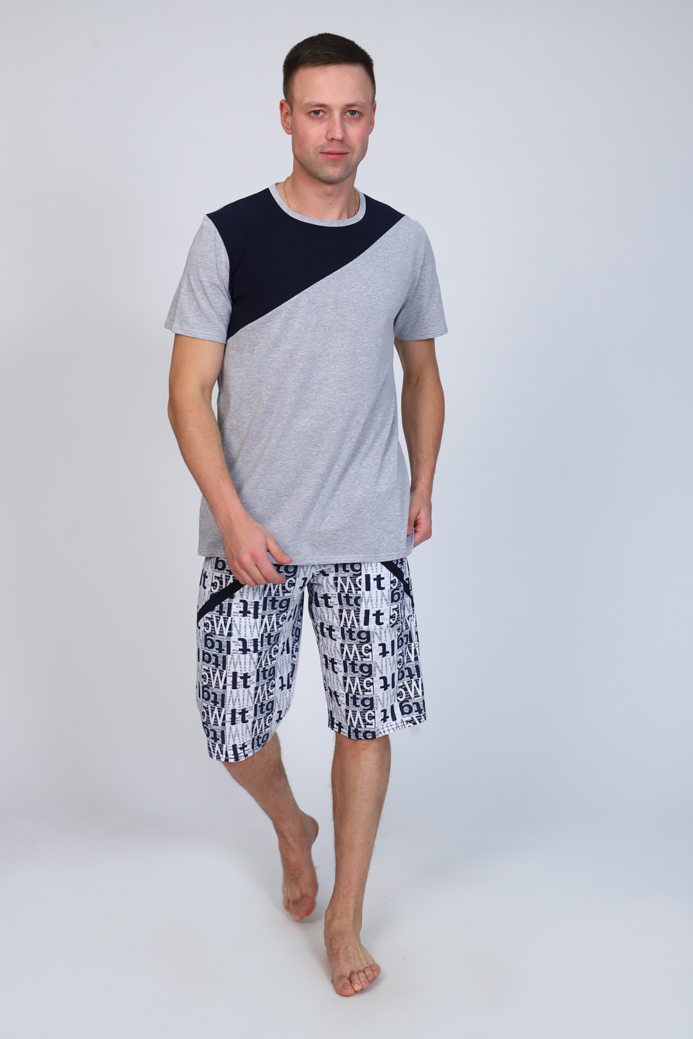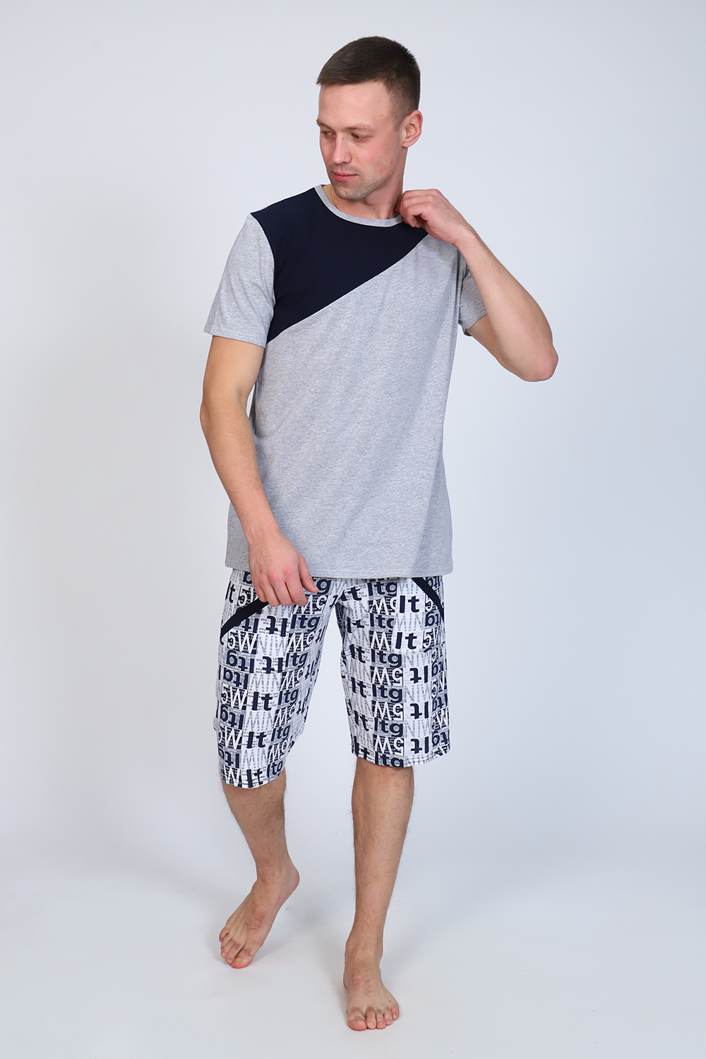 Мужской костюм состоит из футболки и бриджей. Бриджи с карманами, длина чуть ниже колена. Есть черный и серый цвет, состав серого цвета верх: 60% хб + 40% ПЭ; низ: 60% ХБ+ 40% ПЭ и черного цвета верх: 55% хб + 40% ПЭ + 5% эластан; низ: 60% хб + 40% ПЭ. Комплект костюма состоит из широкого размерного ряда. Отличный и удобный вариант на каждый день.