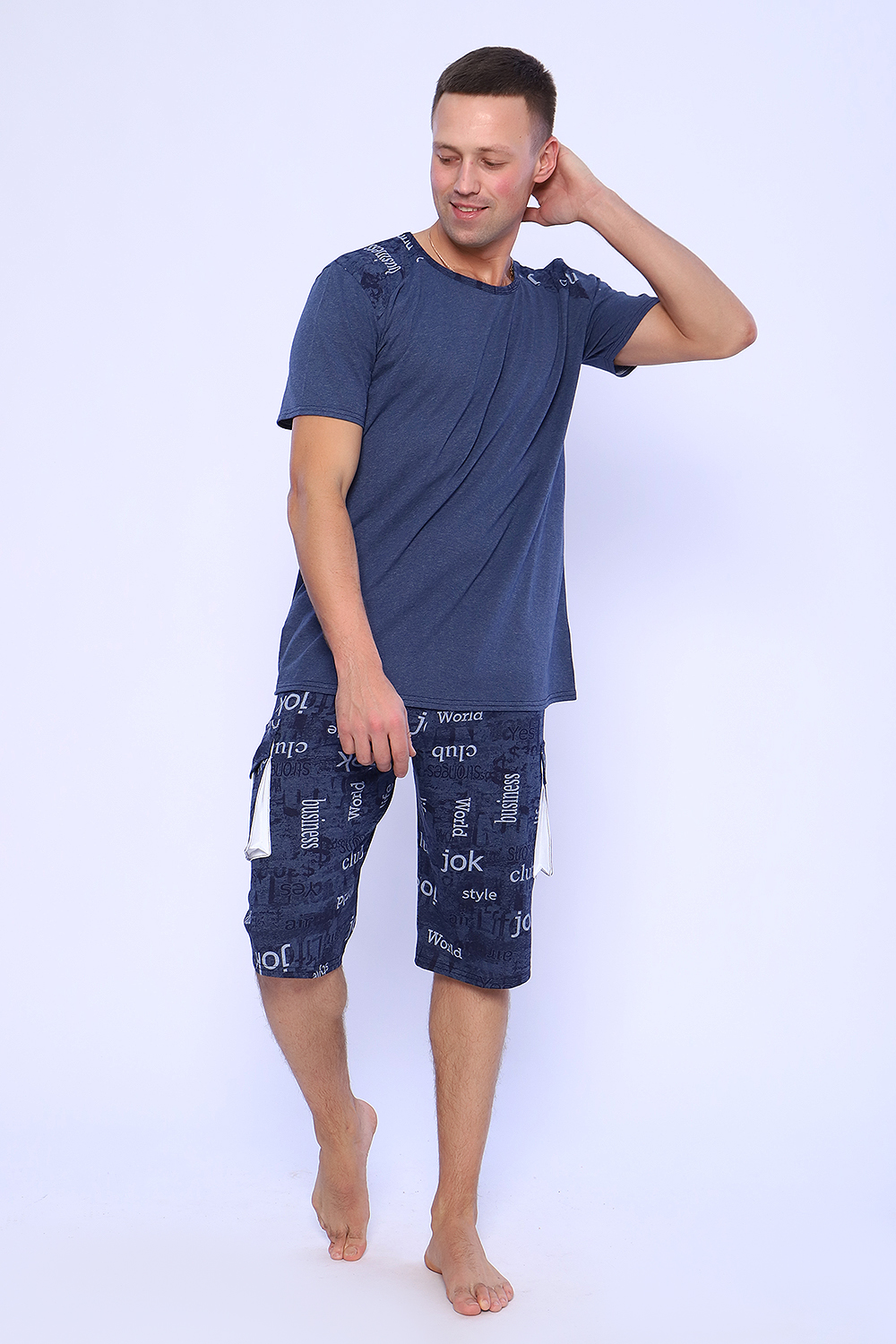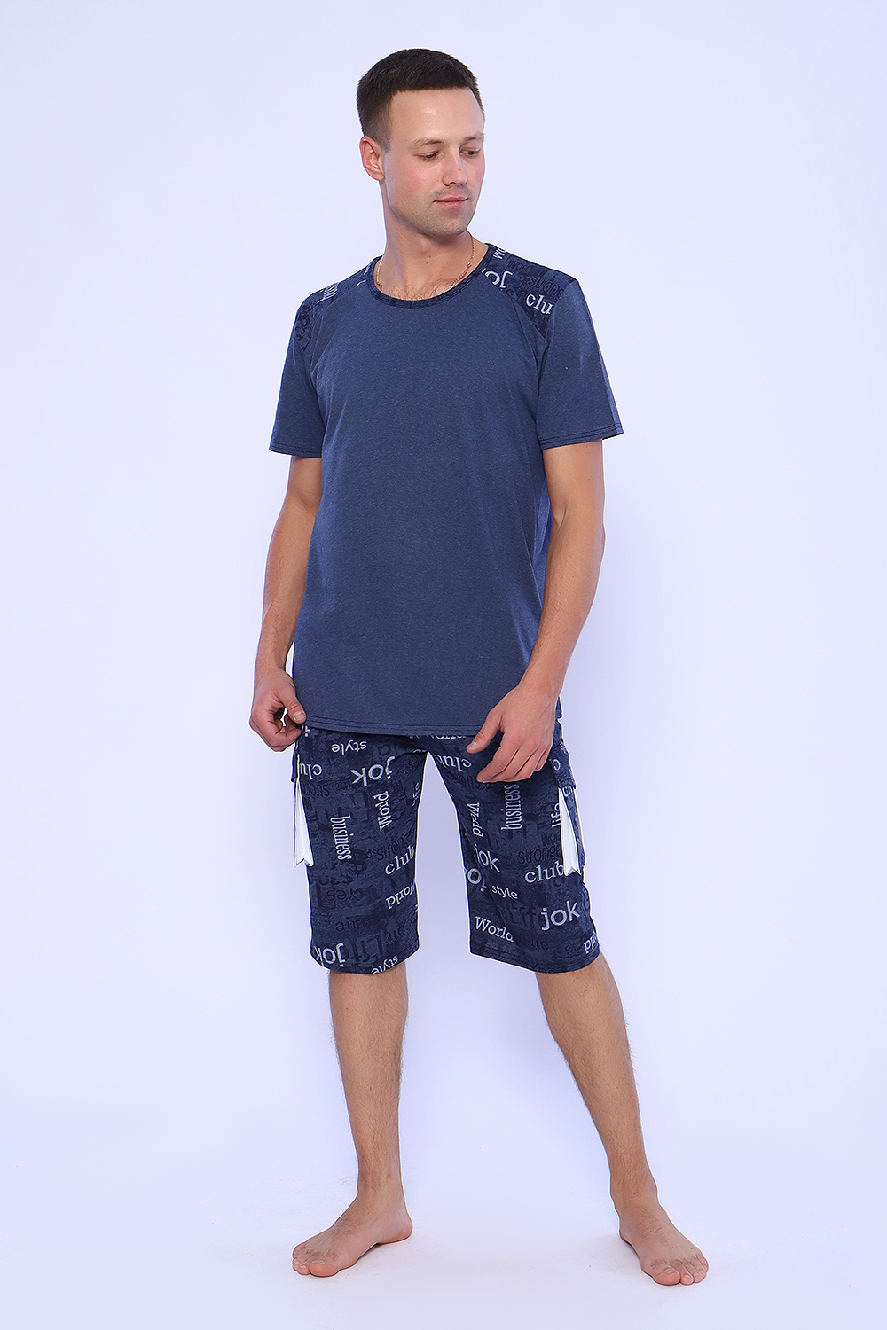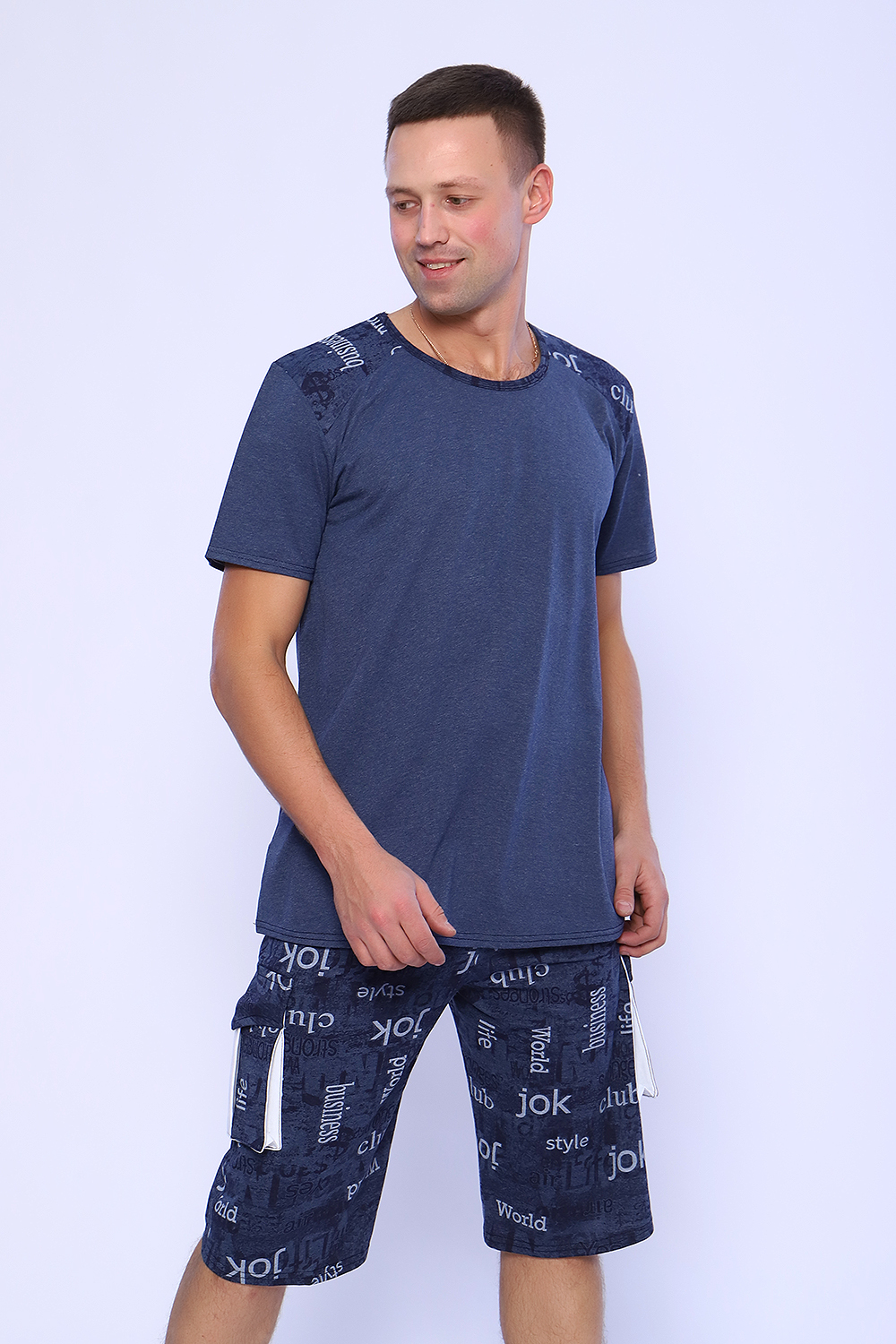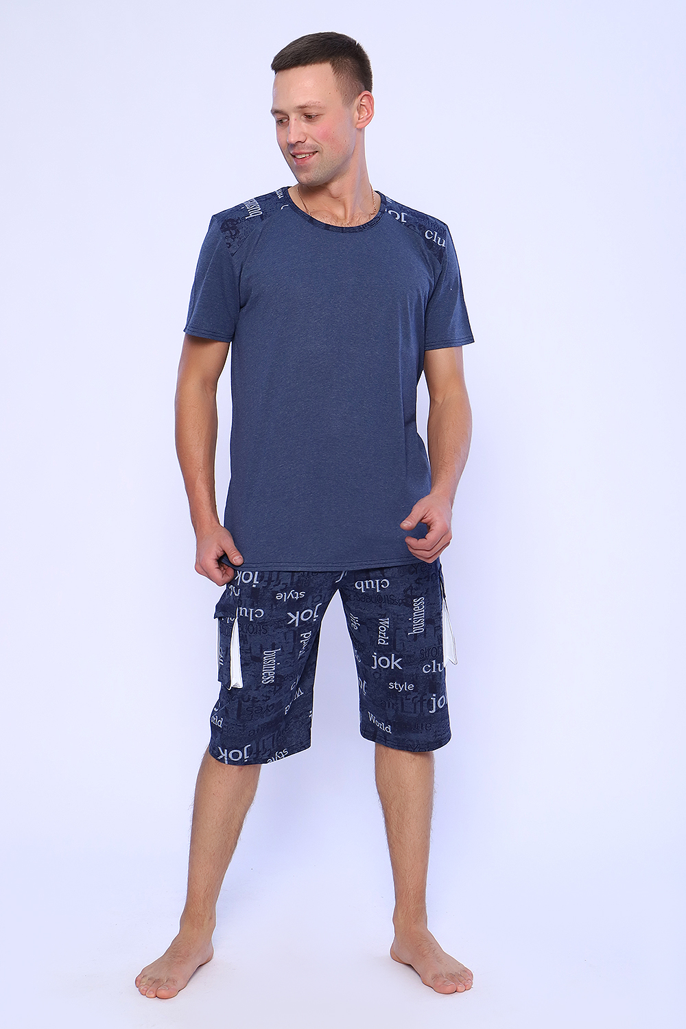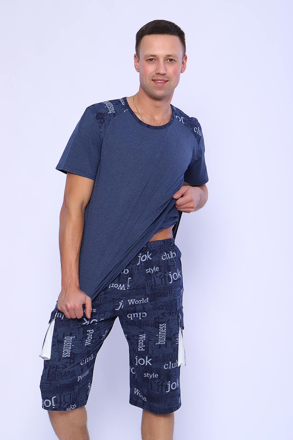 Мужской костюм состоит из футболки и бриджей. Бриджи с карманами, длина чуть ниже колена. Есть антрацит и джинс цвет, состав верх: 60% хб + 40% ПЭ; низ: 60% ХБ+ 40% ПЭ. Комплект состоит из широкого размерного ряда. Отличный и удобный вариант на каждый день.