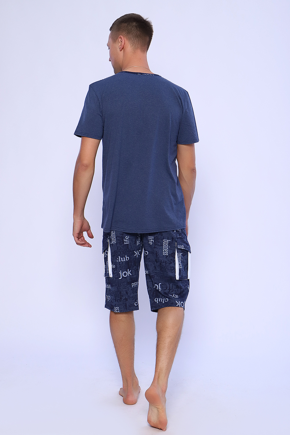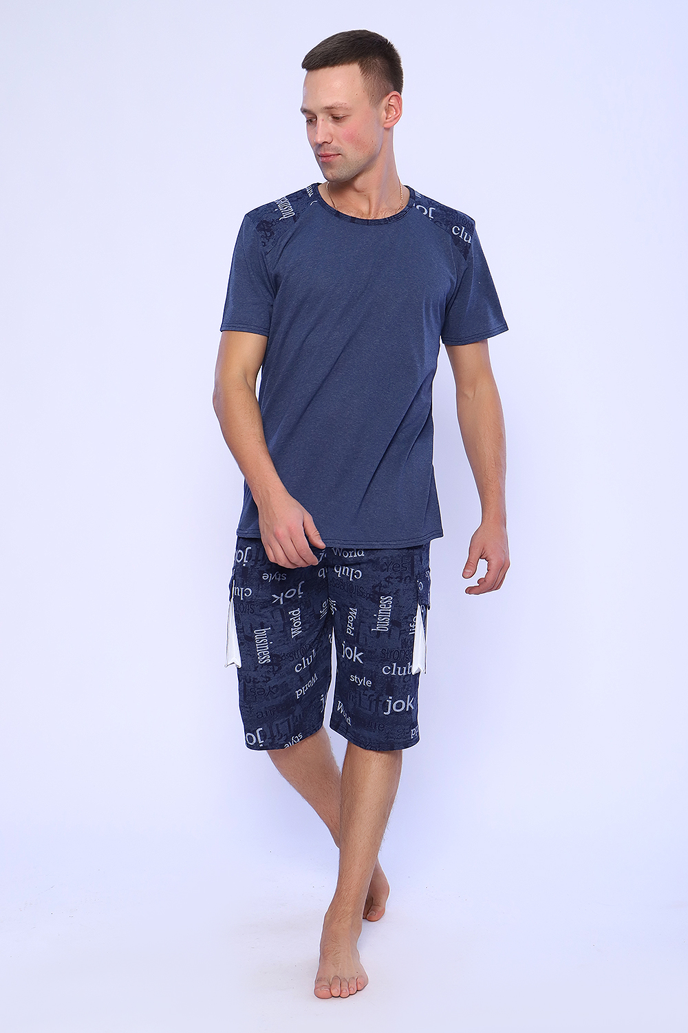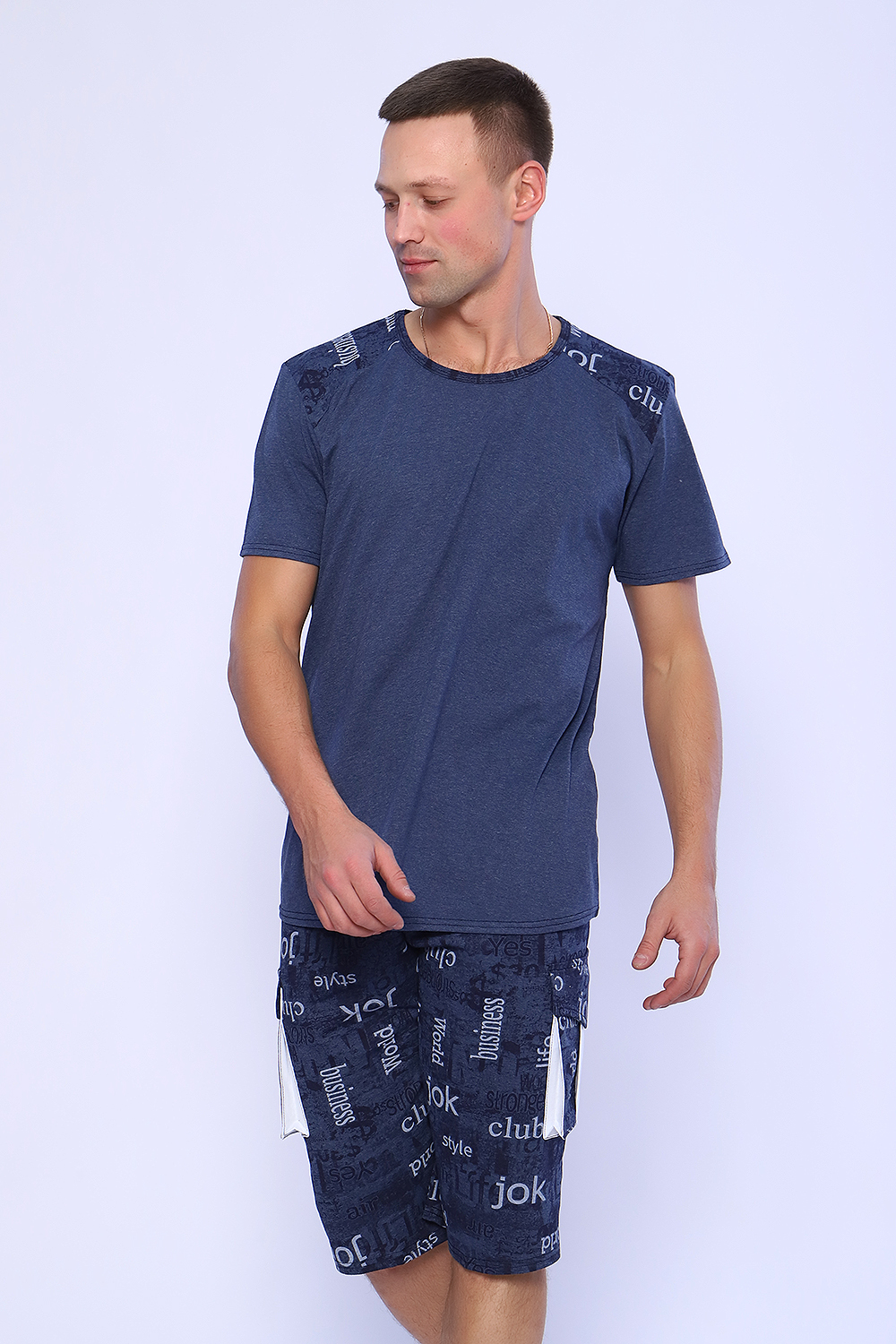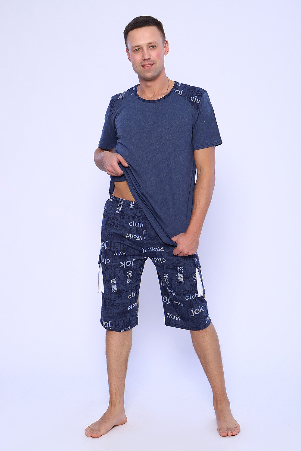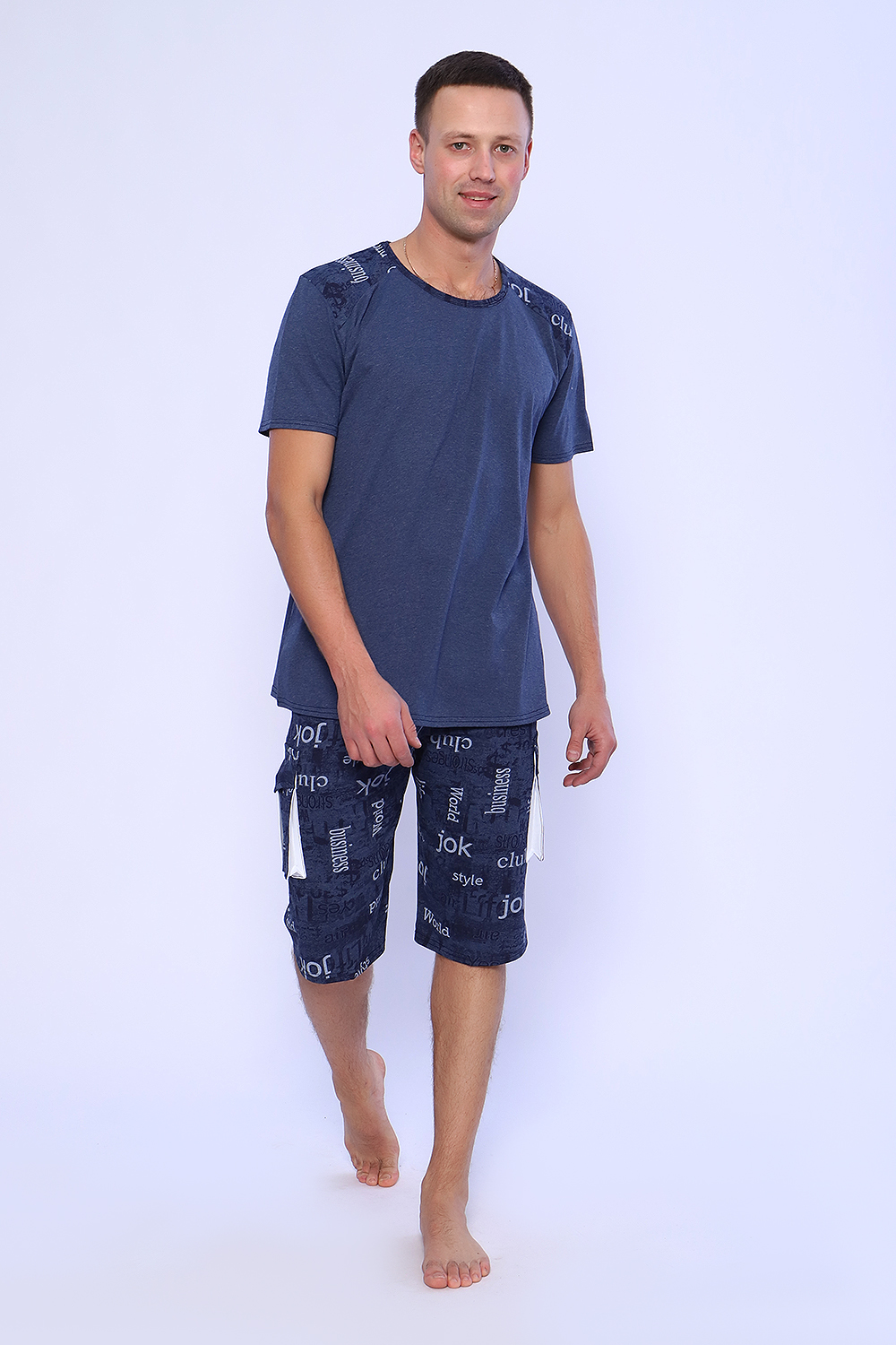 Мужской костюм состоит из футболки и бриджей. Бриджи с карманами, длина чуть ниже колена. Есть антрацит и джинс цвет, состав верх: 60% хб + 40% ПЭ; низ: 60% ХБ+ 40% ПЭ. Комплект состоит из широкого размерного ряда. Отличный и удобный вариант на каждый день.