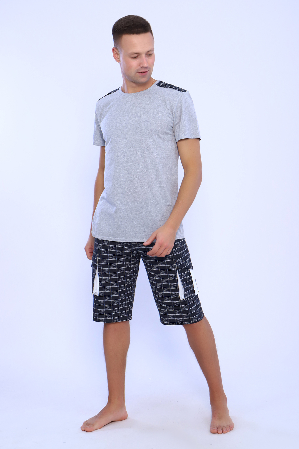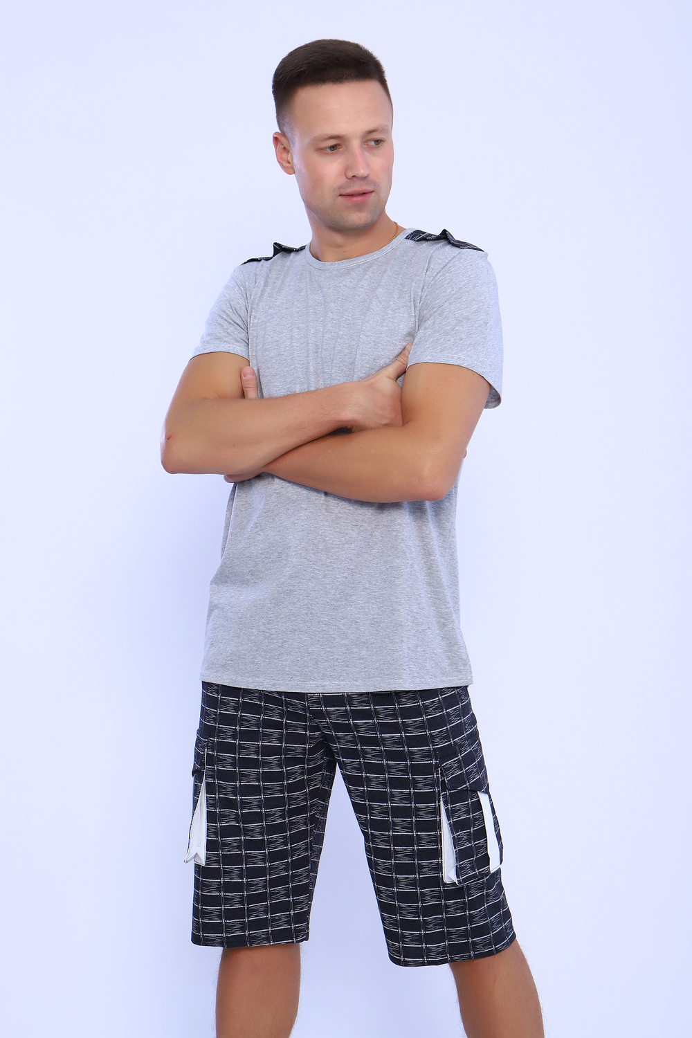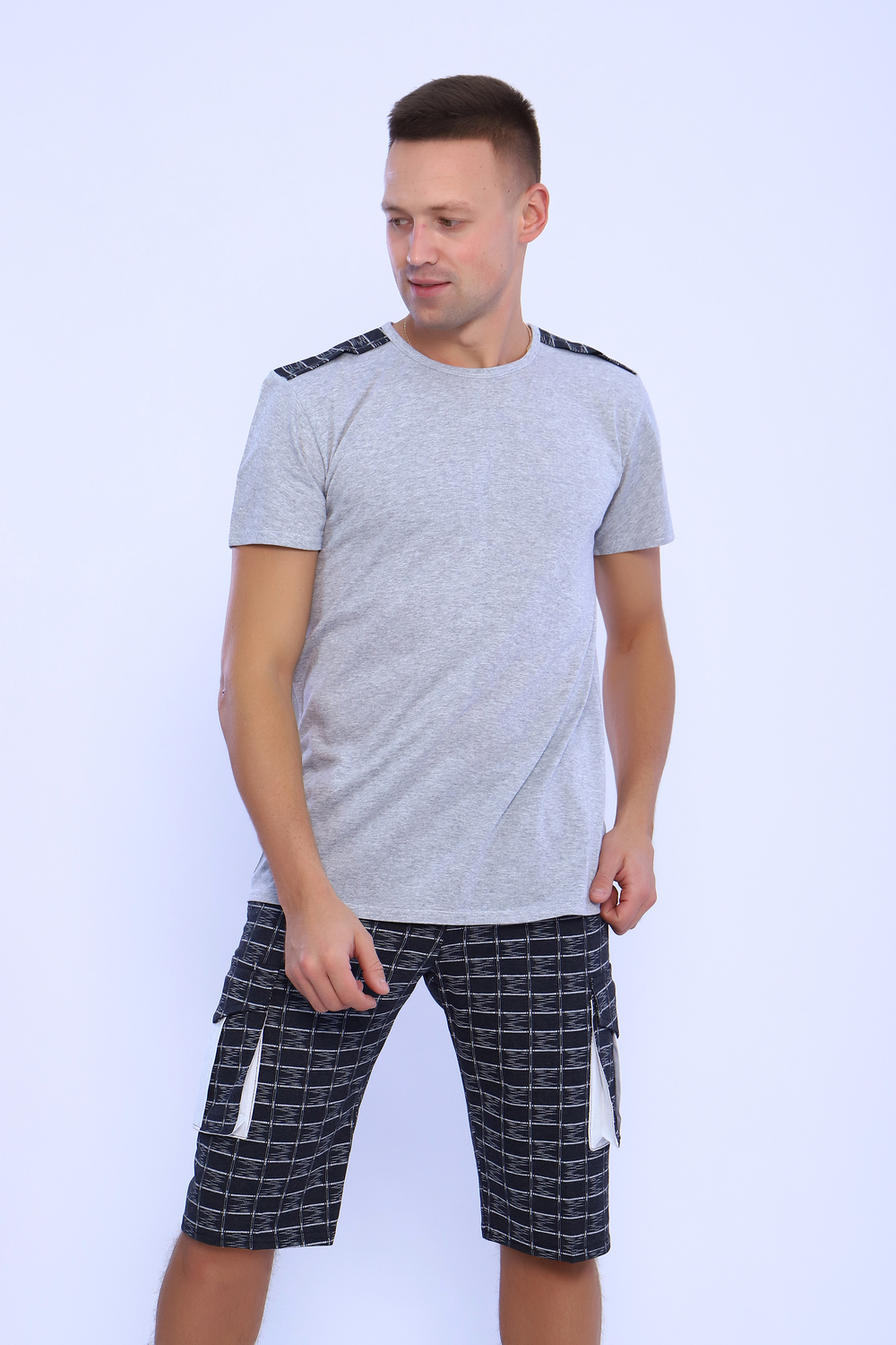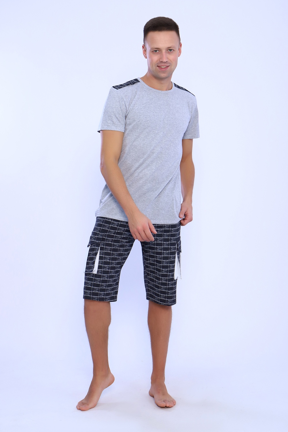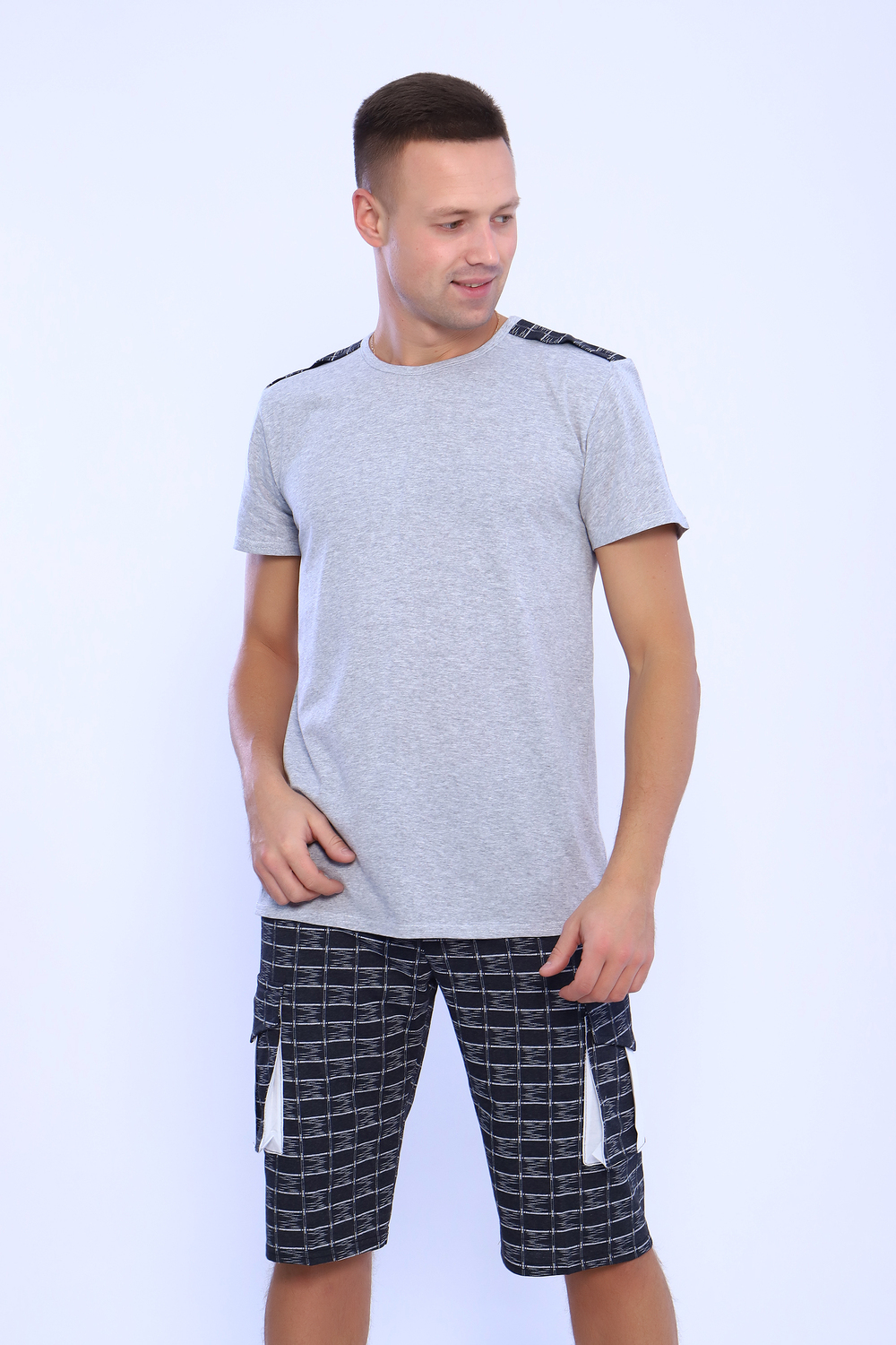 Мужской костюм состоит из футболки и бриджей. Бриджи с карманами, длина чуть ниже колена. Есть антрацит и джинс цвет, состав верх: 60% хб + 40% ПЭ; низ: 60% ХБ+ 40% ПЭ. Комплект состоит из широкого размерного ряда. Отличный и удобный вариант на каждый день.