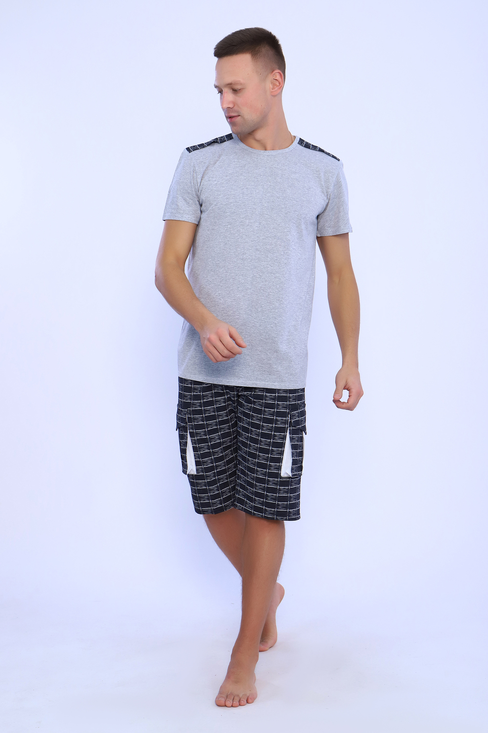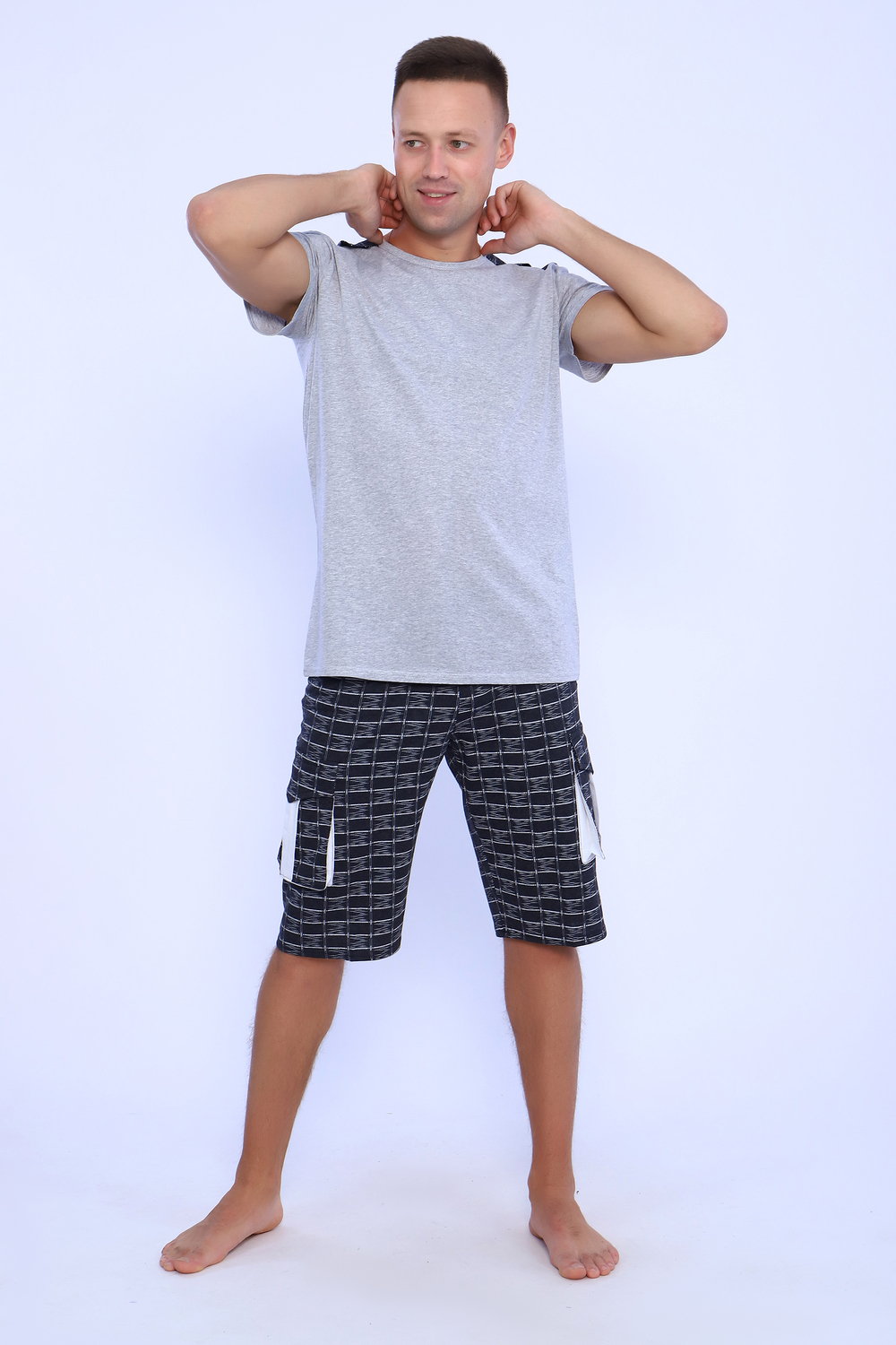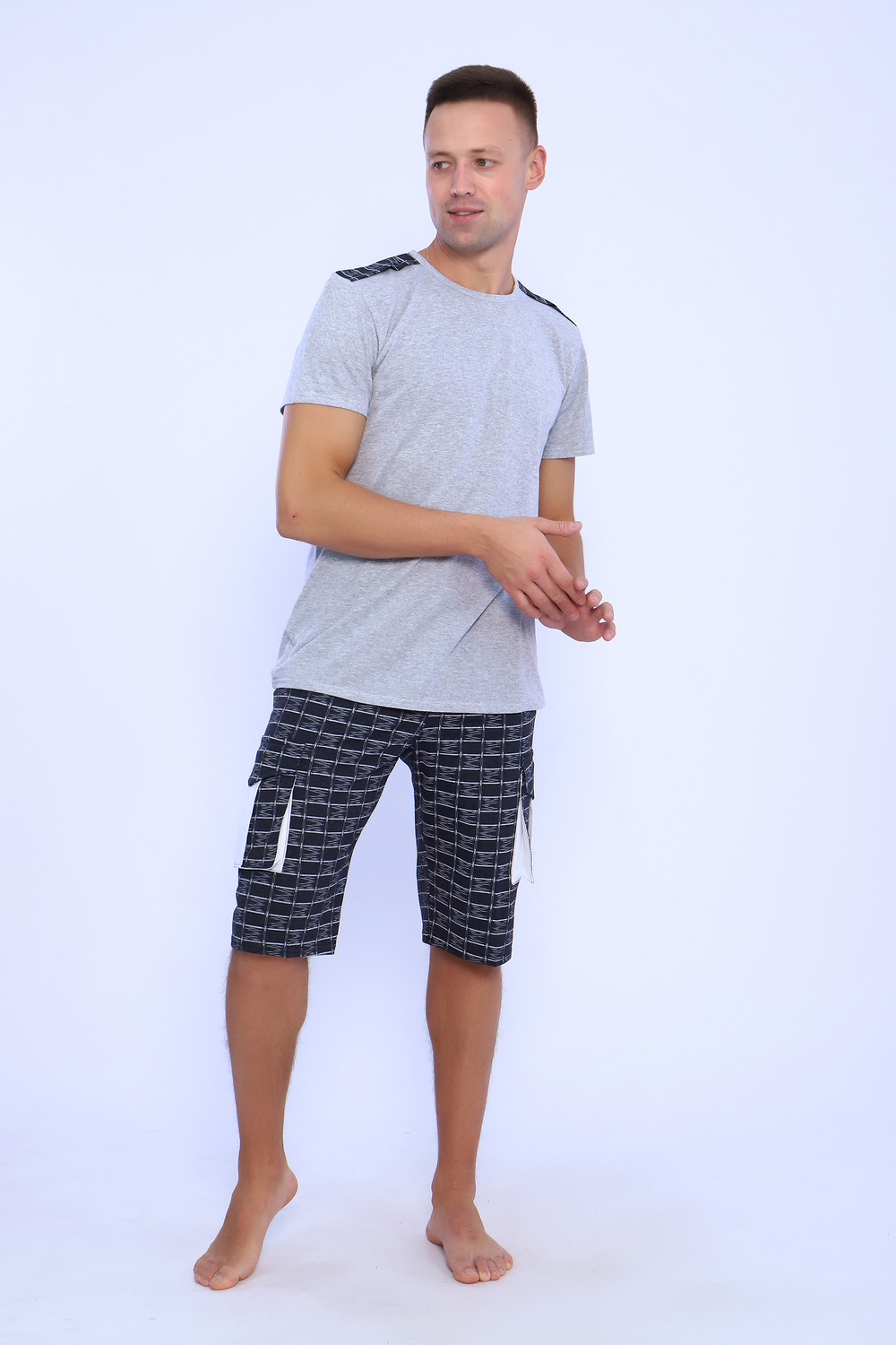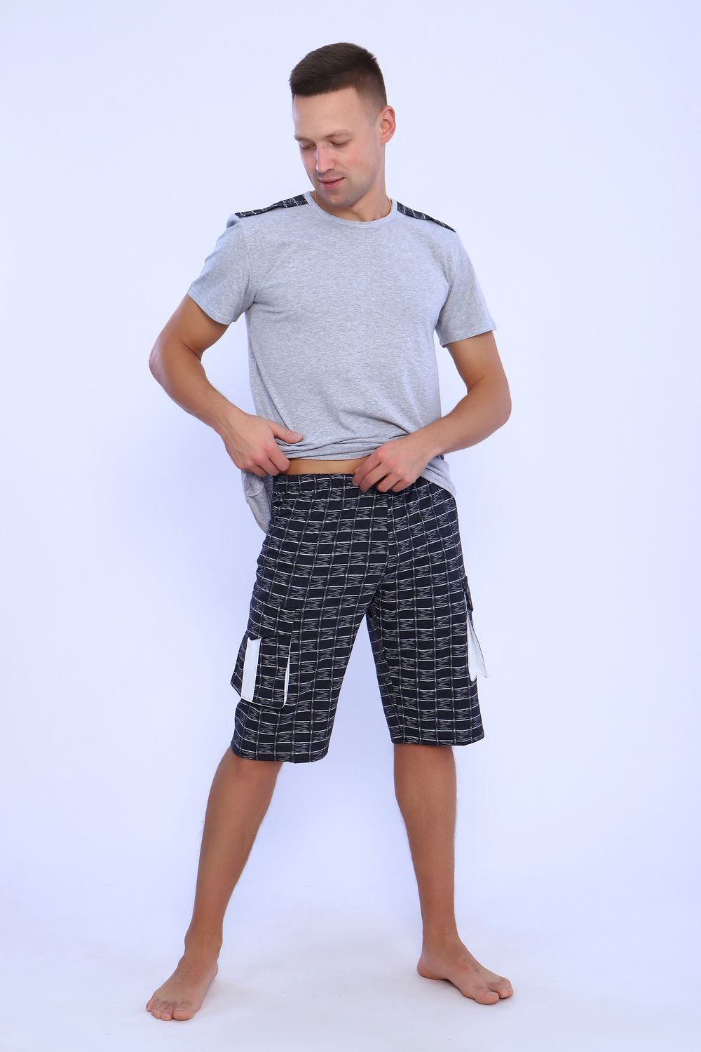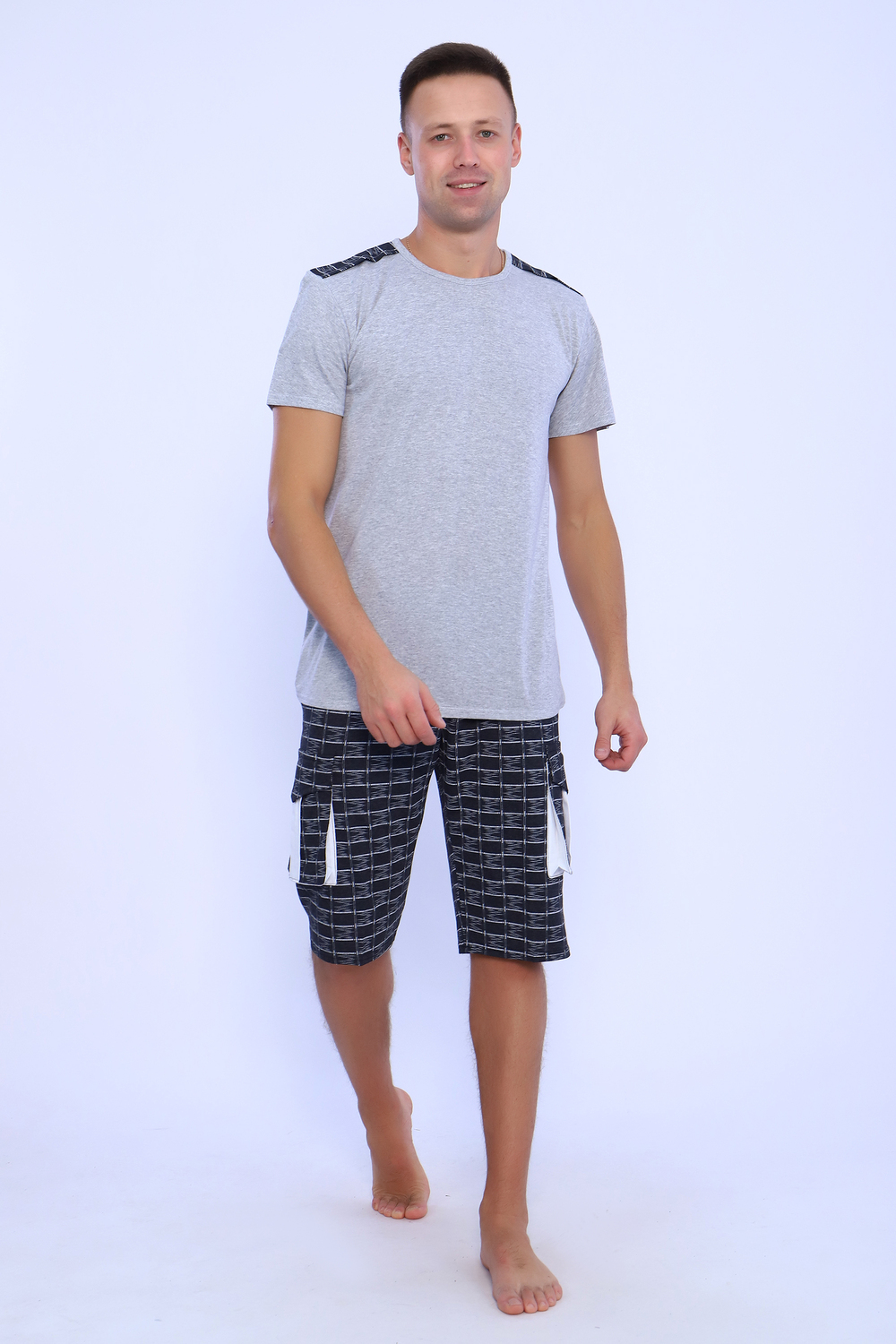 Мужской костюм состоит из футболки и бриджей. Бриджи с карманами, длина чуть ниже колена. Есть антрацит и джинс цвет, состав верх: 60% хб + 40% ПЭ; низ: 60% ХБ+ 40% ПЭ. Комплект состоит из широкого размерного ряда. Отличный и удобный вариант на каждый день.