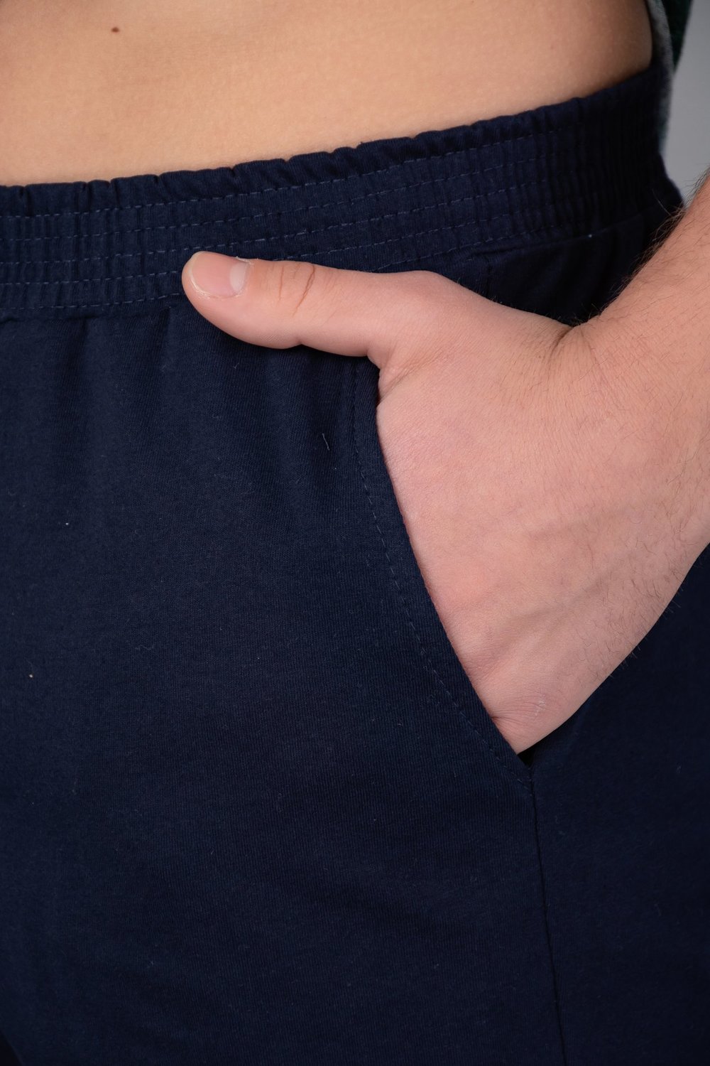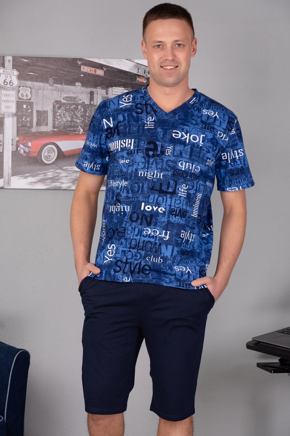 Удобный мужской костюм с шортами из натуральной хлопковой ткани. Приятен к телу и не стесняет движений. Футболка прямого кроя с V-образным вырезом. Шорты средней длинны с боковыми карманами. Пояс изготовлен на поясной машине.