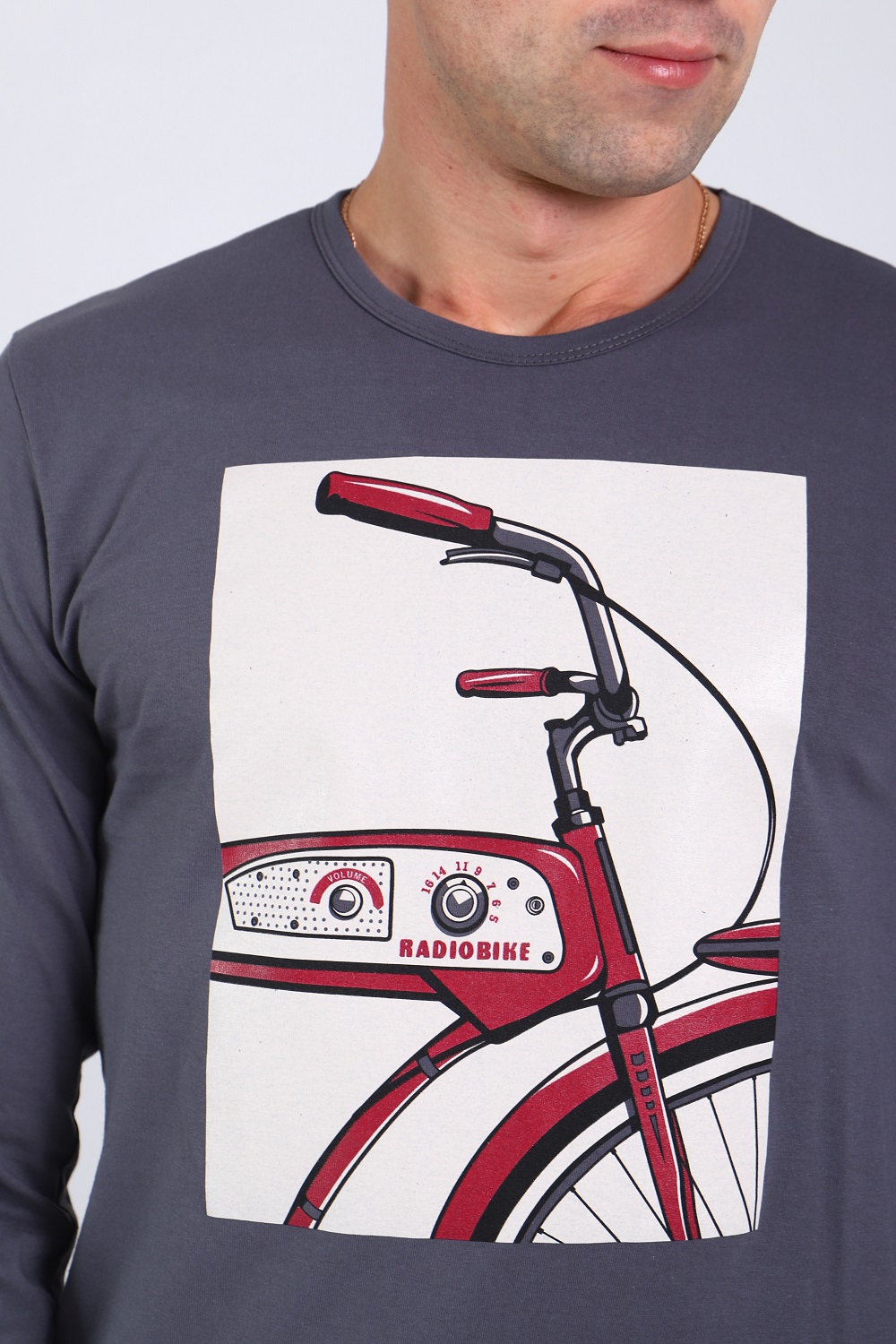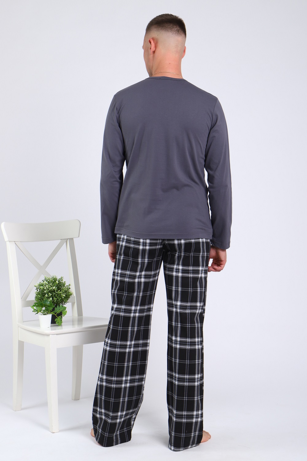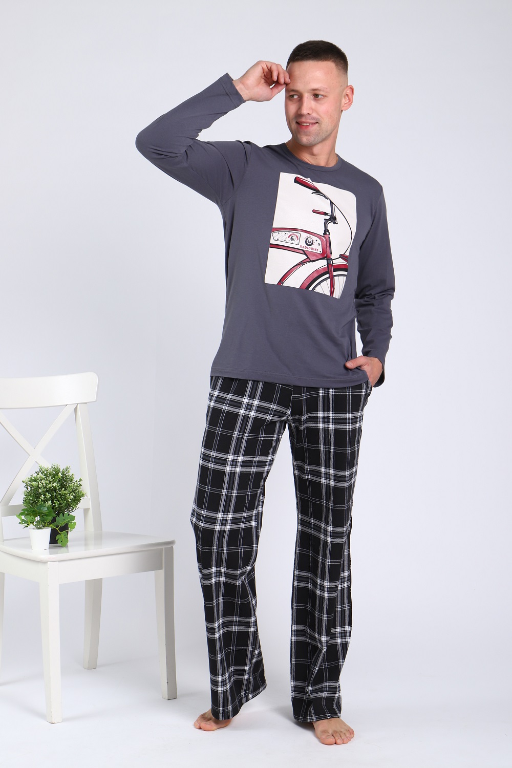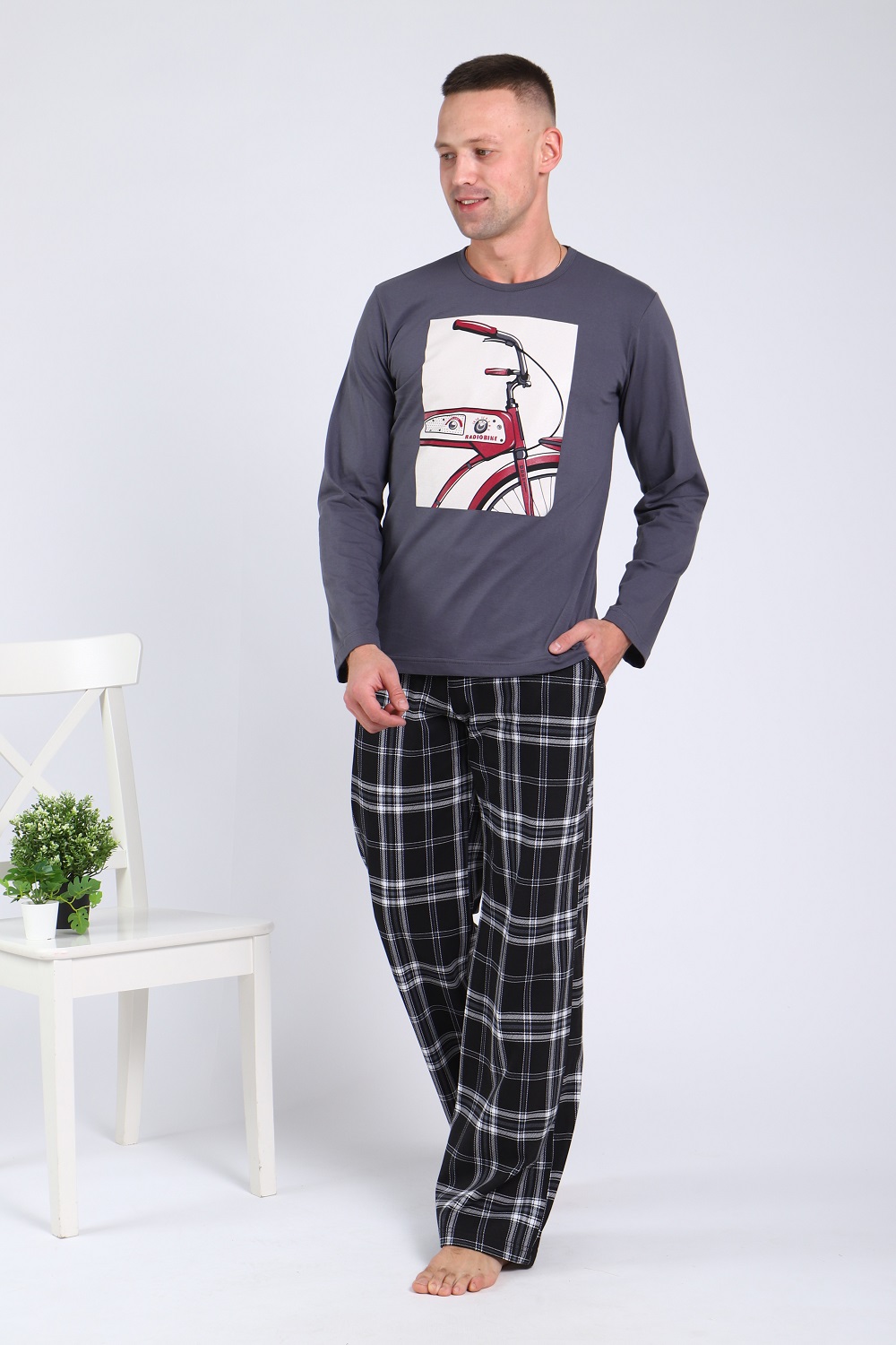Костюм мужской: брюки кроя с боковыми карманами, на широком эластичном поясе и лонгслив с длинными рукавами и с печатью на полочке.
