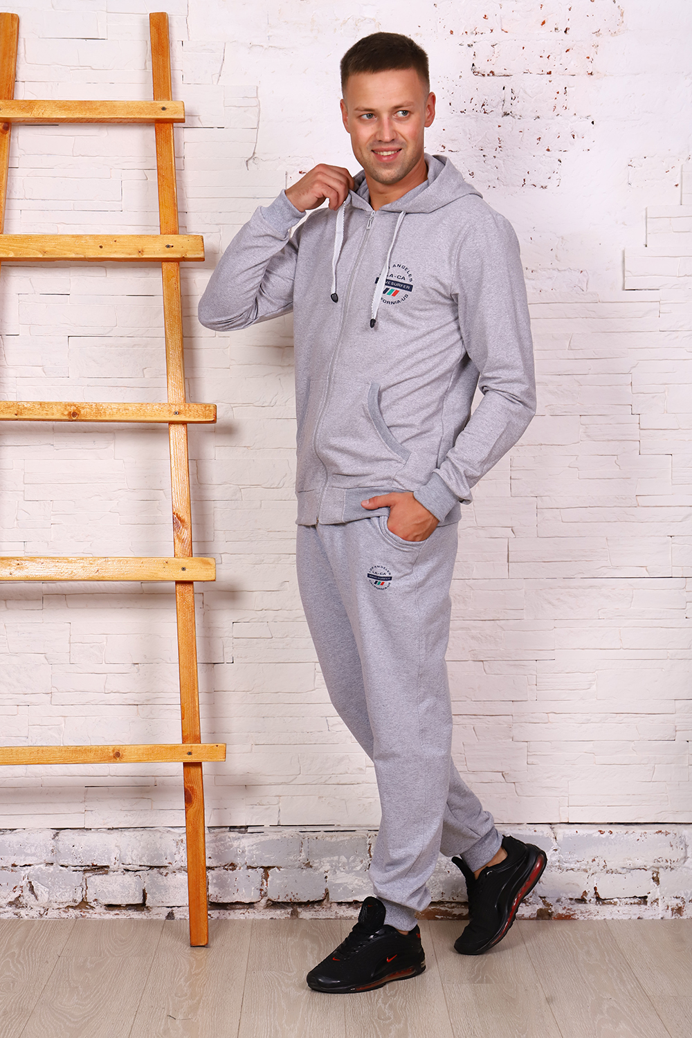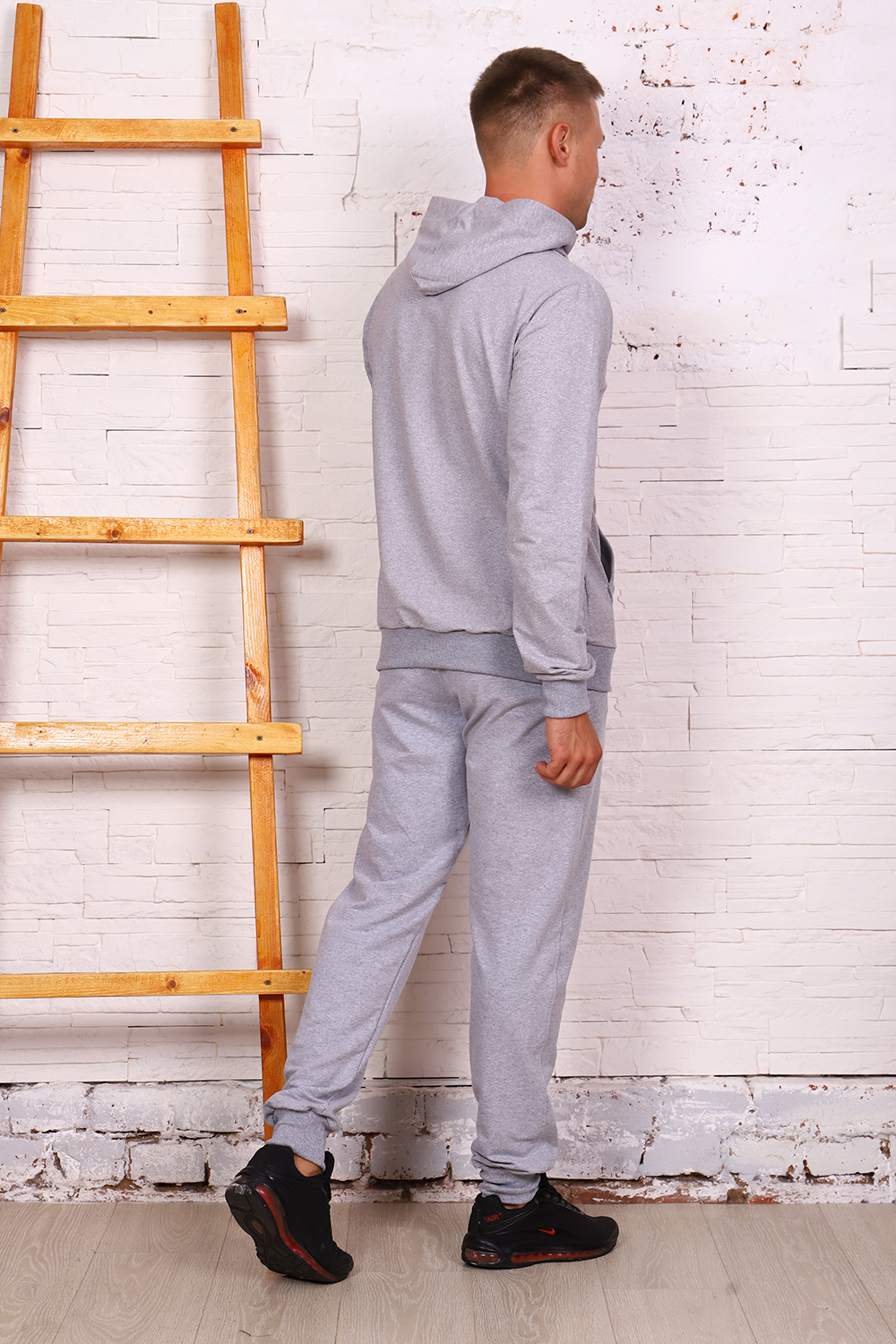 Мужской костюм толстовка+брюки. Толстовка с капюшоном, застегивается на молнию, на полочке карманы - кенгуру, рукава и низ отделаны манжетами. Брюки с карманами, внизу манжеты.