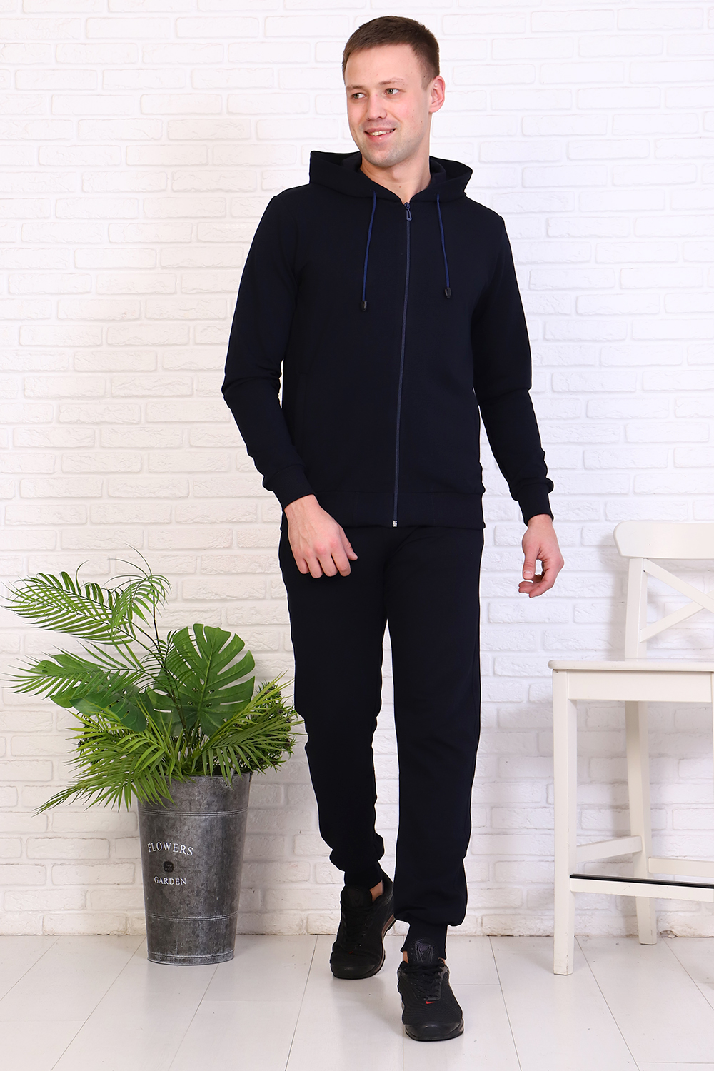 Костюм куртка на молнии с капюшоном и брюки. Рукава и низ куртки обработаны манжетами. Куртка и брюки имеют карманы на молнии.