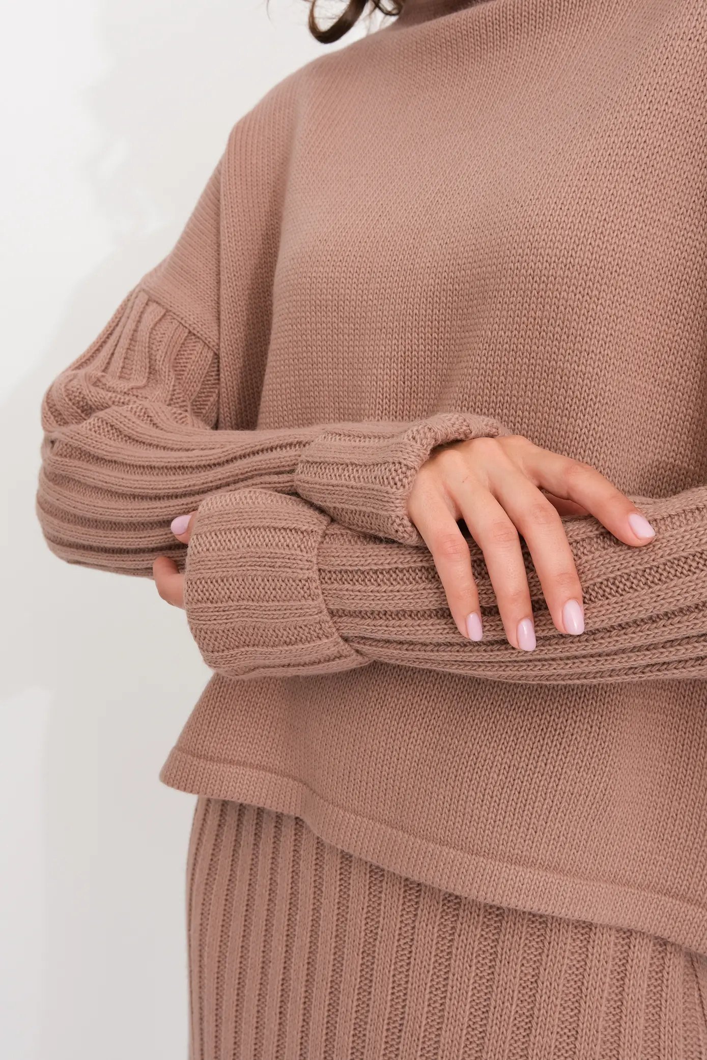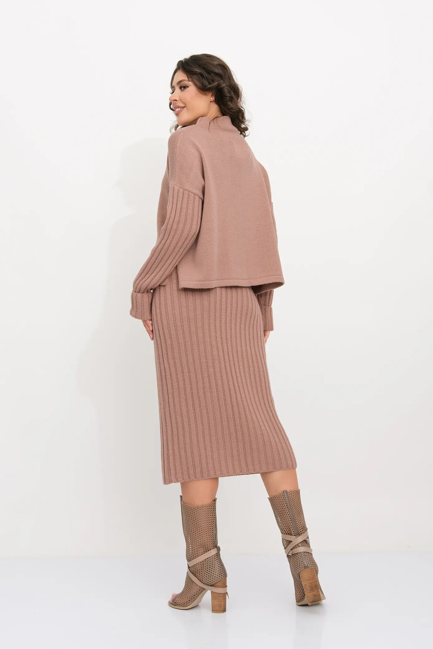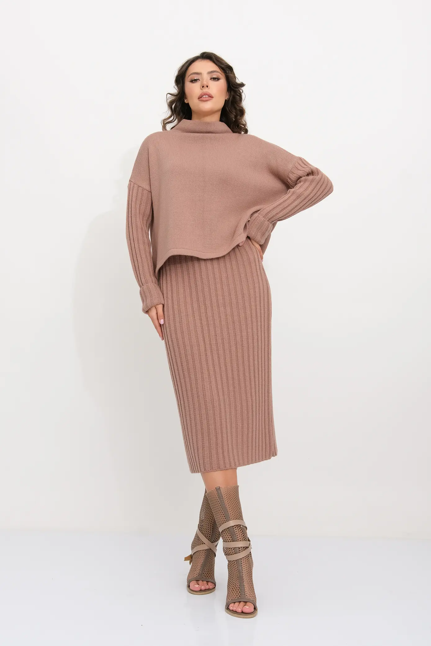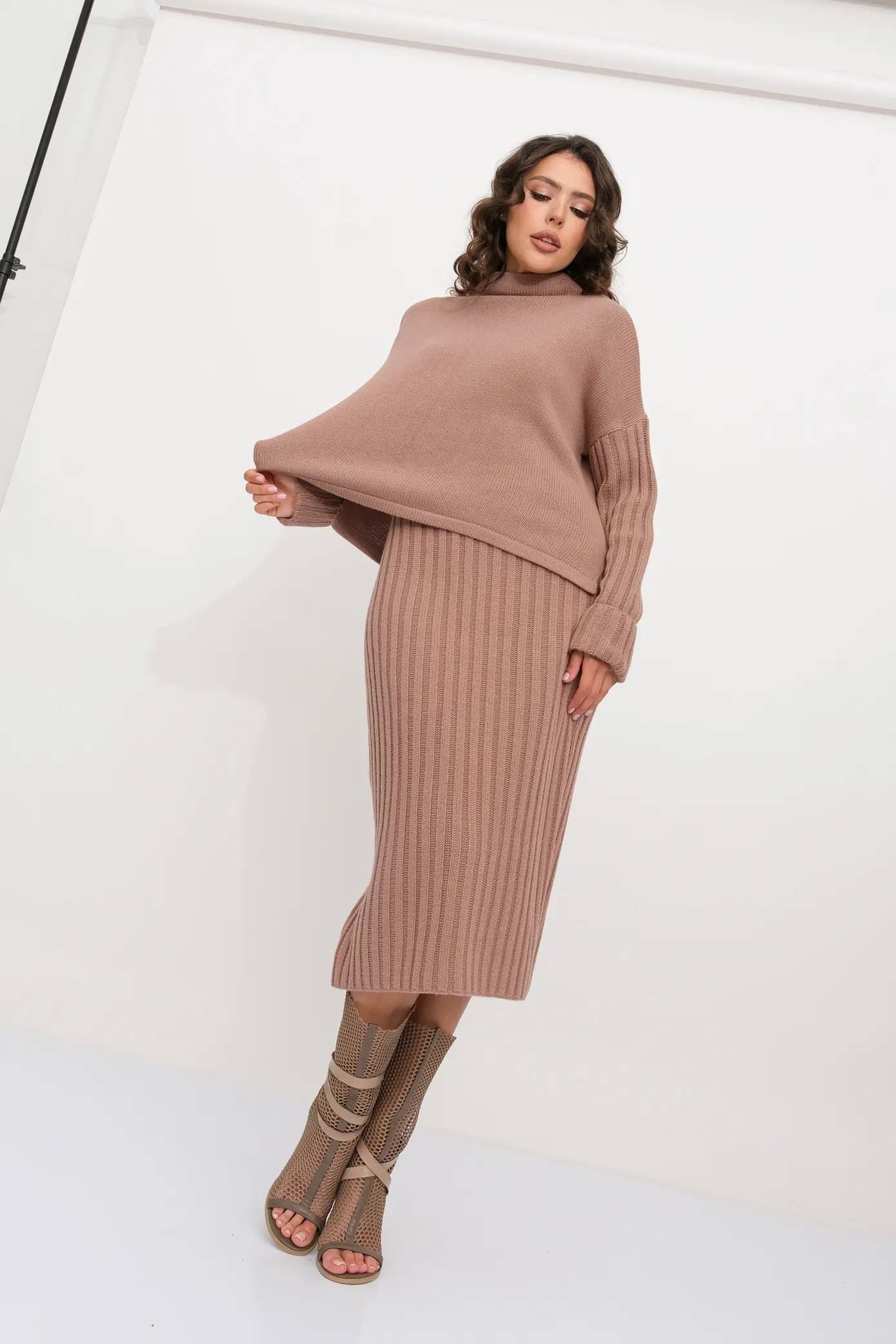 Вязаный женский комплект включает в себя две важные детали: свитер с горлом и юбку на резинке. Свободный джемпер с горлом и длинным рукавом. Юбка-лапша прямого силуэта. Вязаный костюм - идеальный вариант для модных женщин, которые хотят выглядеть стильно и элегантно. Юбочный ансамбль выполнен в стильном оверсайз дизайне, который добавляет образу шарма и элегантности. Женский костюм с юбкой подходит для разных ситуаций и событий. Независимо от того, идете вы на деловую встречу, на работу или на свидание, вы всегда будете привлекать внимание и оставлять яркое впечатление. Будьте в центре внимания с этим комплектом. Костюм выполнен из качественной пряжи с содержанием шерсти, что обеспечивает комфортную посадку и приятные ощущения при ношении. Юбка-лапша и свободный свитер с горлом и длинным рукавом придает образу изысканность и строгость. Вы будете выглядеть профессионально и стильно, не потеряв при этом своего женственного обаяния.