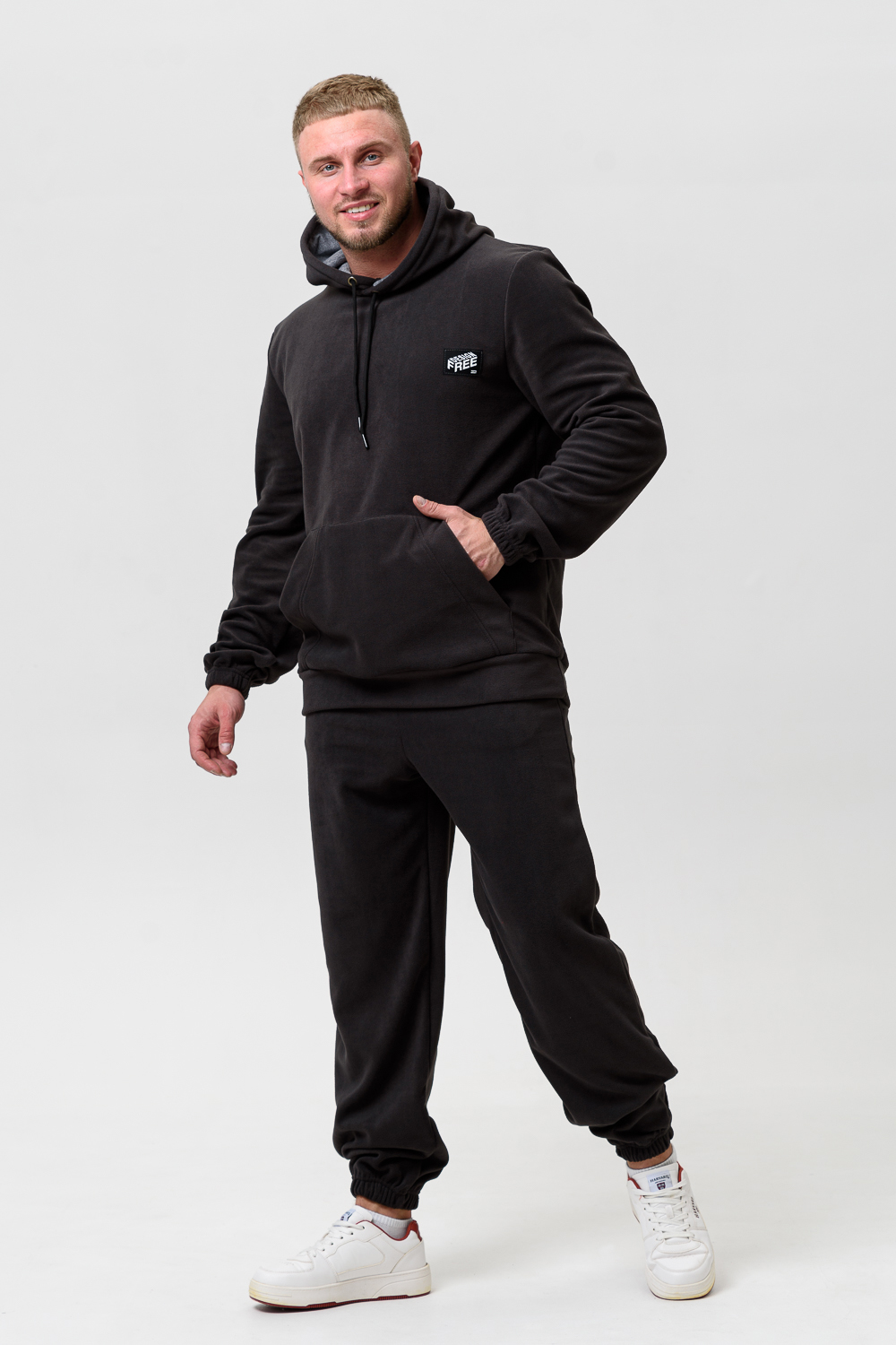 Костюм унисекс из флиса с брюками и худи. Худи с карманом кенгуру, капюшон со шнурком, нашивка в области груди. Брюки внизу на резинке, карманы в боках, нашивка под карманом. Костюм идеально подойдет для прогулок и отдыха. Размеры сдвоенные, 46-48, 50-52, 54-56.