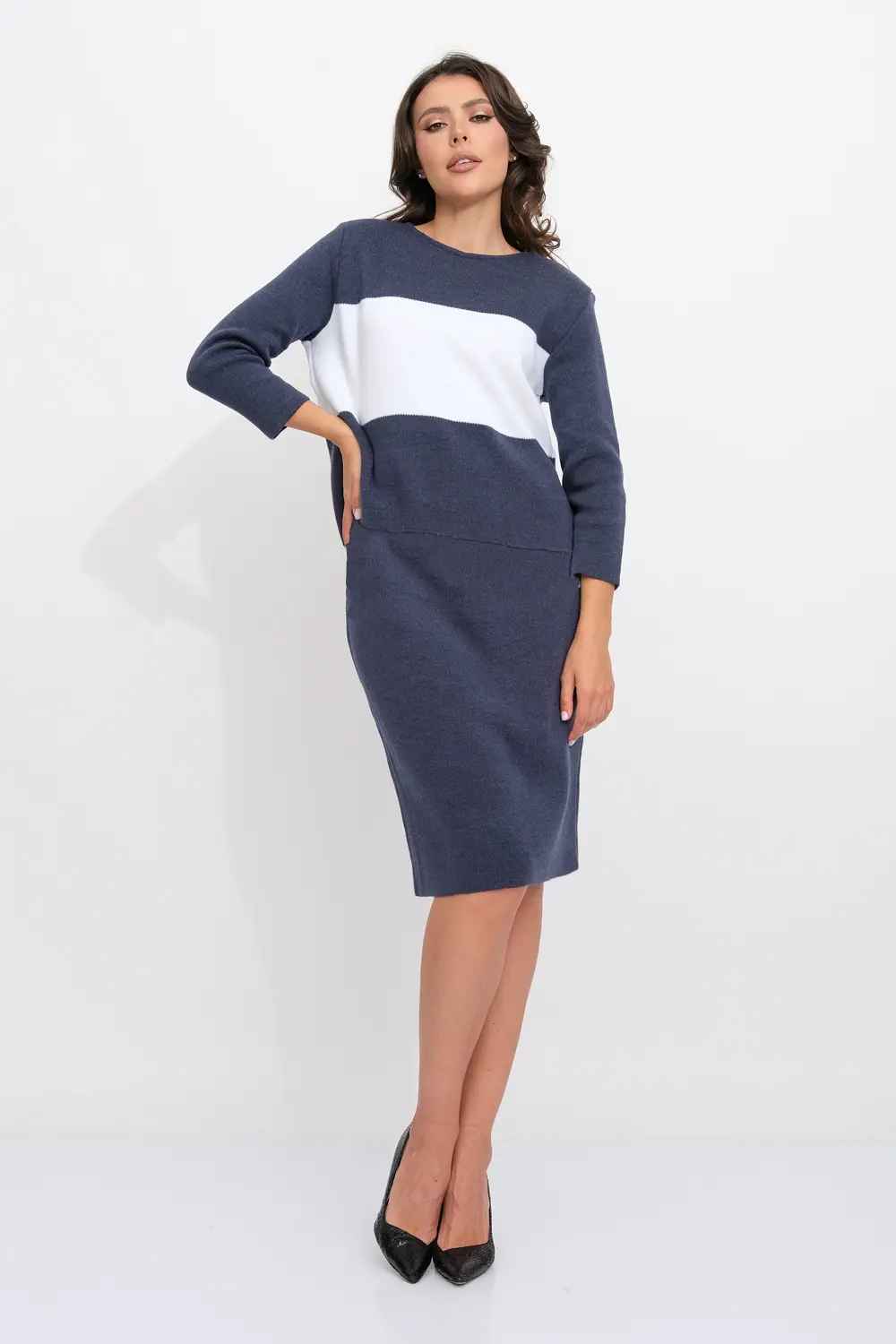 Костюм состоит из джемпера и юбки. Джемпер свободного силуэта с круглой горловиной. Рукава втачные длиной 7/8.