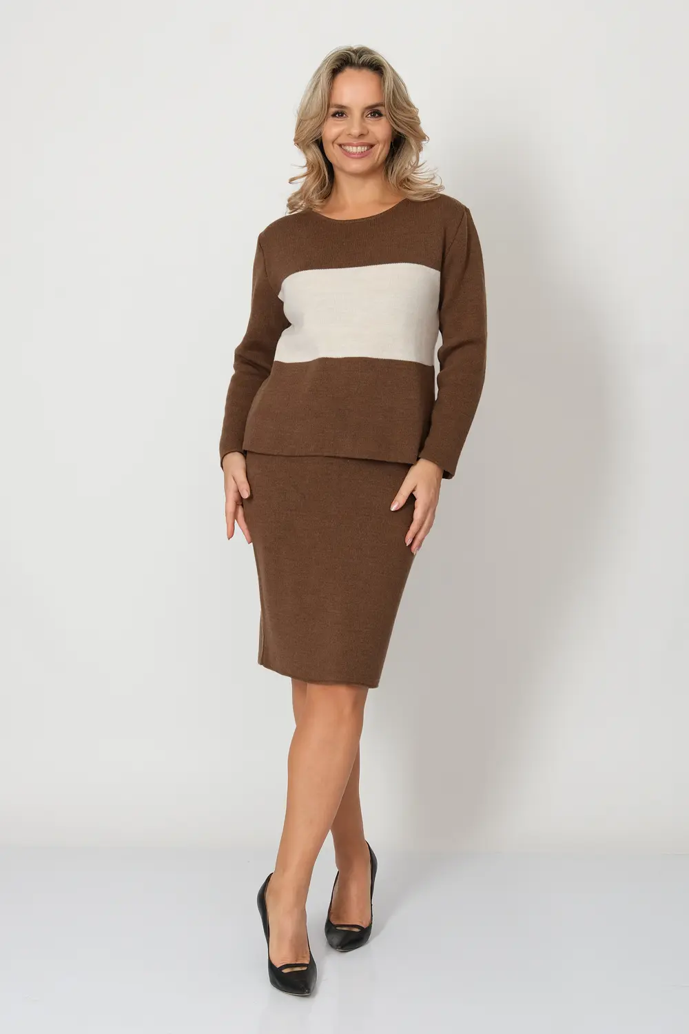 Юбка-карандаш длиной чуть ниже колена. Костюм выполнен из полушерстяной пряжи, он отлично согреет вас в прохладное время года.