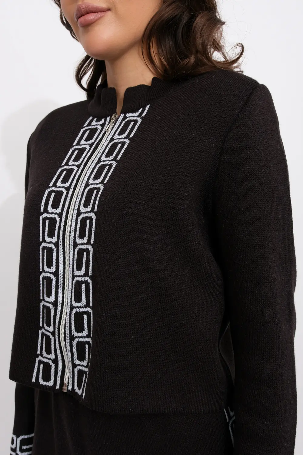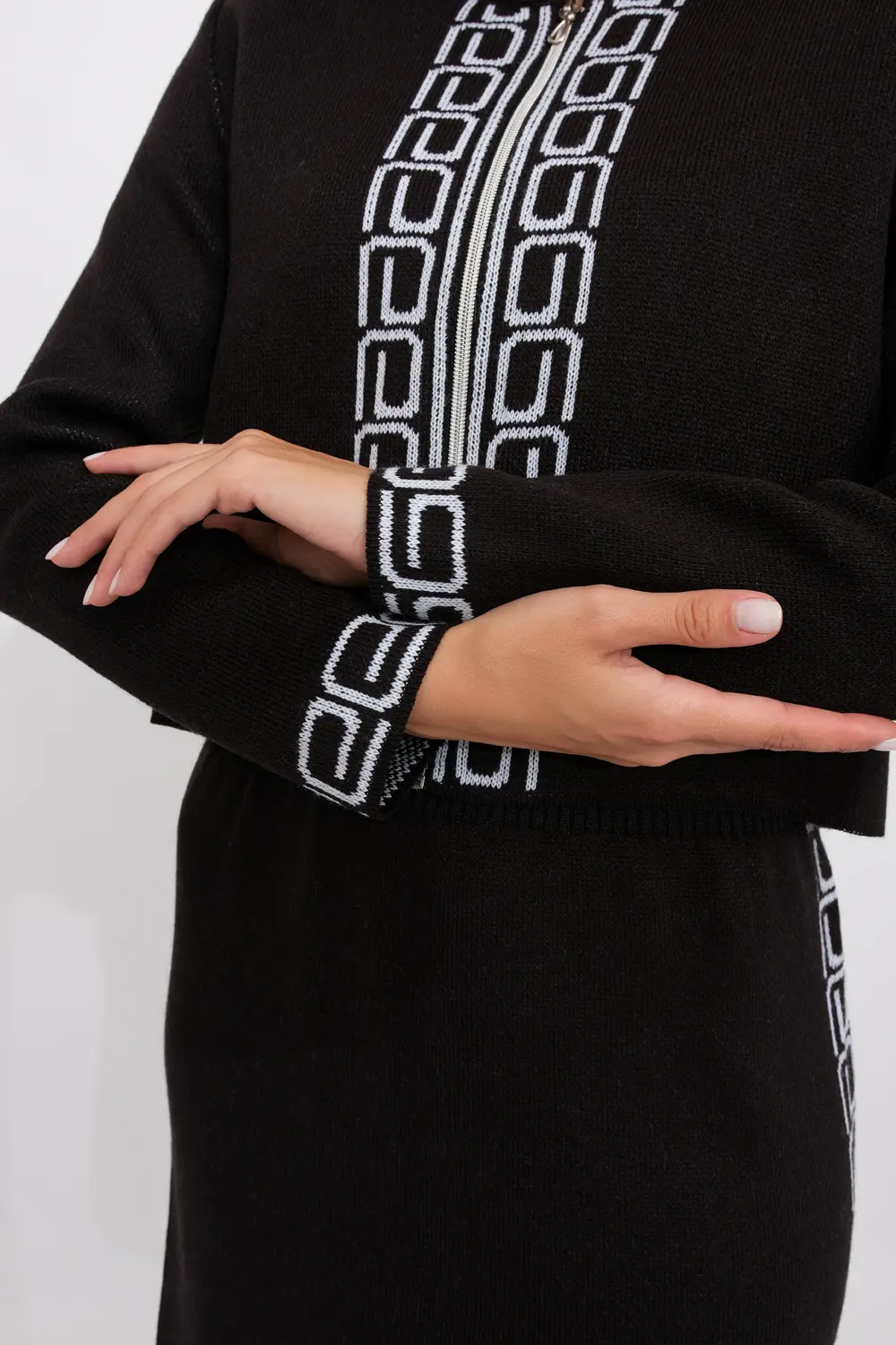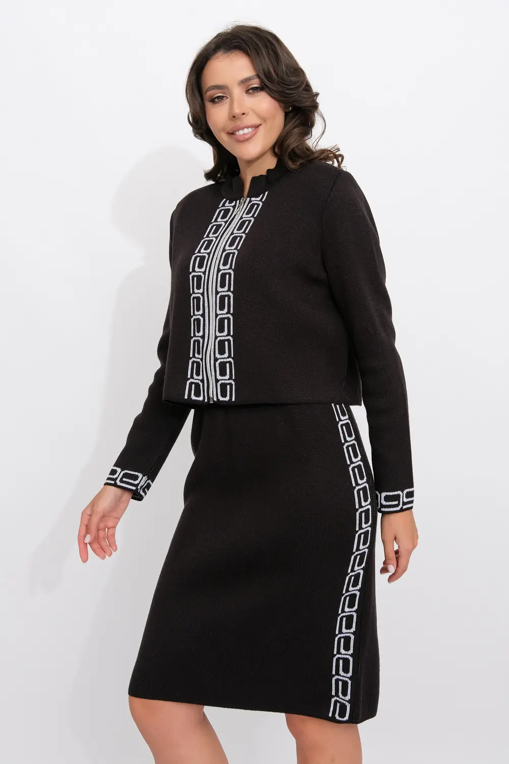 Женский трикотажный костюм, состоящий из жакета и платья с красивым греческим узором. Жакет с круглой горловиной и небольшим воротом-стойкой, застегивается на молнию. Платье длиной 100см с коротким рукавом, жакет укороченный 52см.