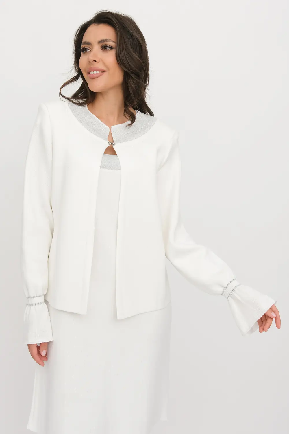 Очень нарядный трикотажный костюм, состоящий из жакета и платья. Жакет с круглой горловиной застегивается на декоративный крючок. Платье длиной 100см с коротким рукавом, жакет 58см. По горловине жакета и платья проходит декоративная полоса с люрексом. Манжет жакета связан элегантным фонариком.