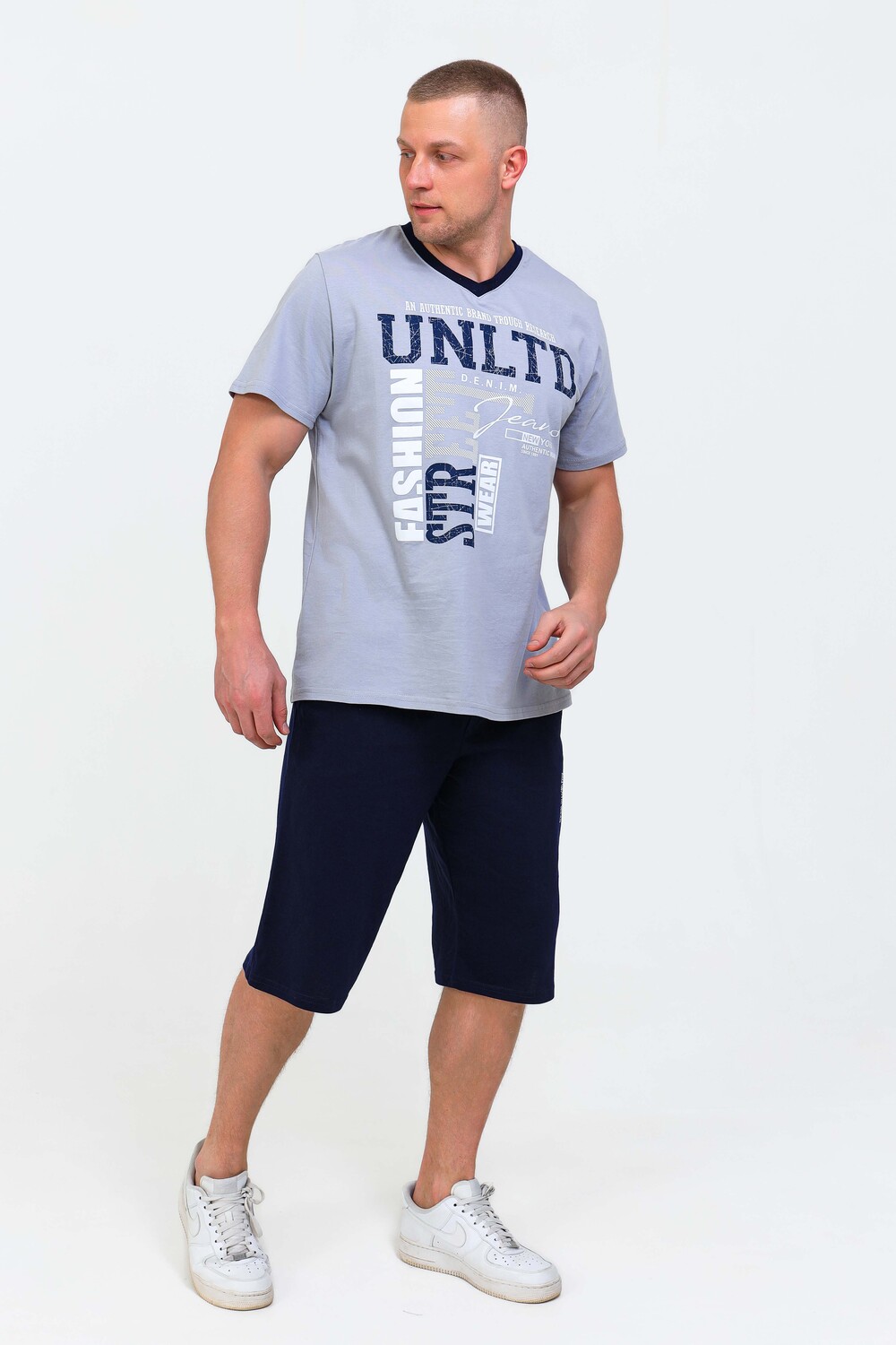 Домашний костюм футболка с бриджами. Футболка с оригинальным принтом, V - образный вырез, короткий втачной рукав. Бриджи с карманами, длина до коленей. Покрой изделия обеспечивает свободу движения, а материалы прекрасно пропускают воздух и очень приятны к телу.