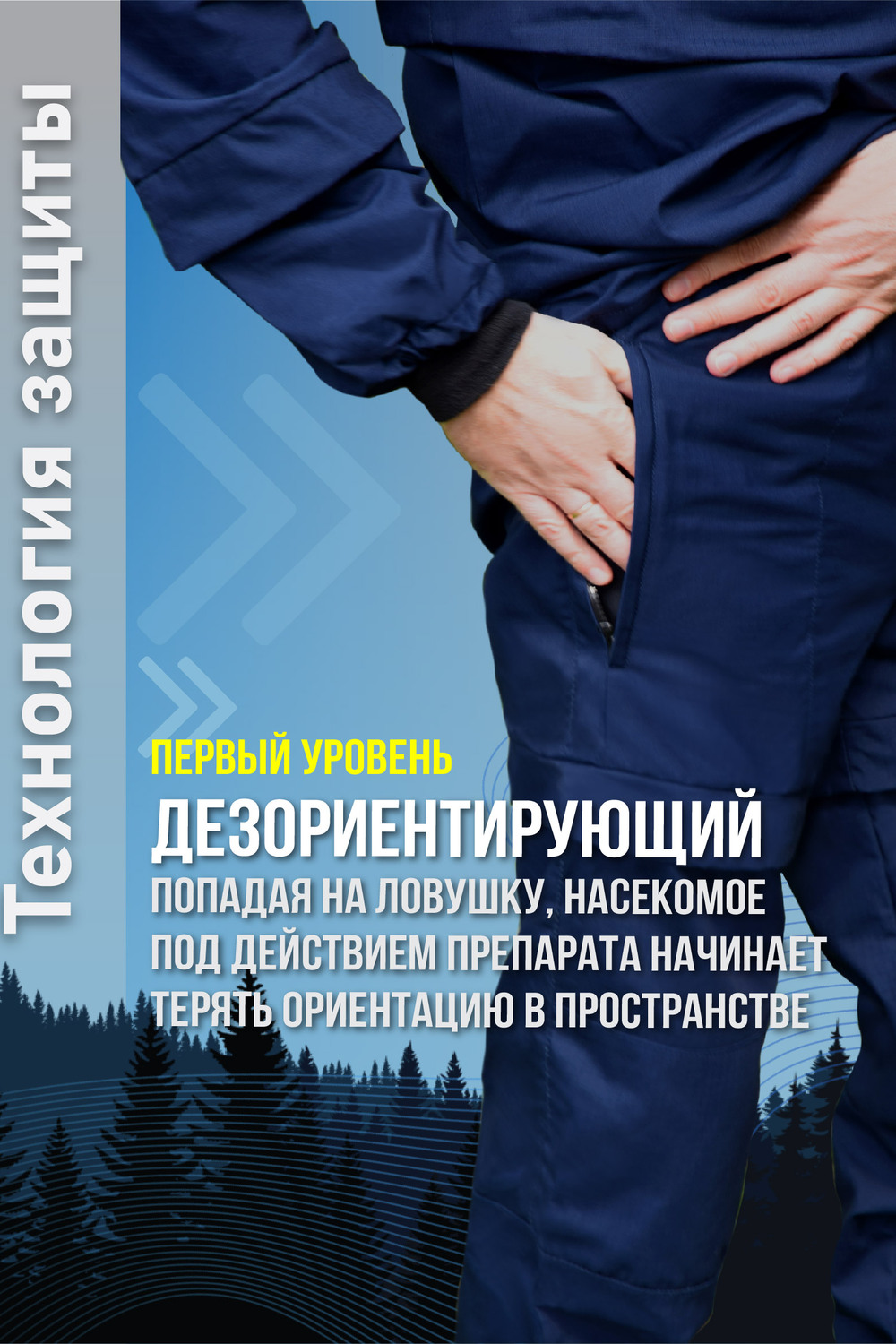 Основная особенность костюма в том, что он имеет не только физические параметры защиты (строение костюма), но и акарицидно-репеллентную обработку. Поэтому костюм оказывает отпугивающее действие, дизориентирующее для летающих насекомых и смертельное для клеща. При этом, химические свойства сохраняются после нескольких стирок и не вредят окружающей среде.