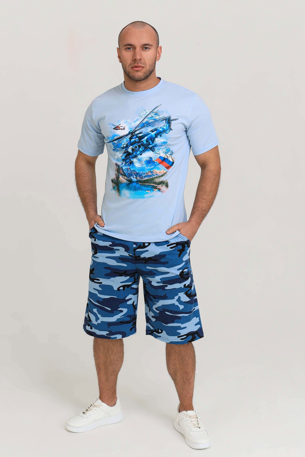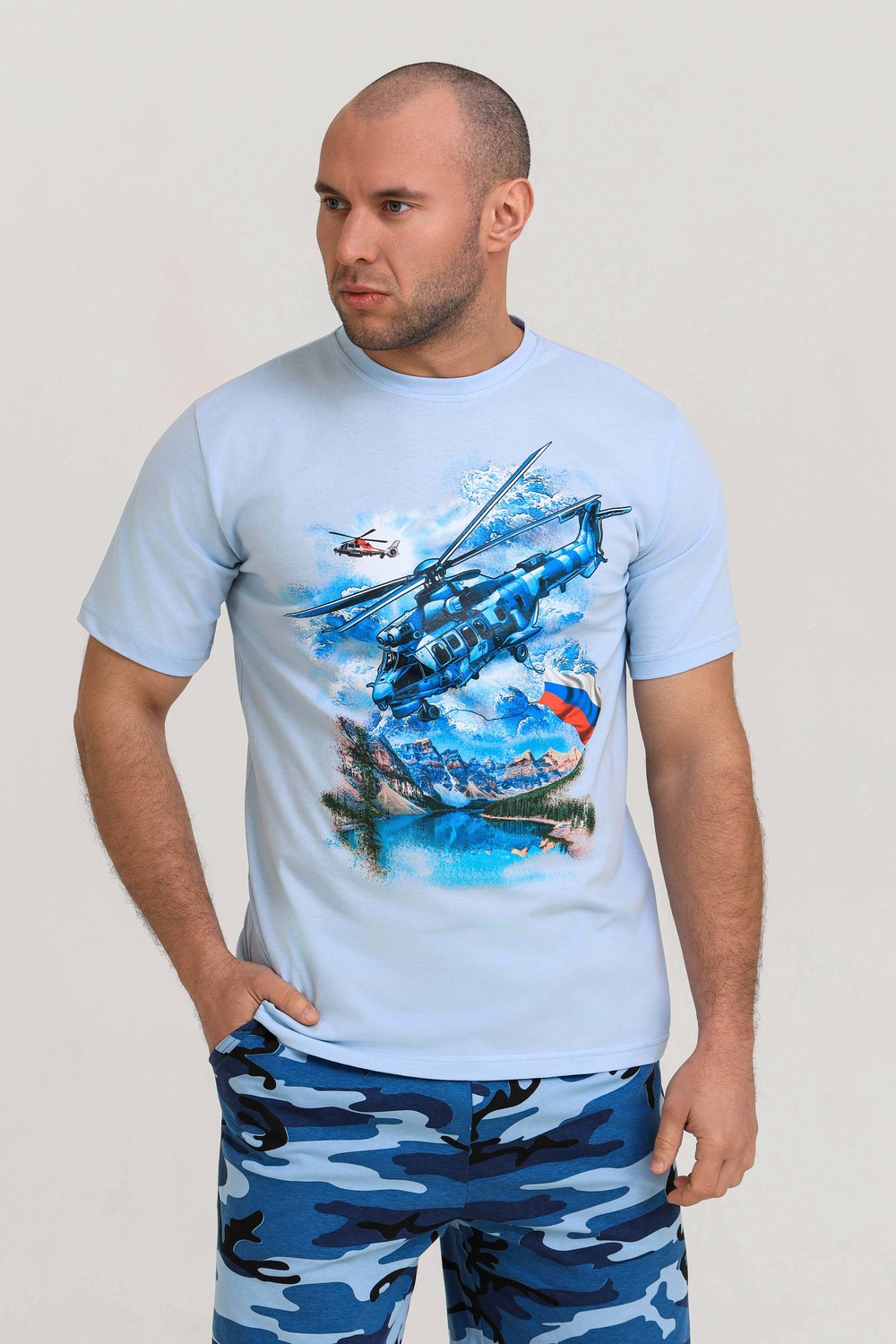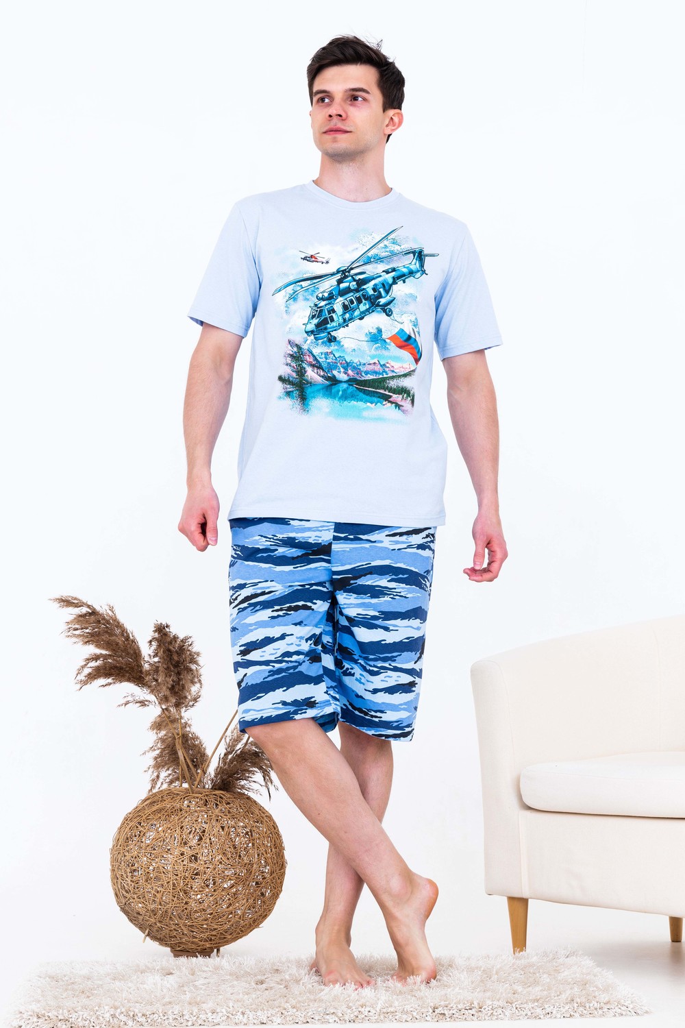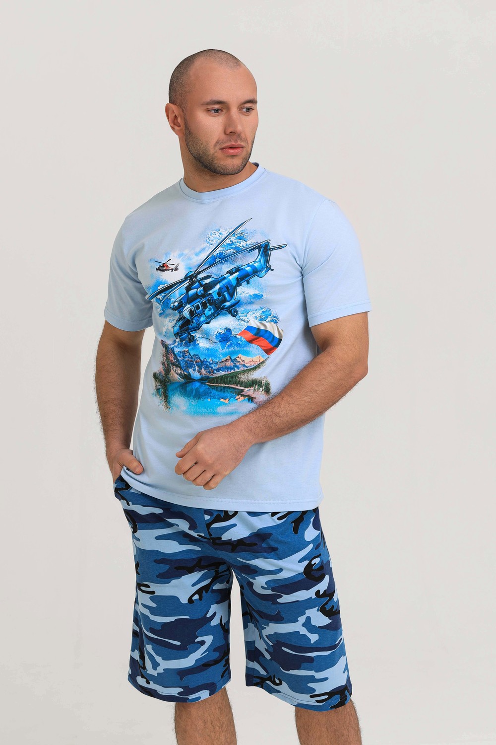 Мужской костюм из кулирки футболка + шорты. Светлая футболка с принтом в виде изображения вертолета. Шорты в дизайне милитари, по бокам карманы, длина чуть ниже коленей. Рисунок камуфляжа может немного отличаться