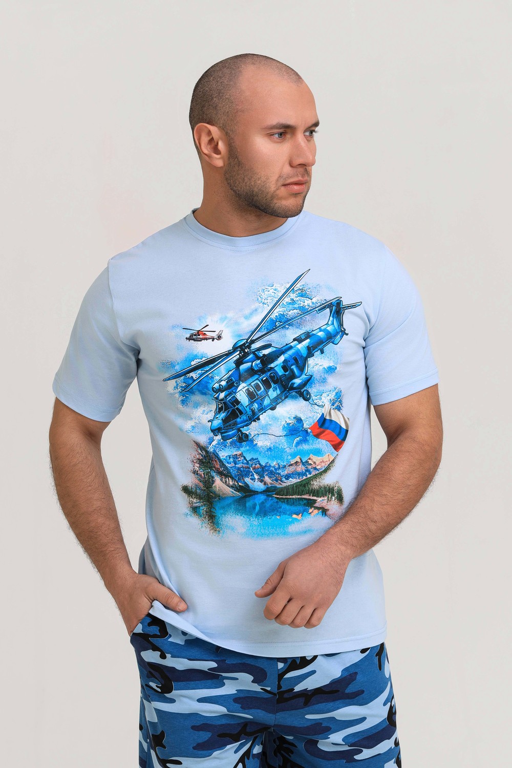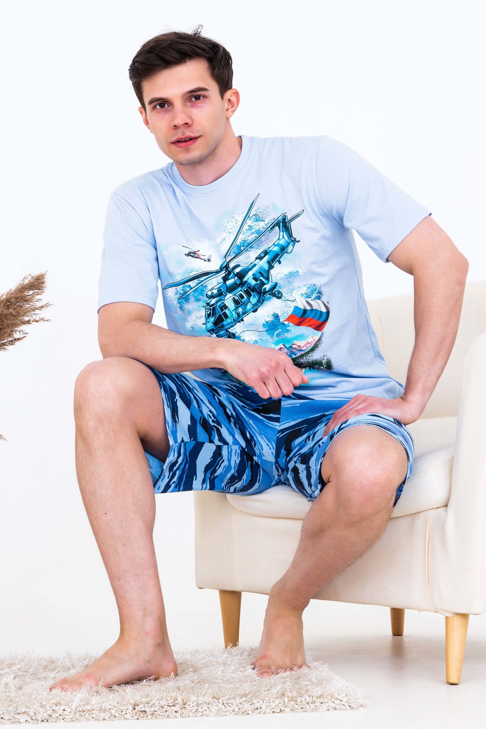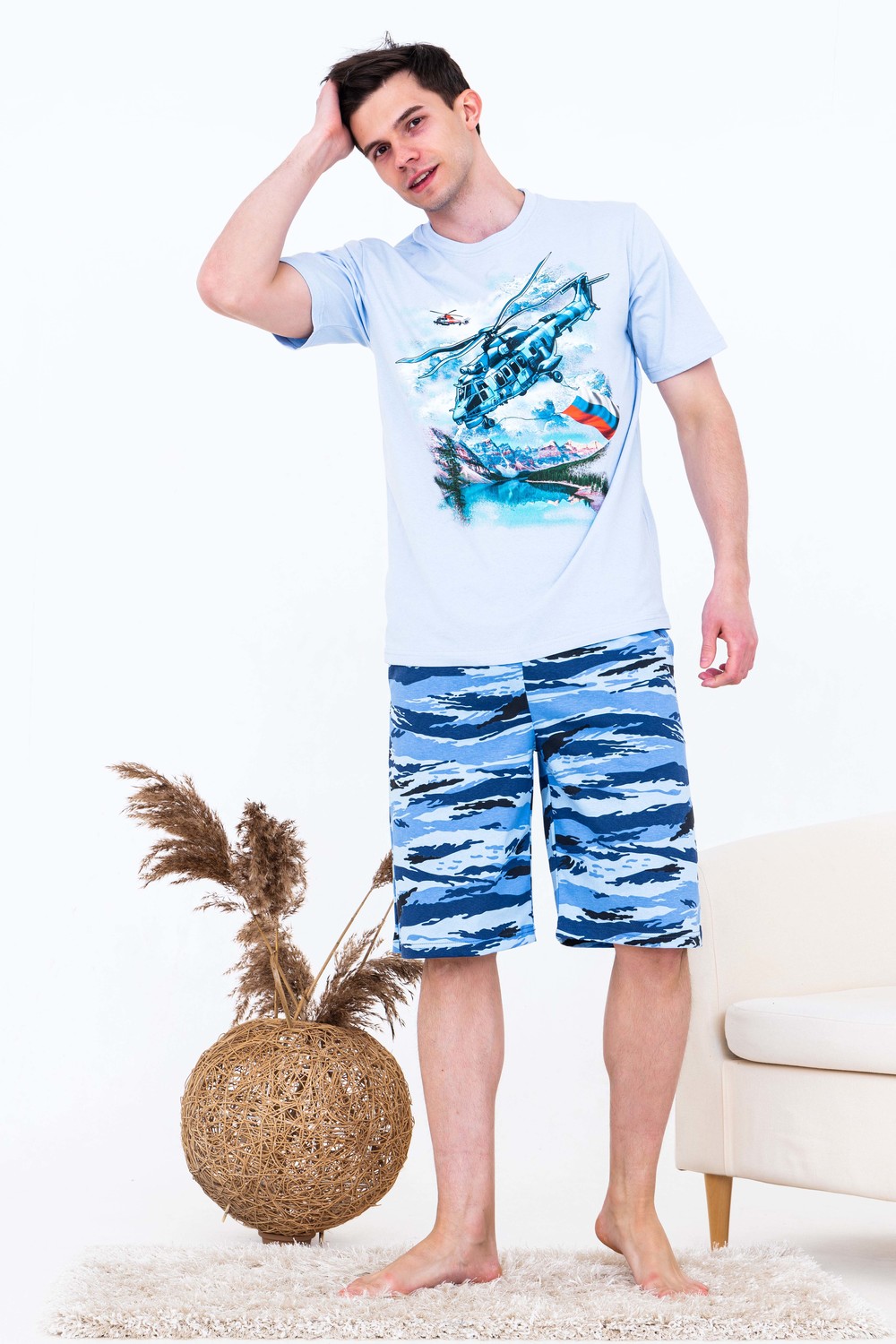 Мужской костюм из кулирки футболка + шорты. Светлая футболка с принтом в виде изображения вертолета. Шорты в дизайне милитари, по бокам карманы, длина чуть ниже коленей. Рисунок камуфляжа может немного отличаться