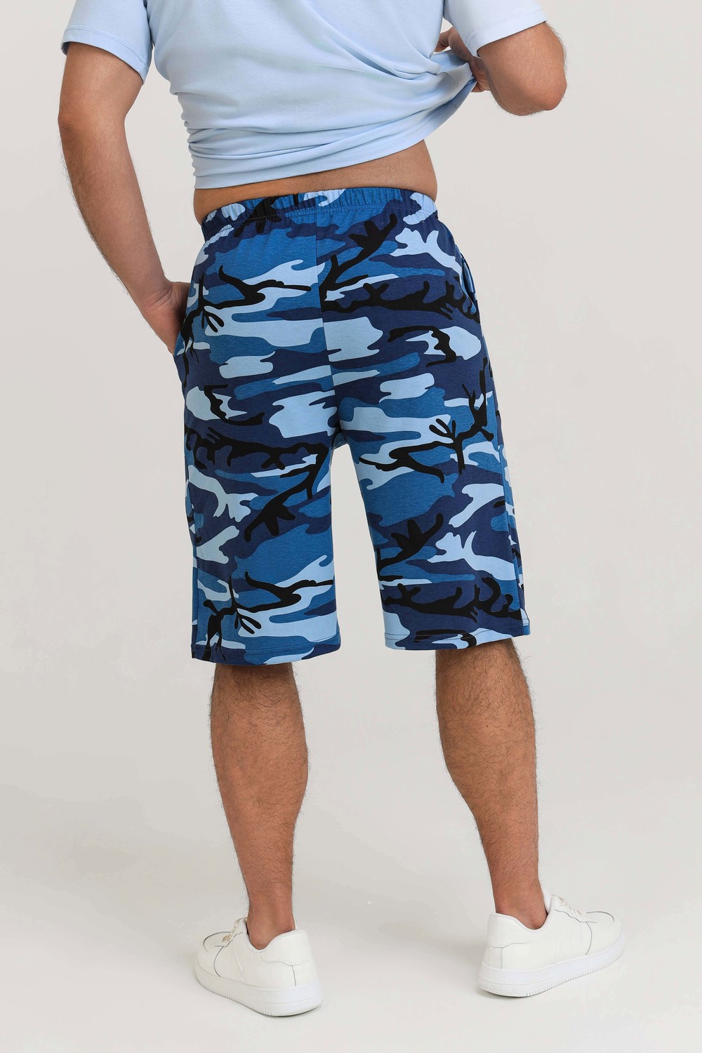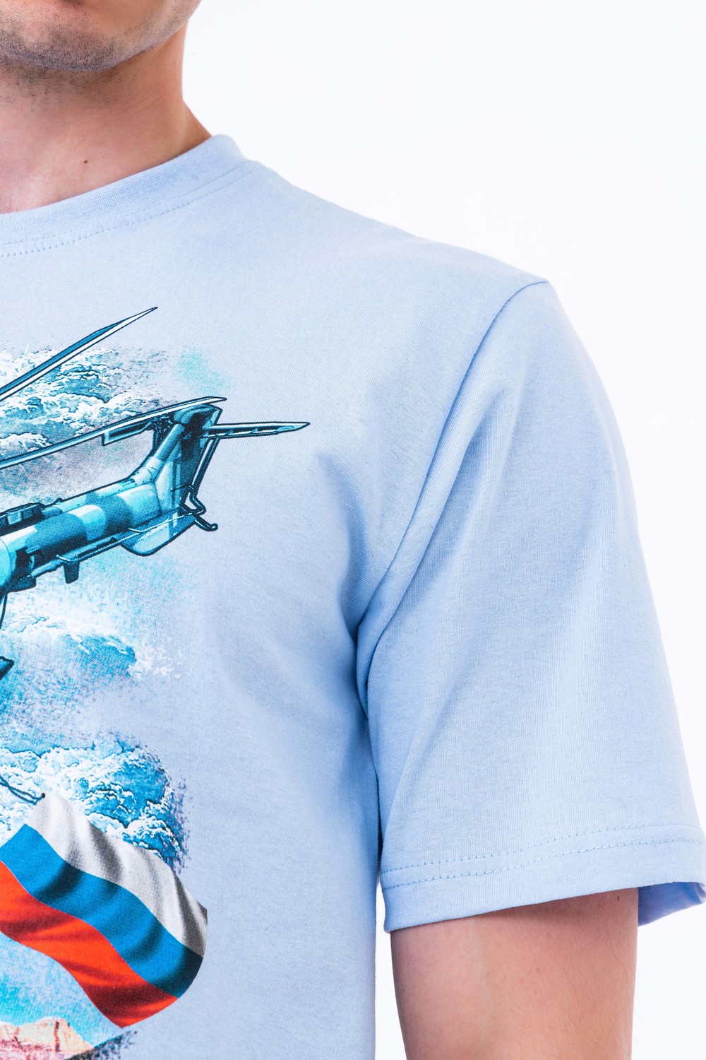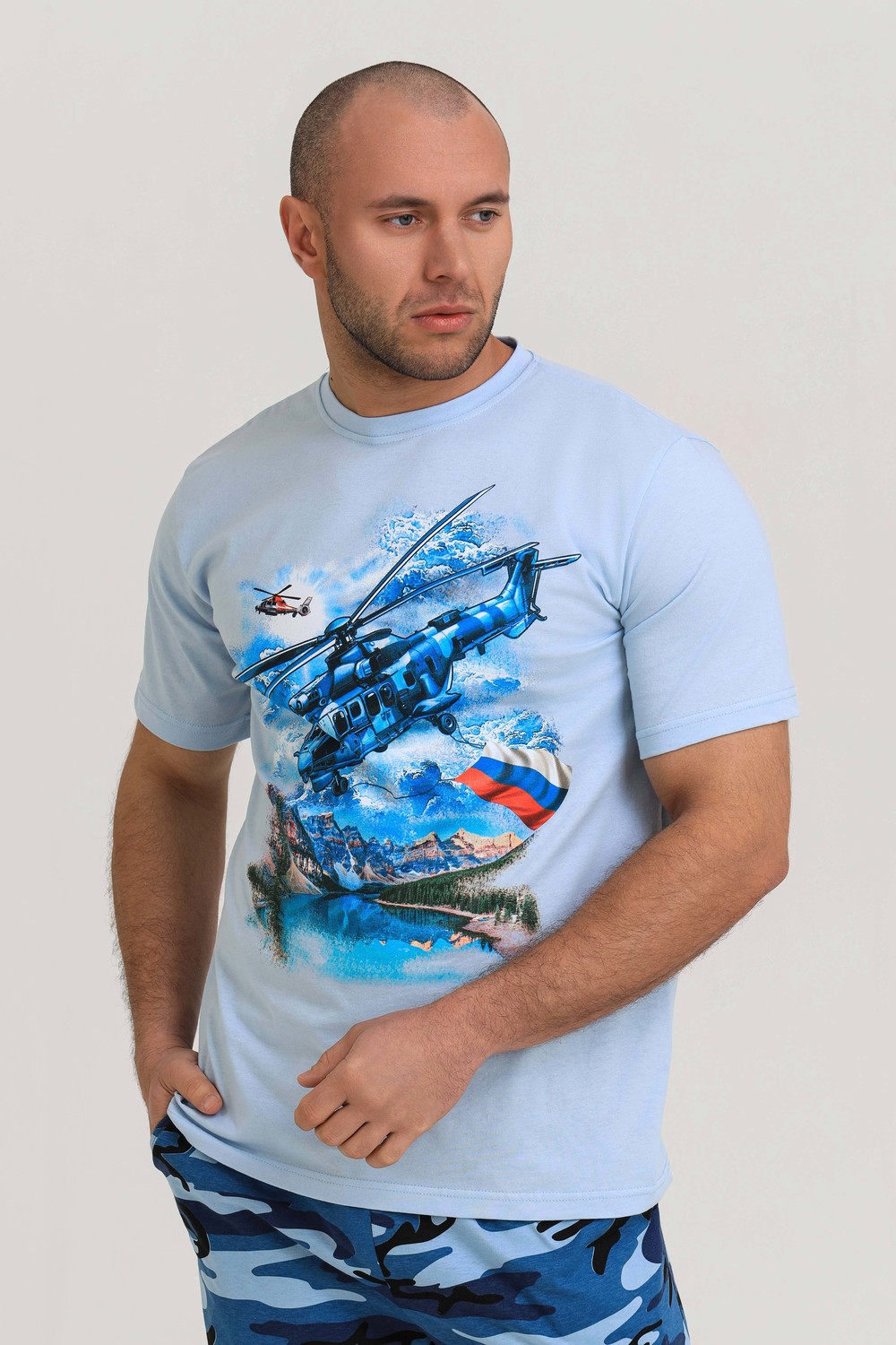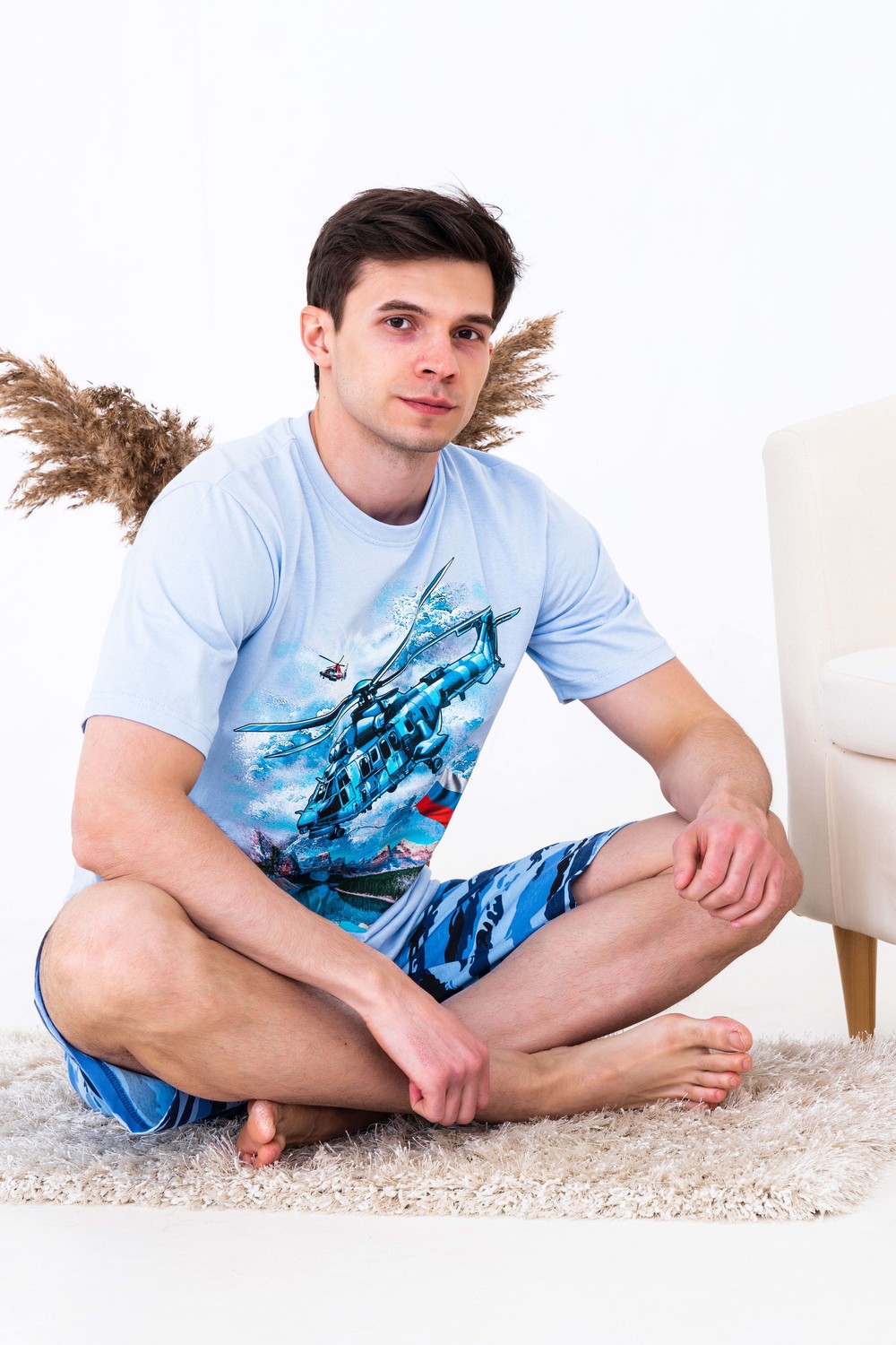 Мужской костюм из кулирки футболка + шорты. Светлая футболка с принтом в виде изображения вертолета. Шорты в дизайне милитари, по бокам карманы, длина чуть ниже коленей. Рисунок камуфляжа может немного отличаться