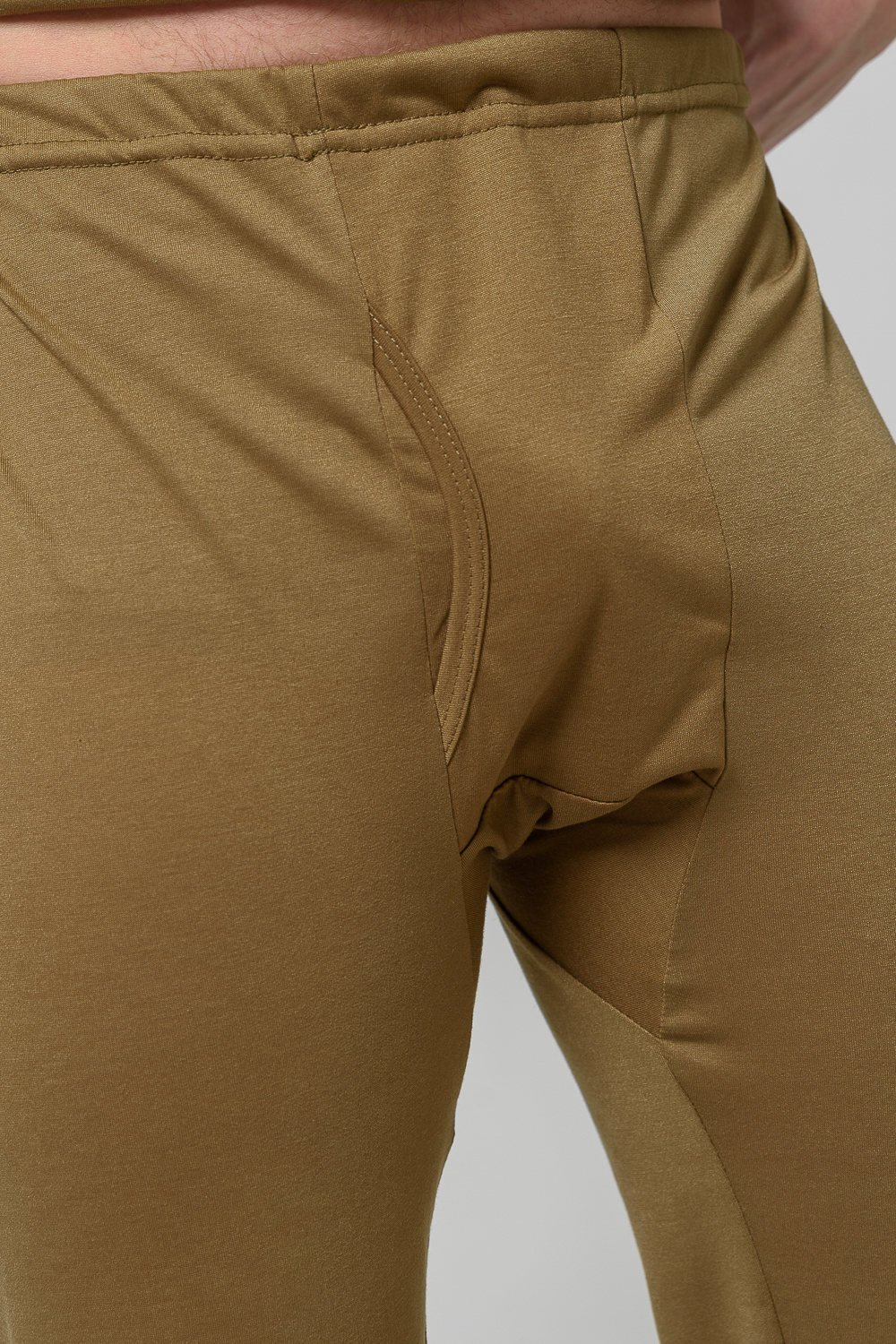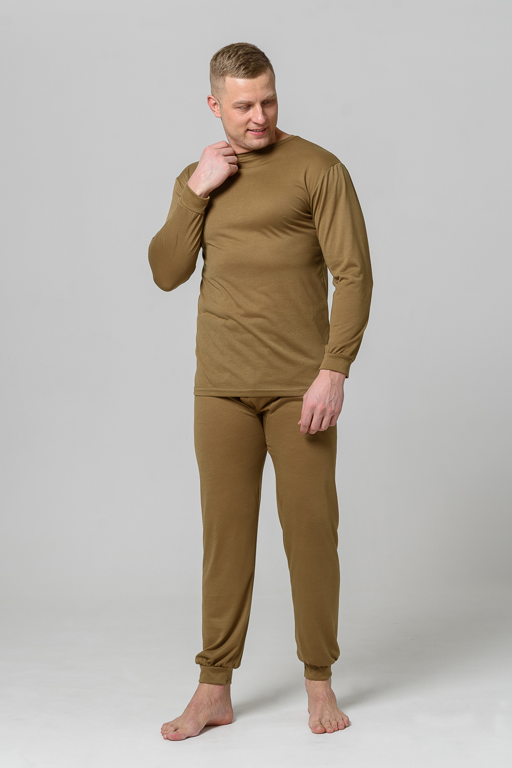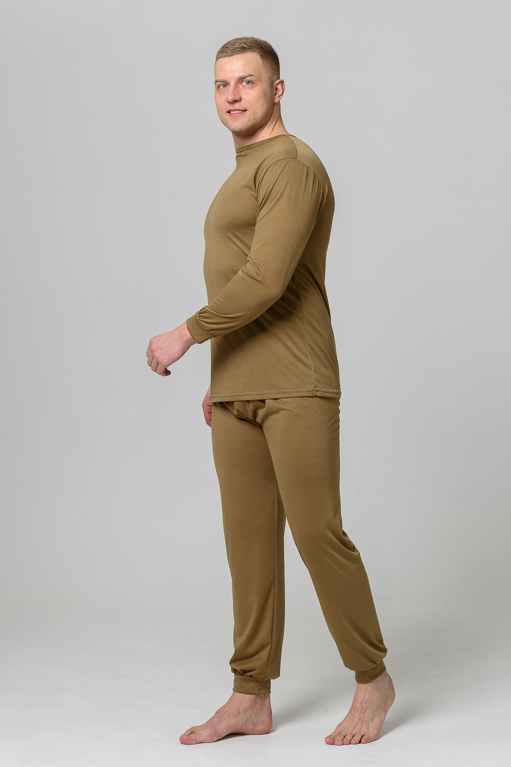 Комплект состоит из фуфайки и кальсон. Фуфайка прямого силуэта. Рукава втачные одношовные с притачными манжетами. Вырез горловины округлой формы, окантован бейкой. Кальсоны без боковых швов с двойным гульфиком, двойной ластовицей и одинарной вставкой сзади. По низу кальсон манжеты. Вырез гульфика окантован бейкой. По верху кальсон проложена эластичная лента