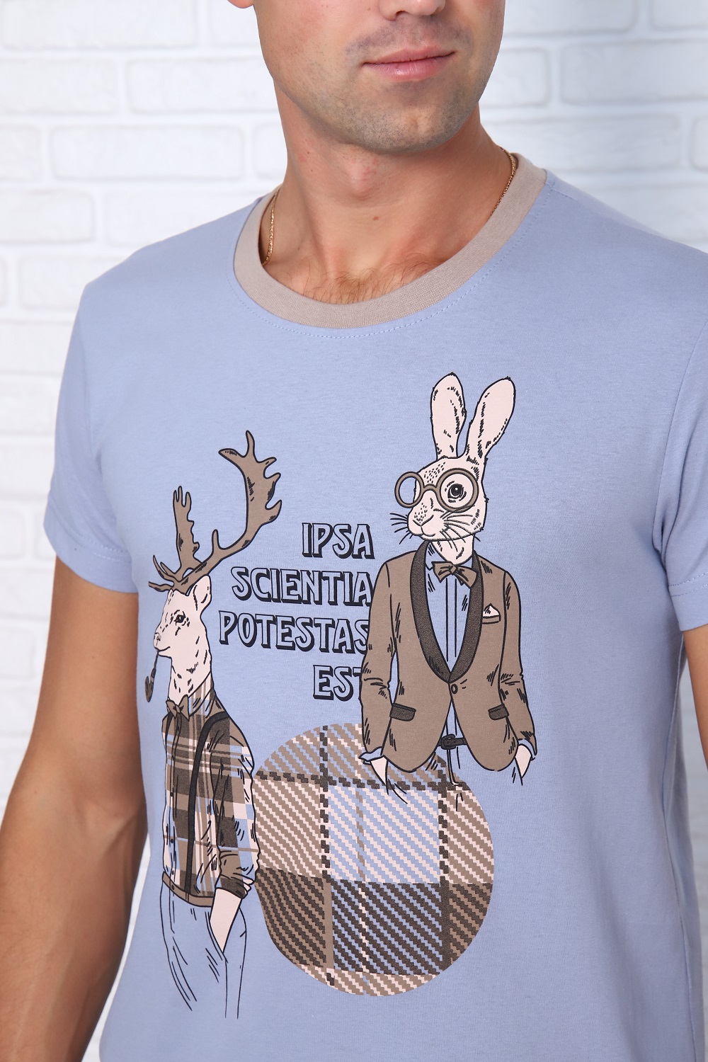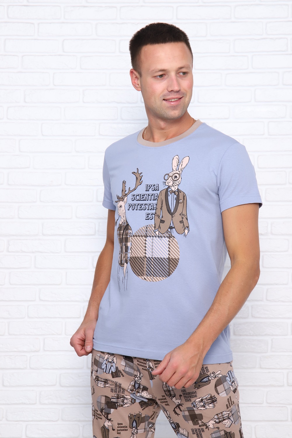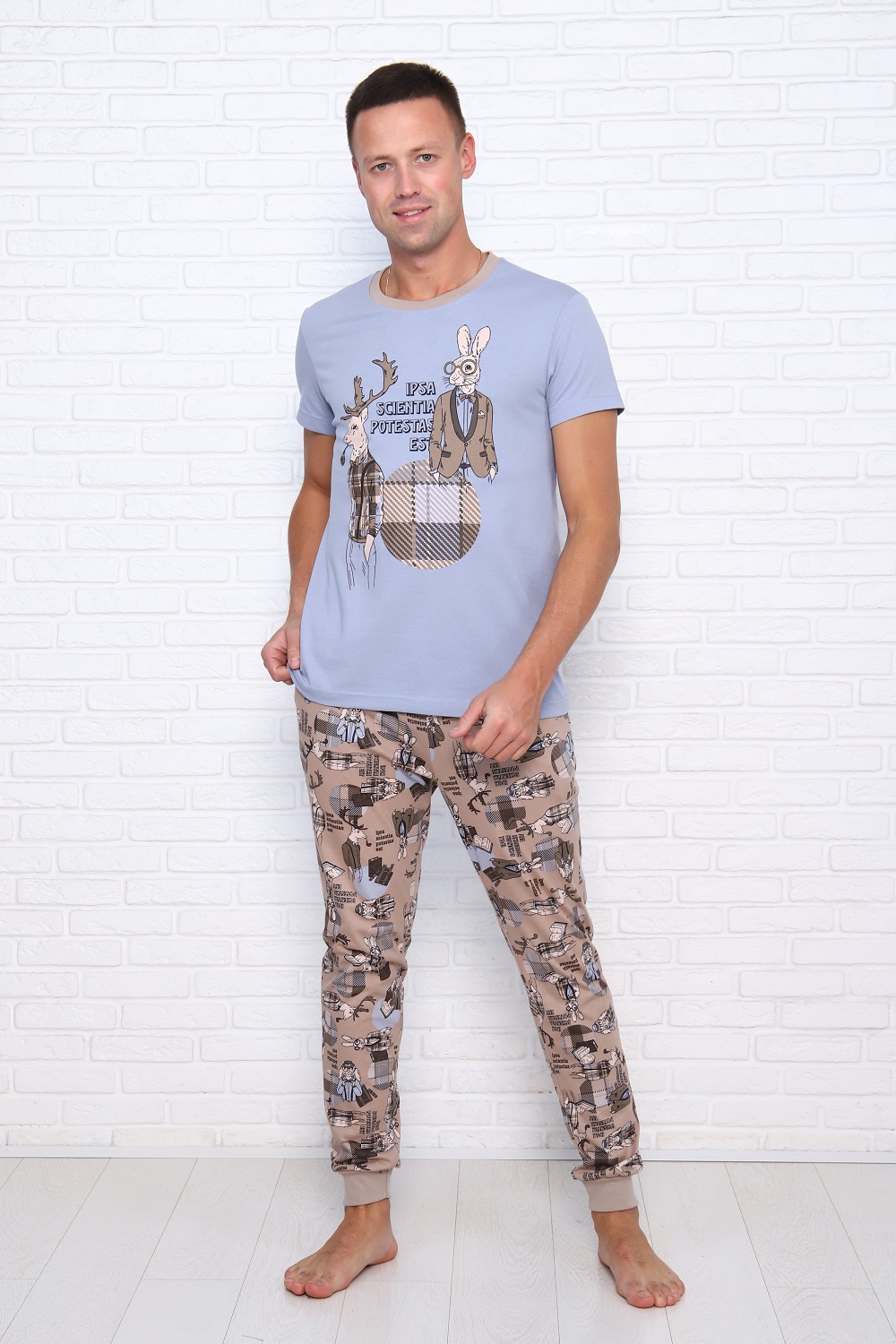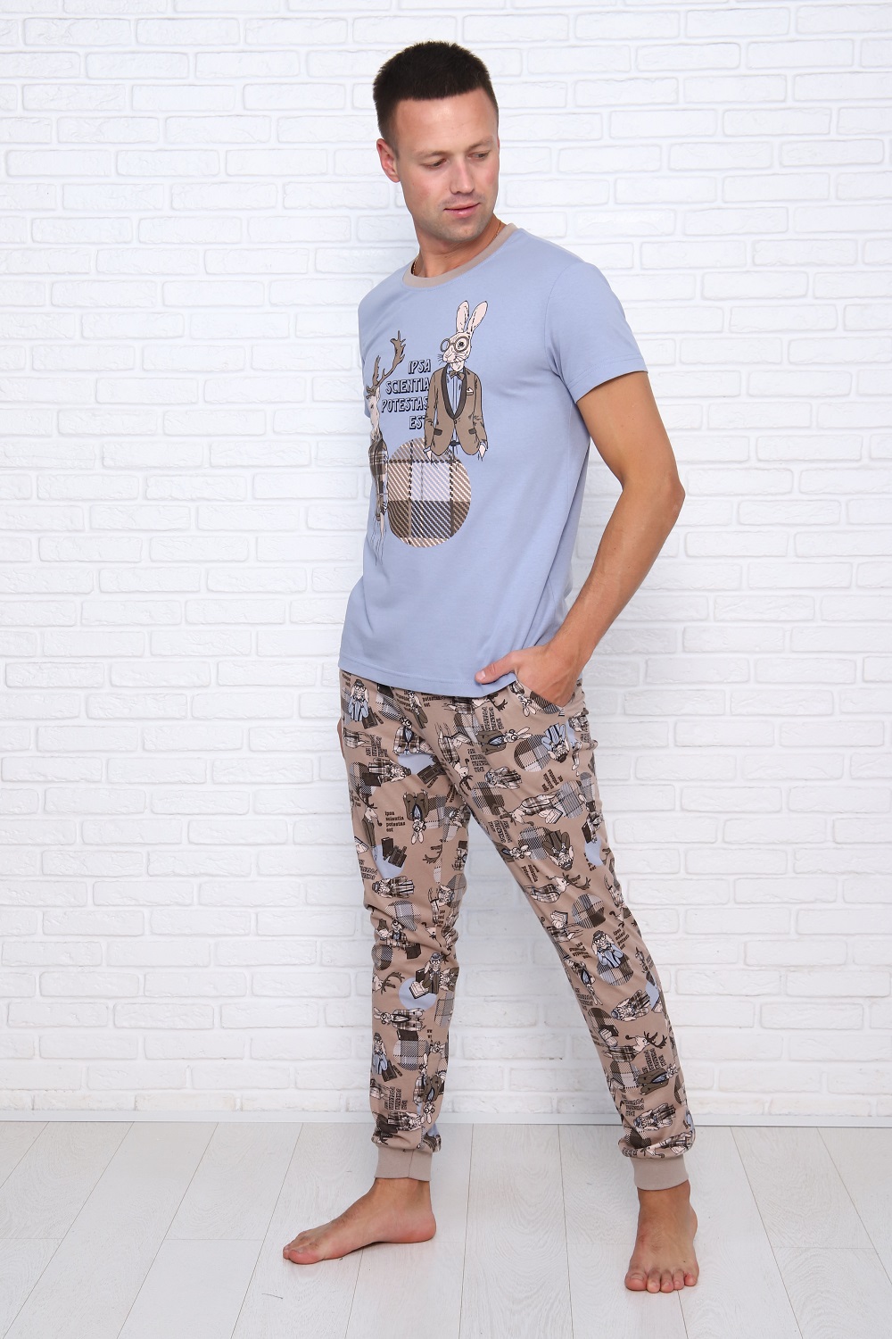 Пижама мужская: брюки с боковыми карманами, заужены к низу, манжет из рибаны; футболка с коротким рукавом и со стильной печатью на груди.