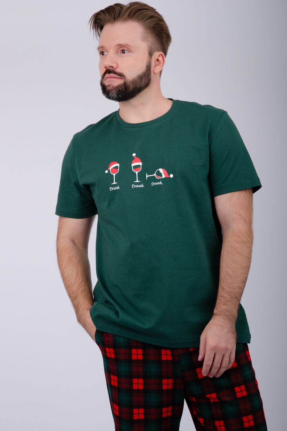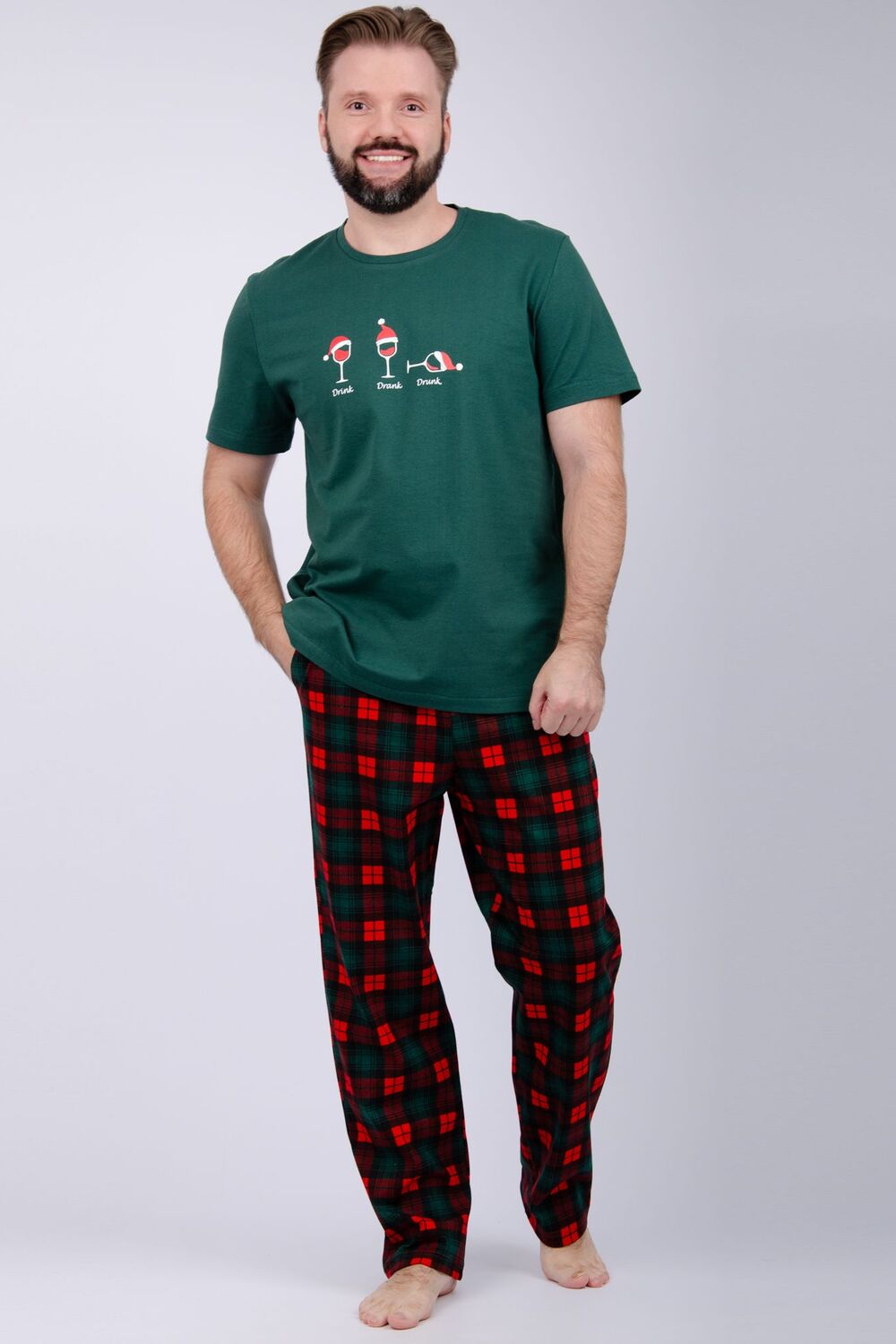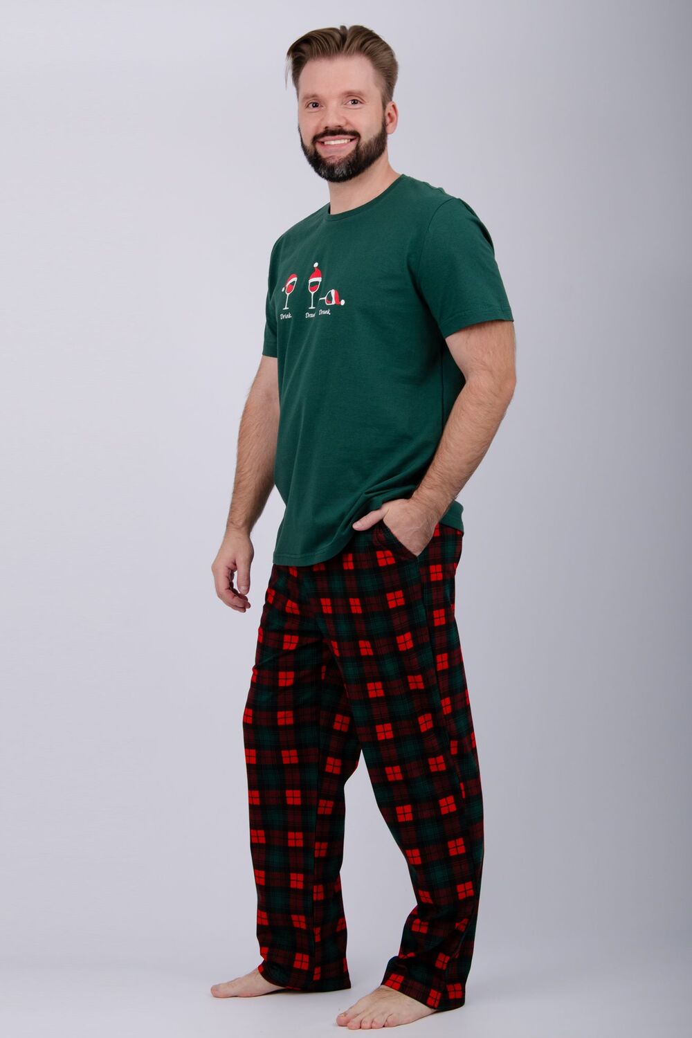 Комфортная мужская пижама из 100% хлопка - брюки с боковыми карманами, на эластичном поясе и футболка с коротким рукавом и стильным принтом на полочке.