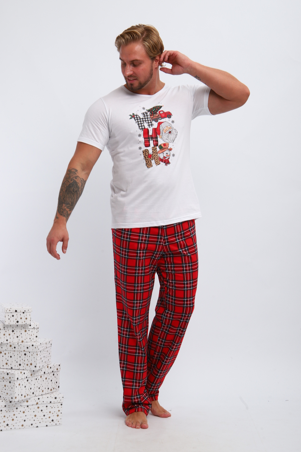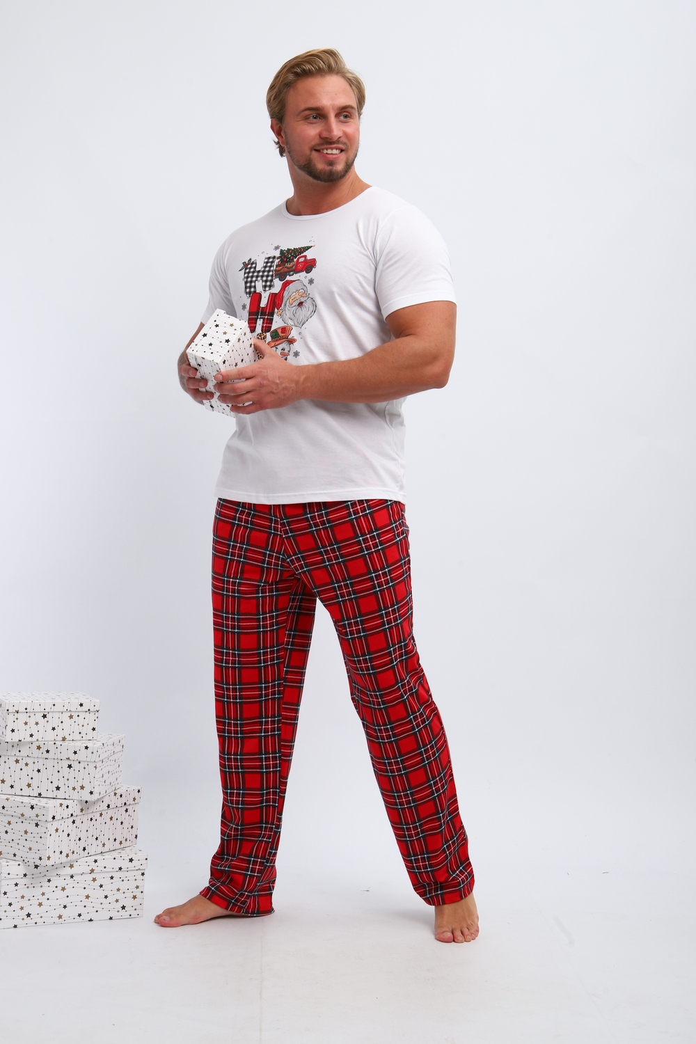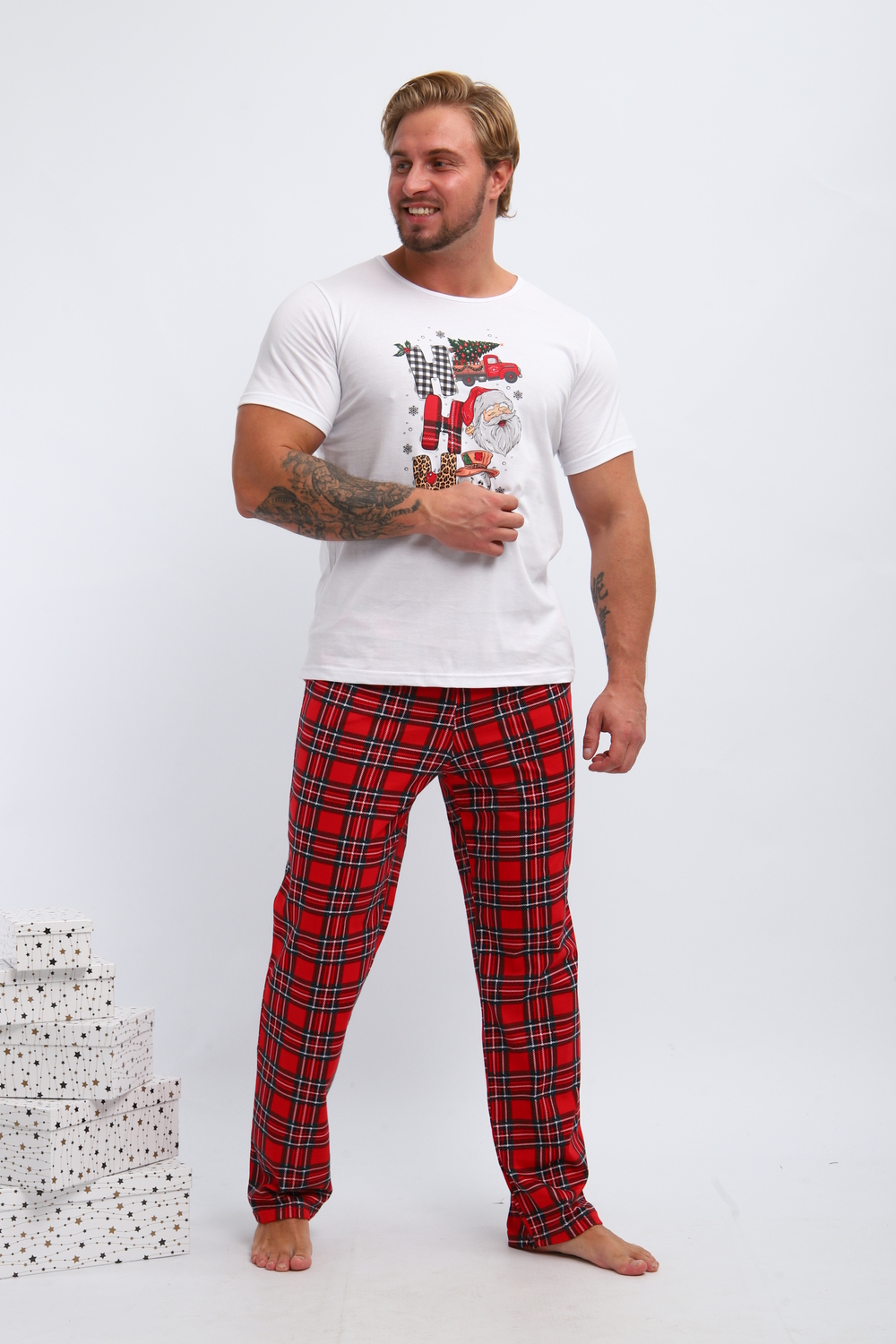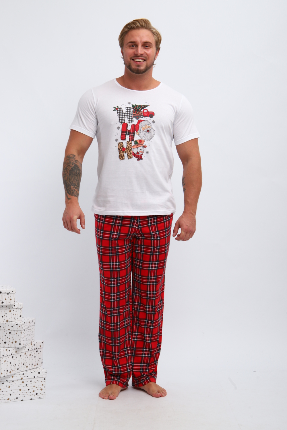Стильный и модный набор для дома, который станет отличным выбором для мужчин. Этот комплект создан с учетом всех современных тенденций, обеспечивая комфорт и удобство повседневной носки. Трикотажный материал приятно ощущается на коже, благодаря чему костюм идеально подходит для отдыха и сна. Этот красивый пижамный комплект включает в себя уютную футболку и брюки. Мягкий трикотаж обеспечивает свободу движений и комфорт в любое время суток. Одежда выполнена в ярком стиле, чтобы вы чувствовали себя привлекательно даже дома. Особенным украшением комплекта является оригинальный новогодний принт, создающий милый и игривый образ.
