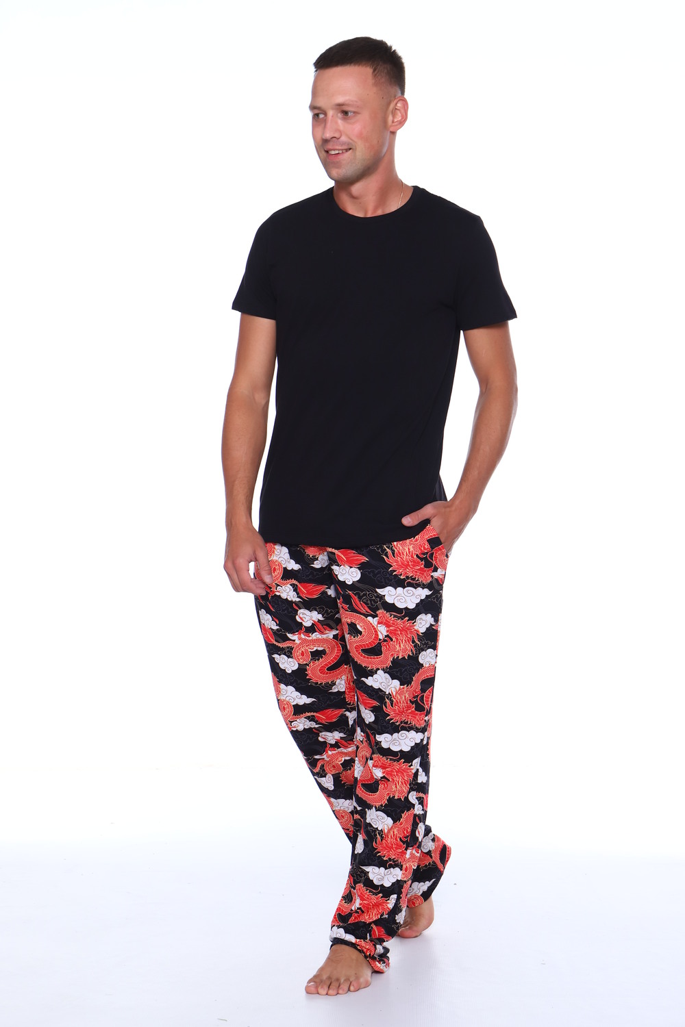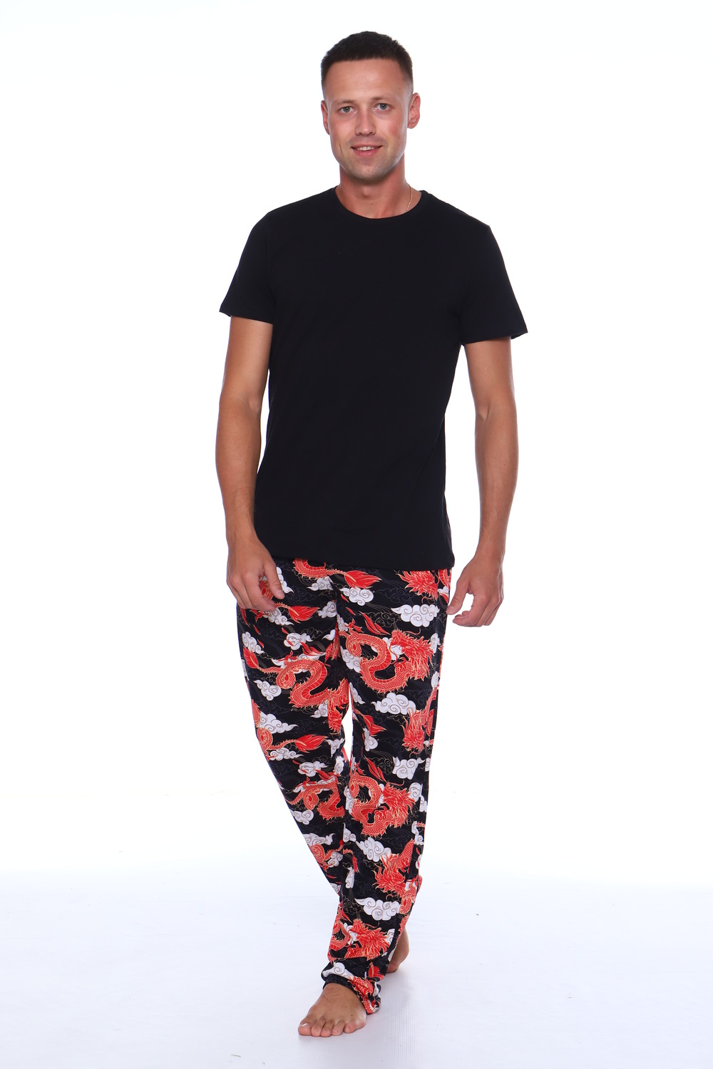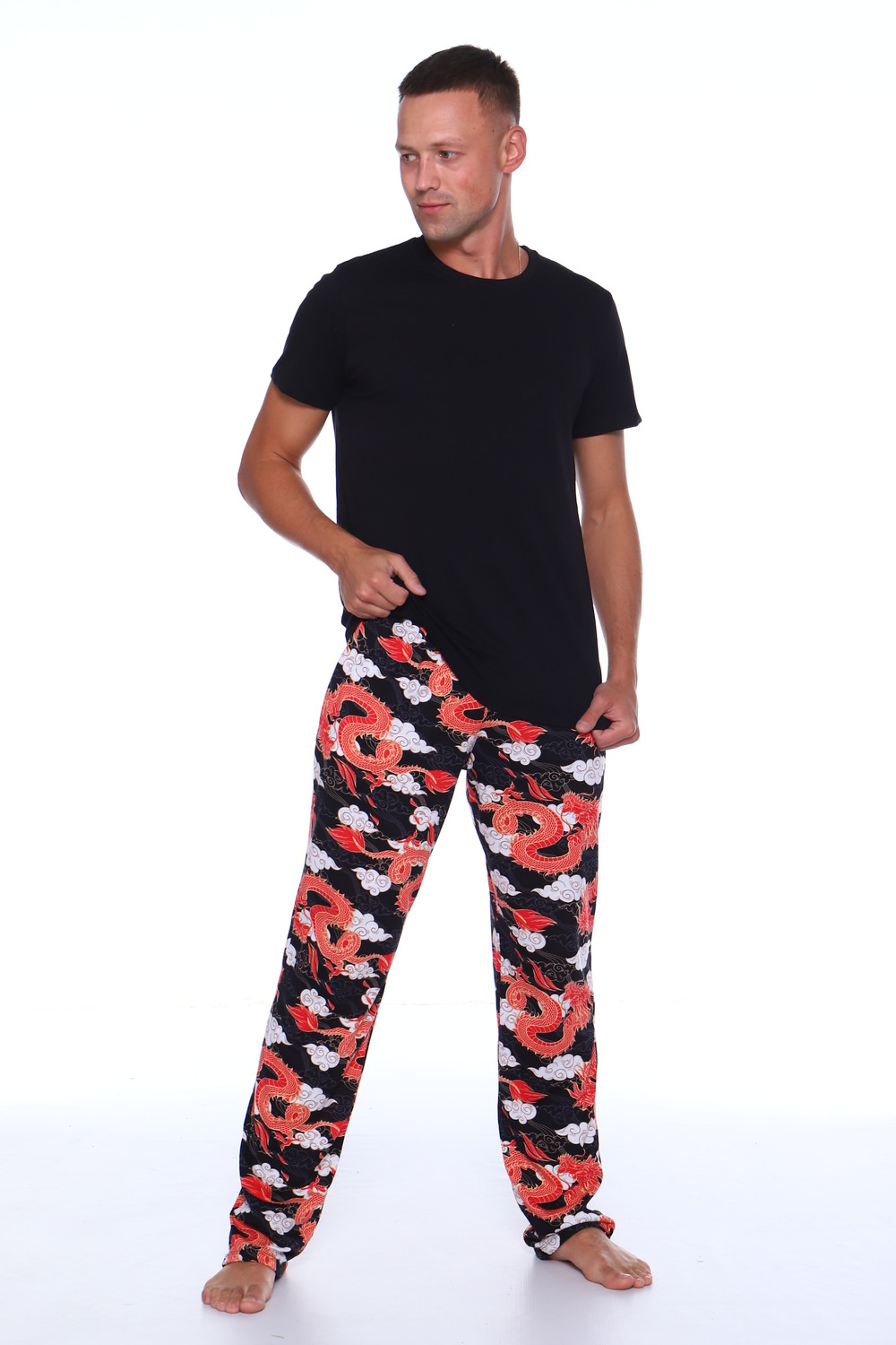 Комплект состоит из футболки и брюк. Футболка свободного кроя, с коротким рукавом, круглым вырезом горловины, который обработан рибаной. Брюки прямого кроя с карманами.