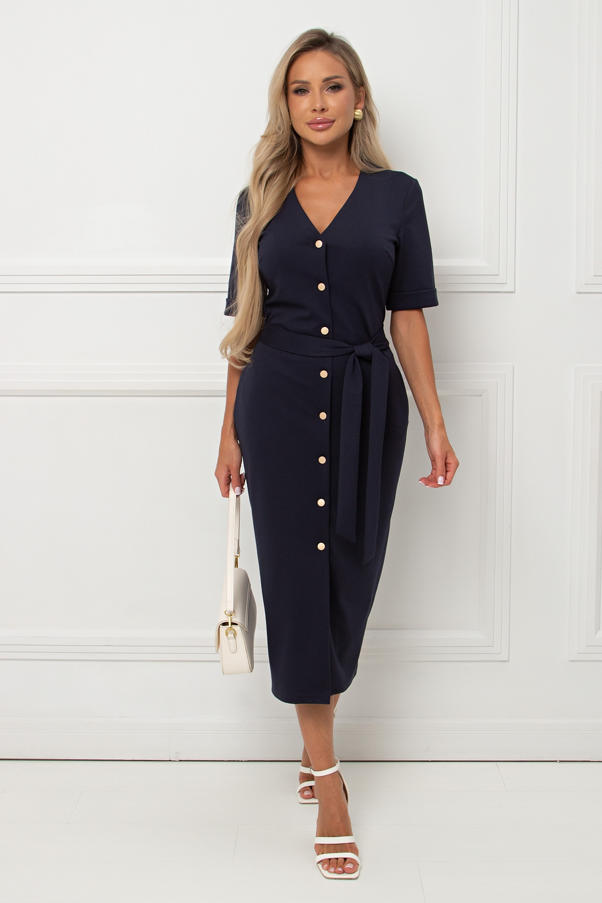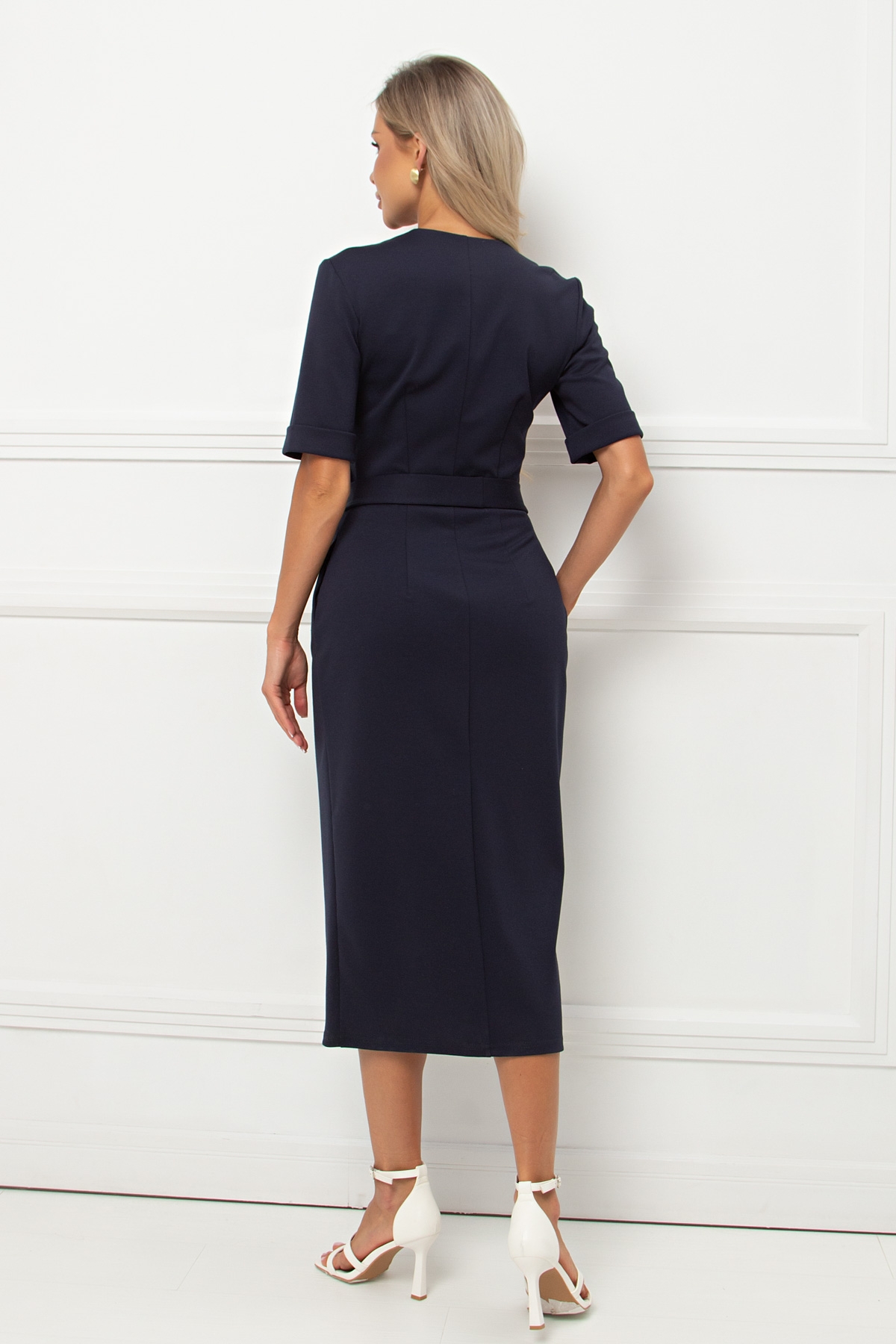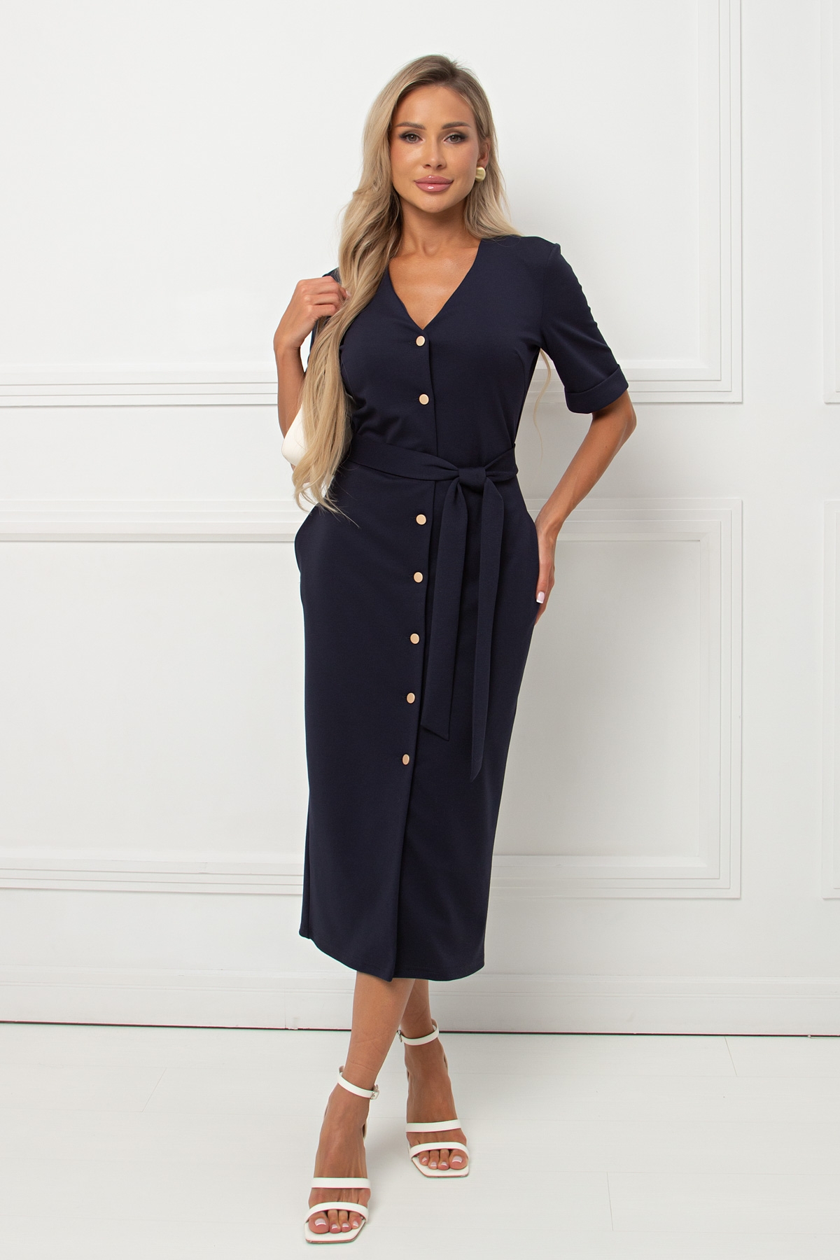 Повседневное платье полуприлегающего силуэта из трикотажного полотна .Короткий втачной рукав с отворотом по низу .V- образная горловина на внутренней обтачке переходящая в планку с застежкой на петли и пуговицы. В боковых швах функциональные карманы . Низ ровный , без разрезов. Пояс из основной ткани в комплекте.