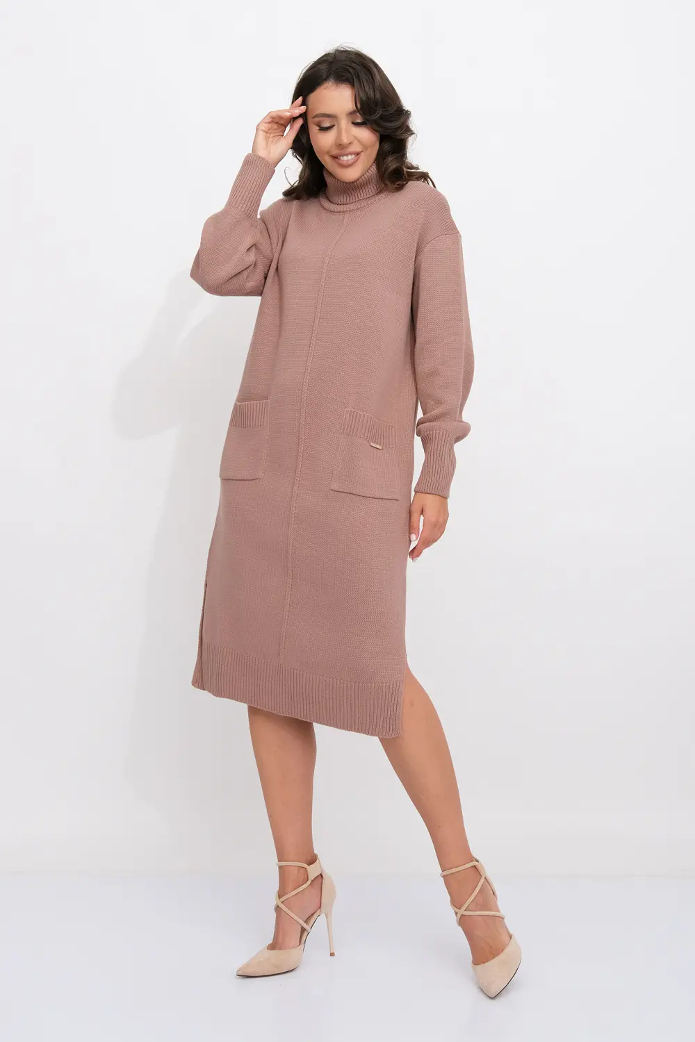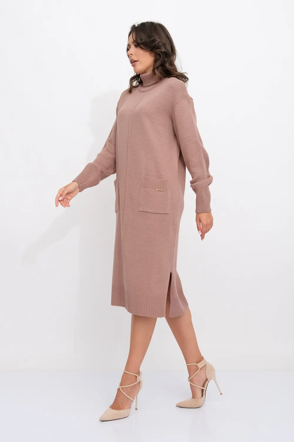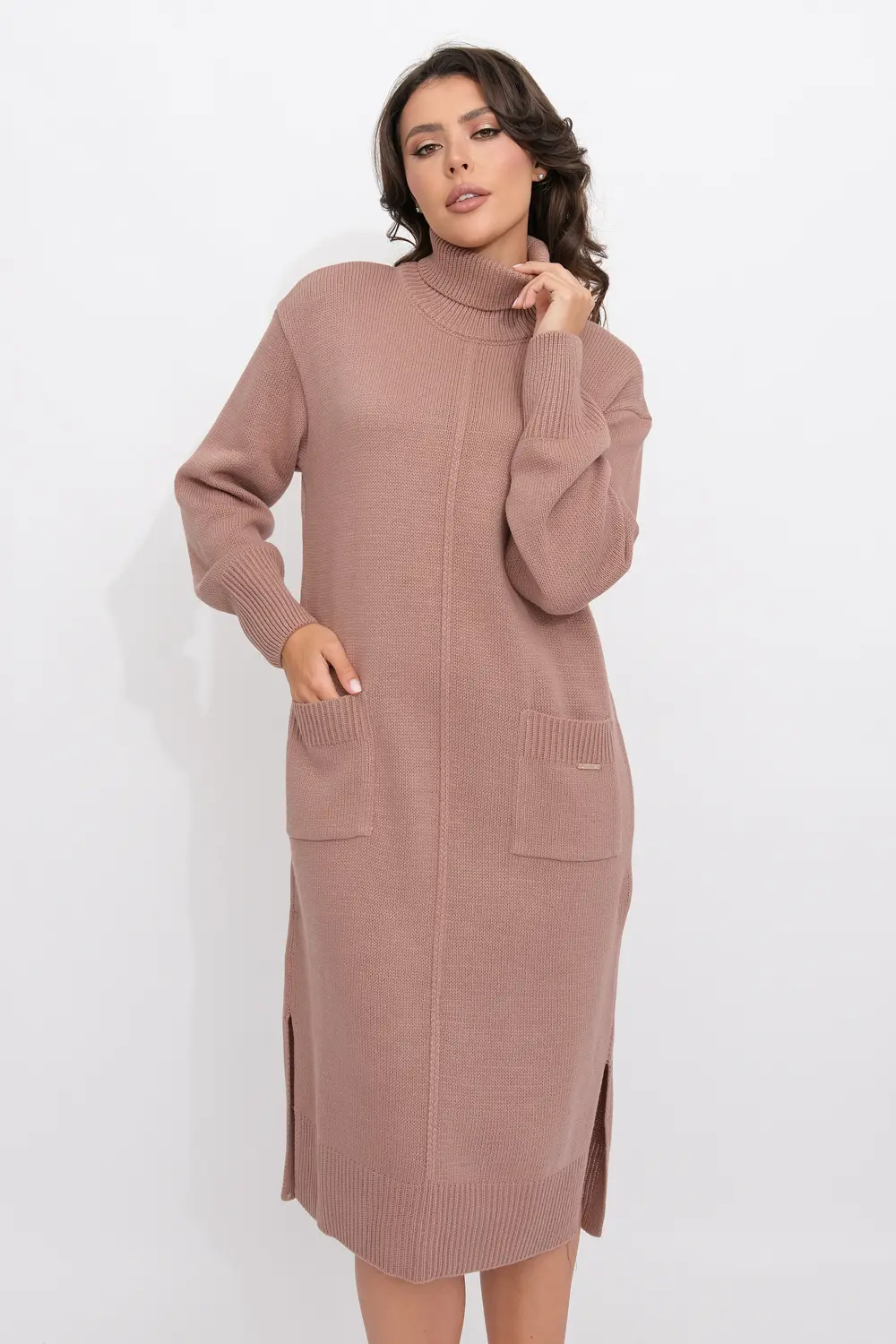 Платье прямого силуэта из трикотажного вязанного полотна с отложным воротником-стойка. Длинные рукава с приспущенным плечом. Внизу платья небольшие разрезы по бокам. Накладные карманы.