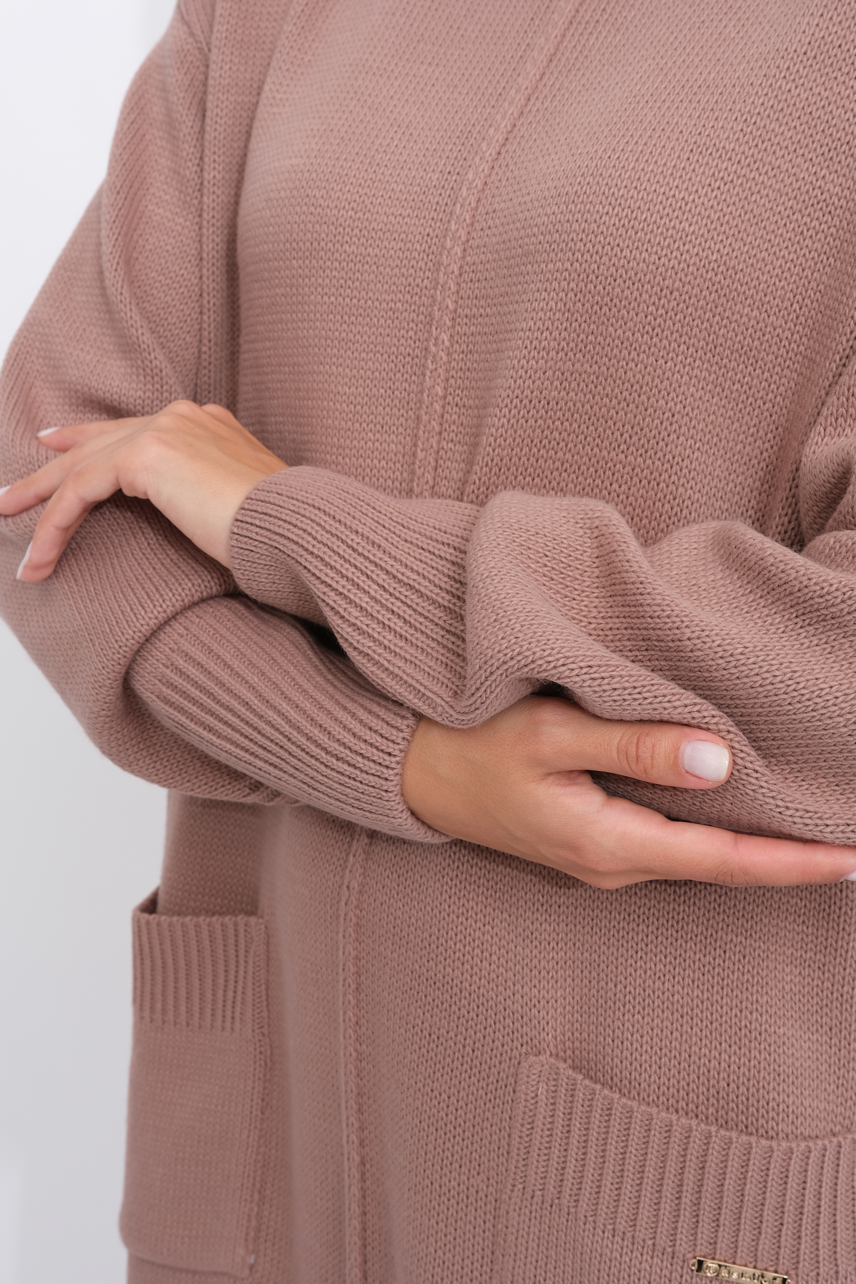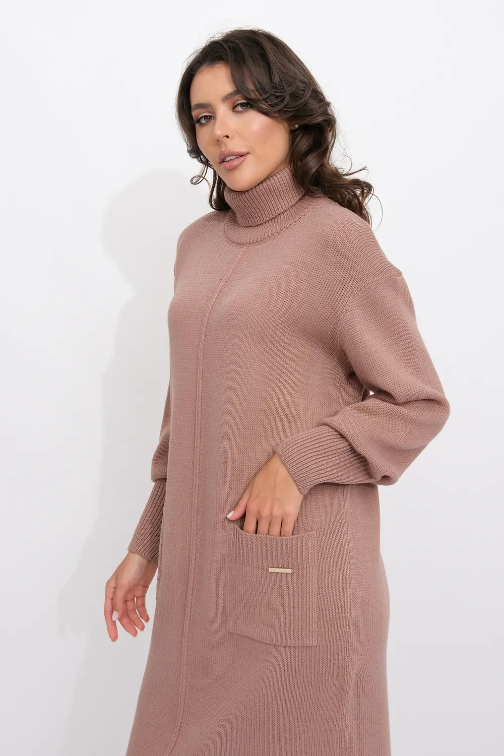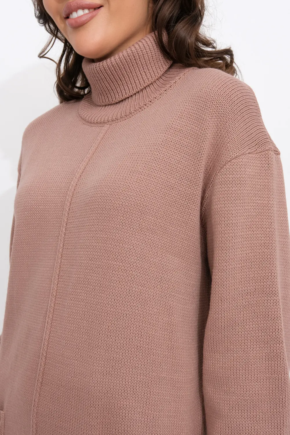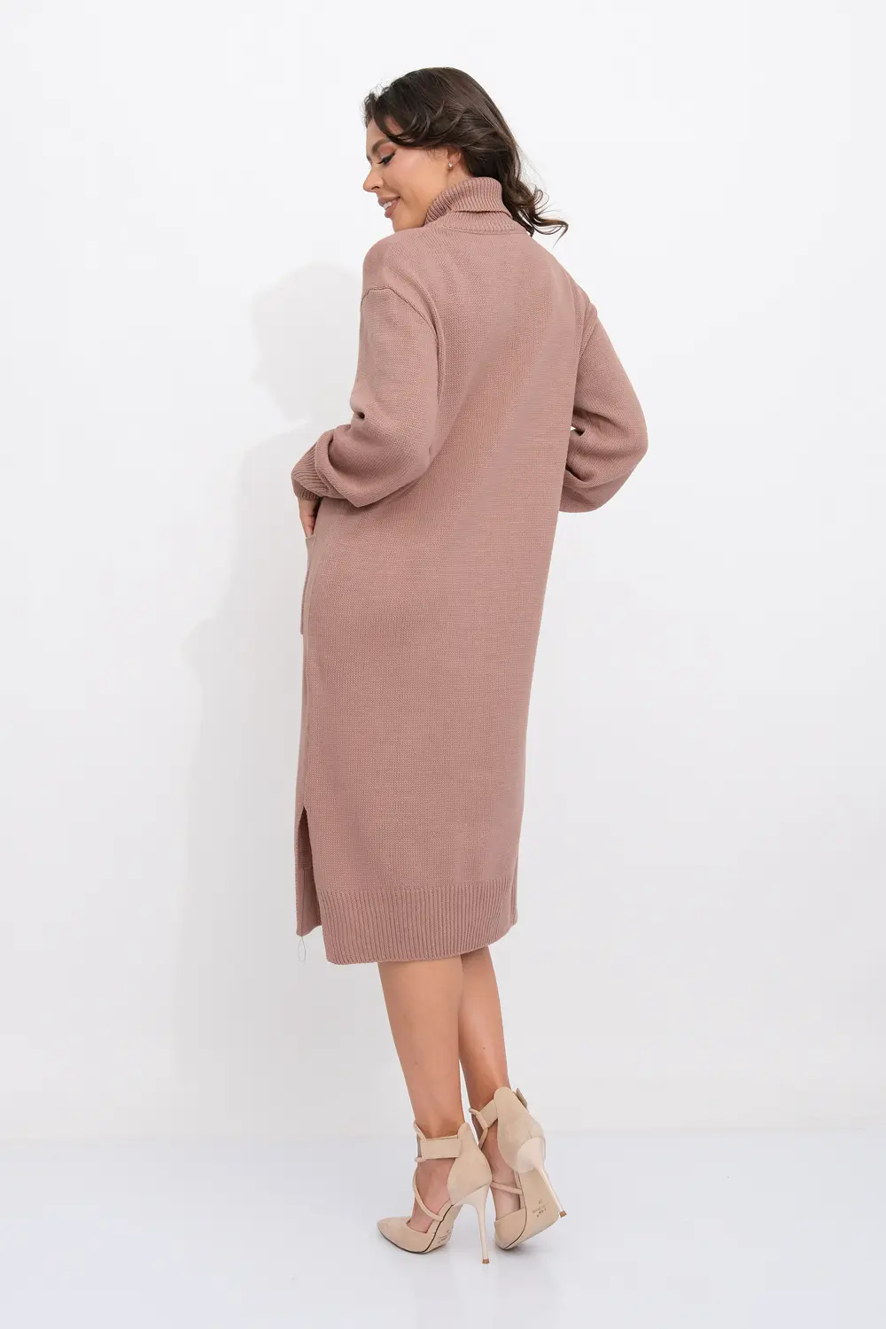 Платье прямого силуэта из трикотажного вязанного полотна с отложным воротником-стойка. Длинные рукава с приспущенным плечом. Внизу платья небольшие разрезы по бокам. Накладные карманы.