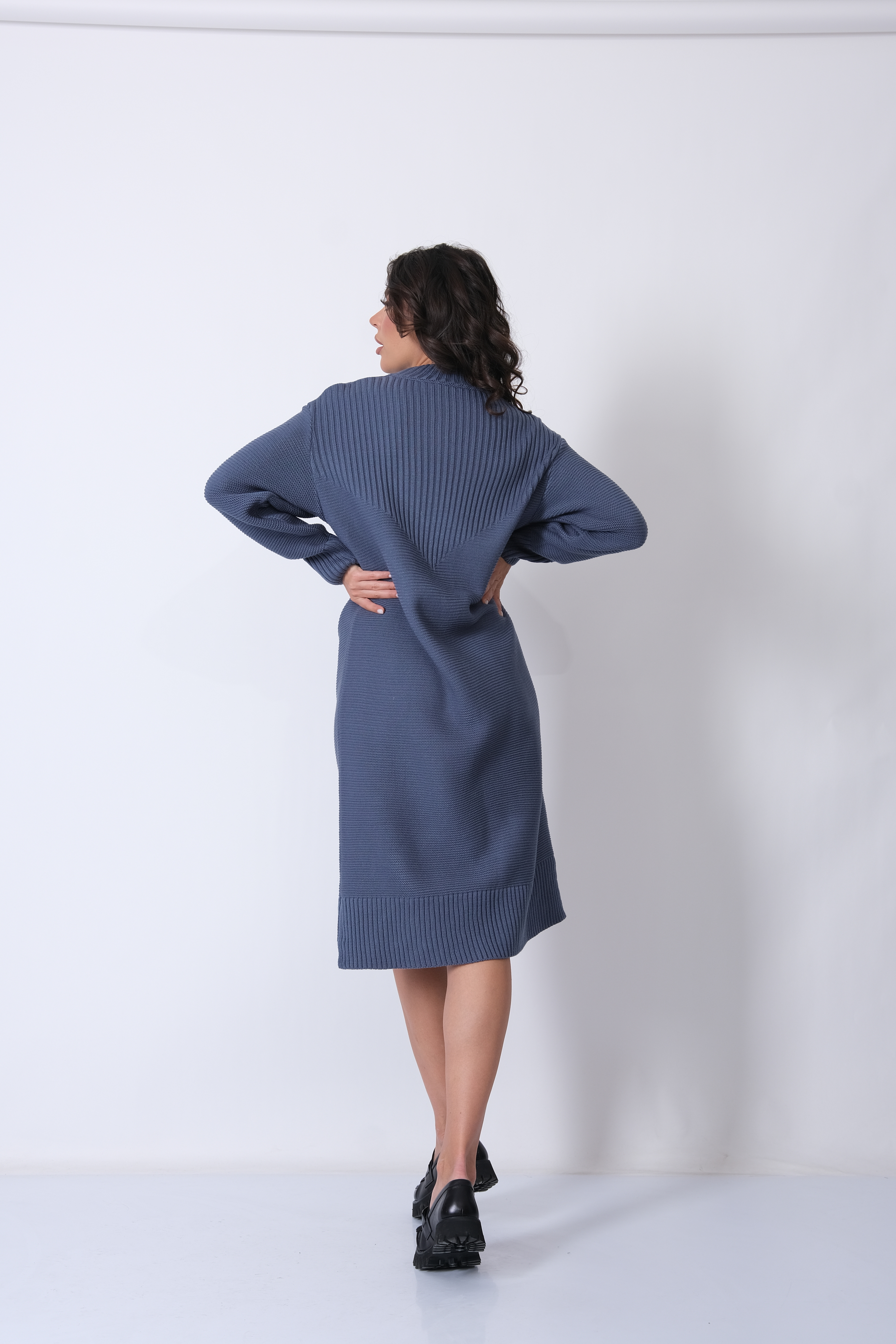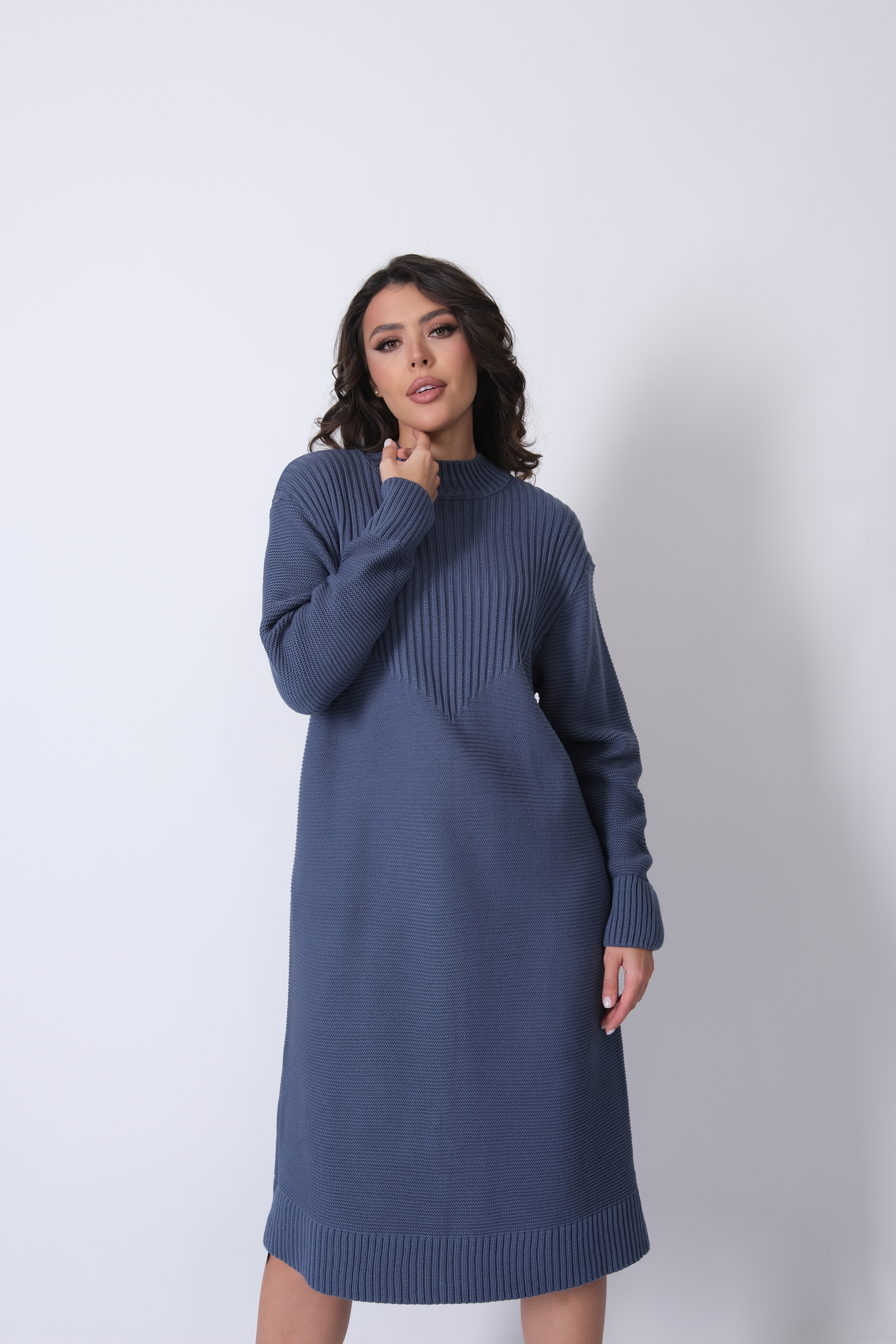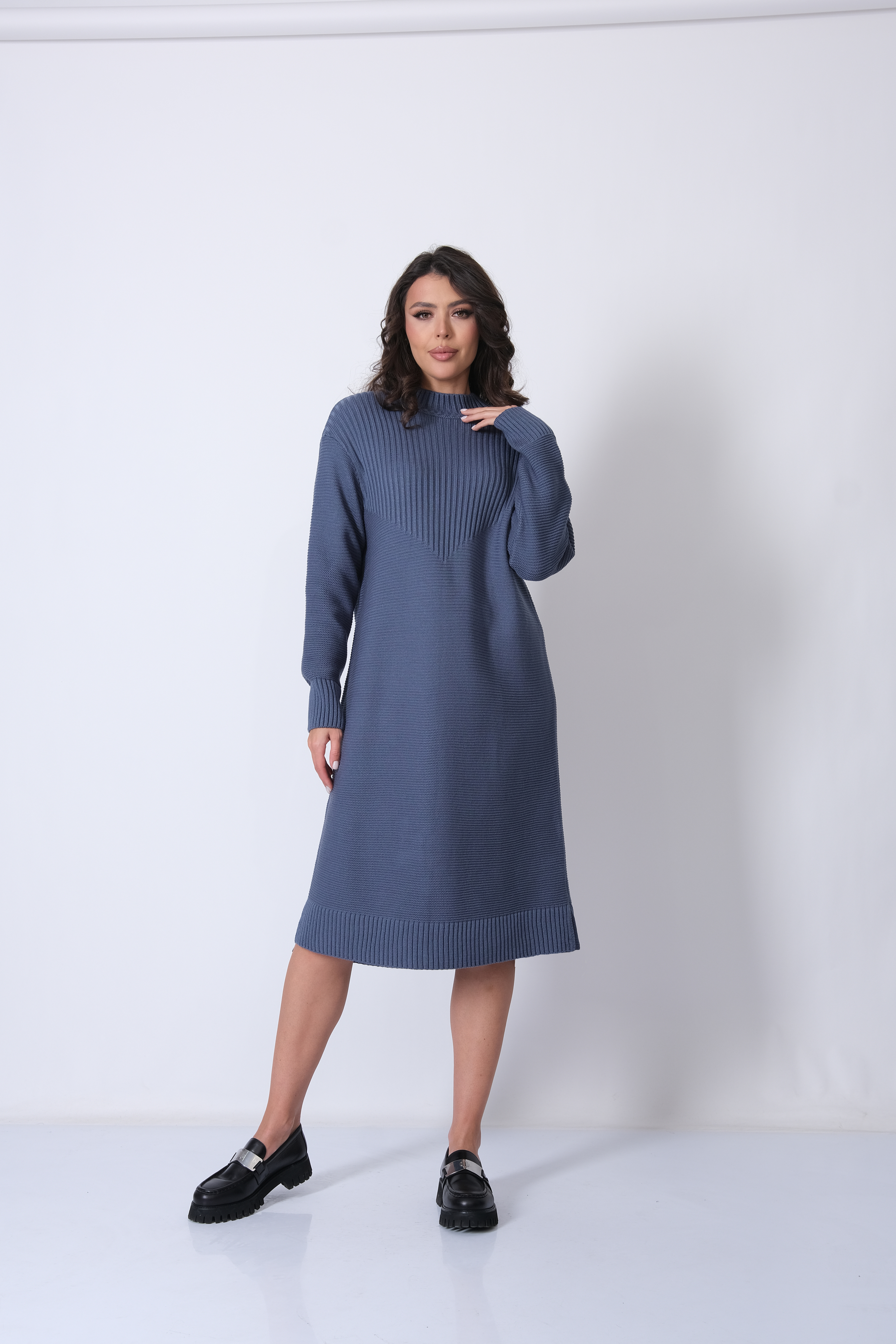 Платье прямого силуэта из трикотажного вязанного полотна с воротником-стойка, спущенным плечом и рукавом полной длины. Кокетка спинки и полочки выполнено переплетением образующим рельефный вертикальный рисунок.