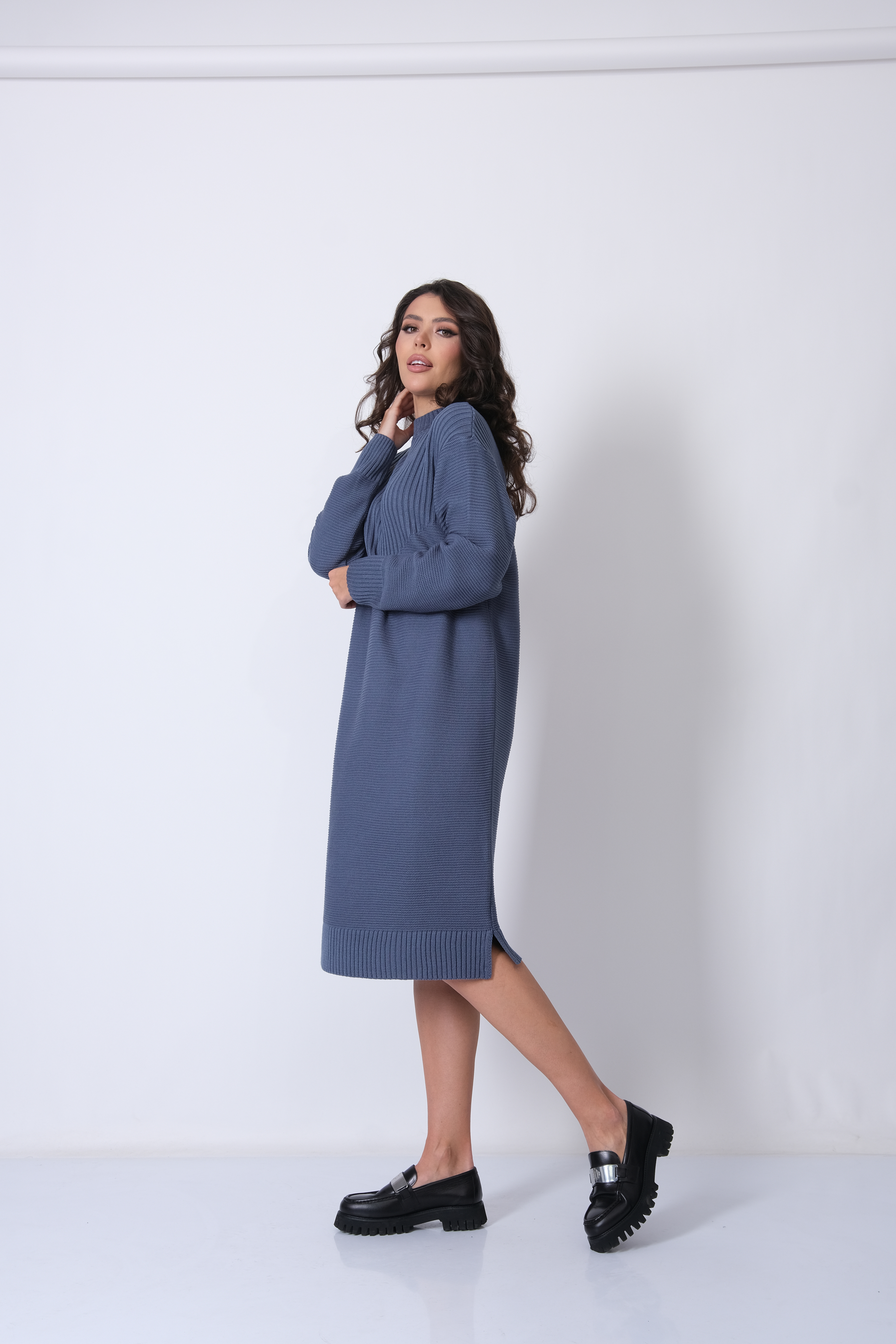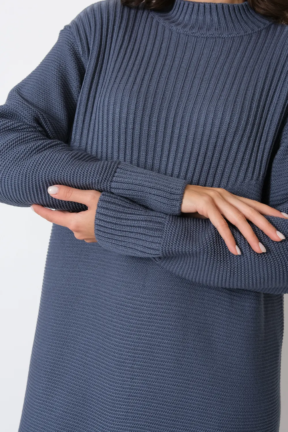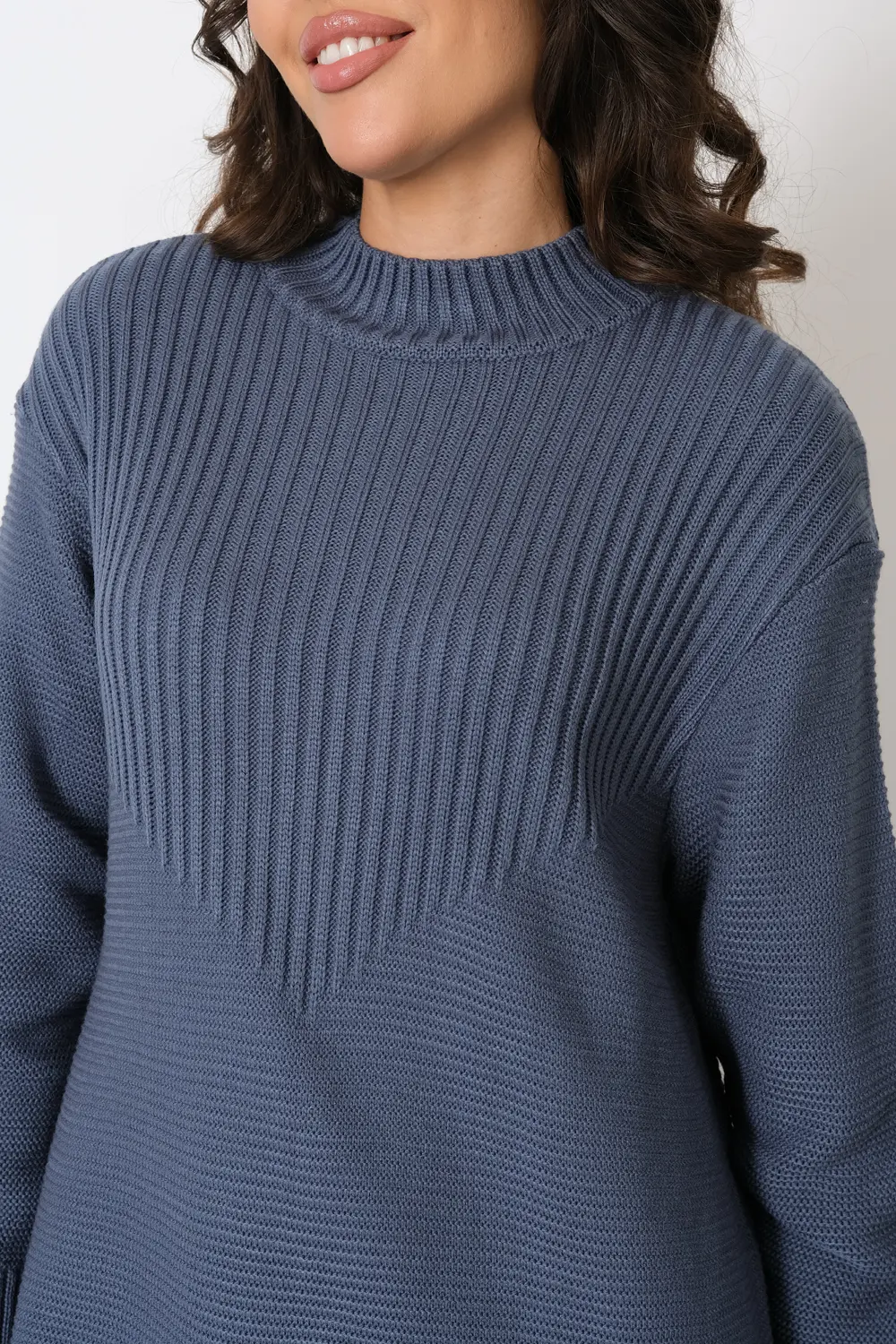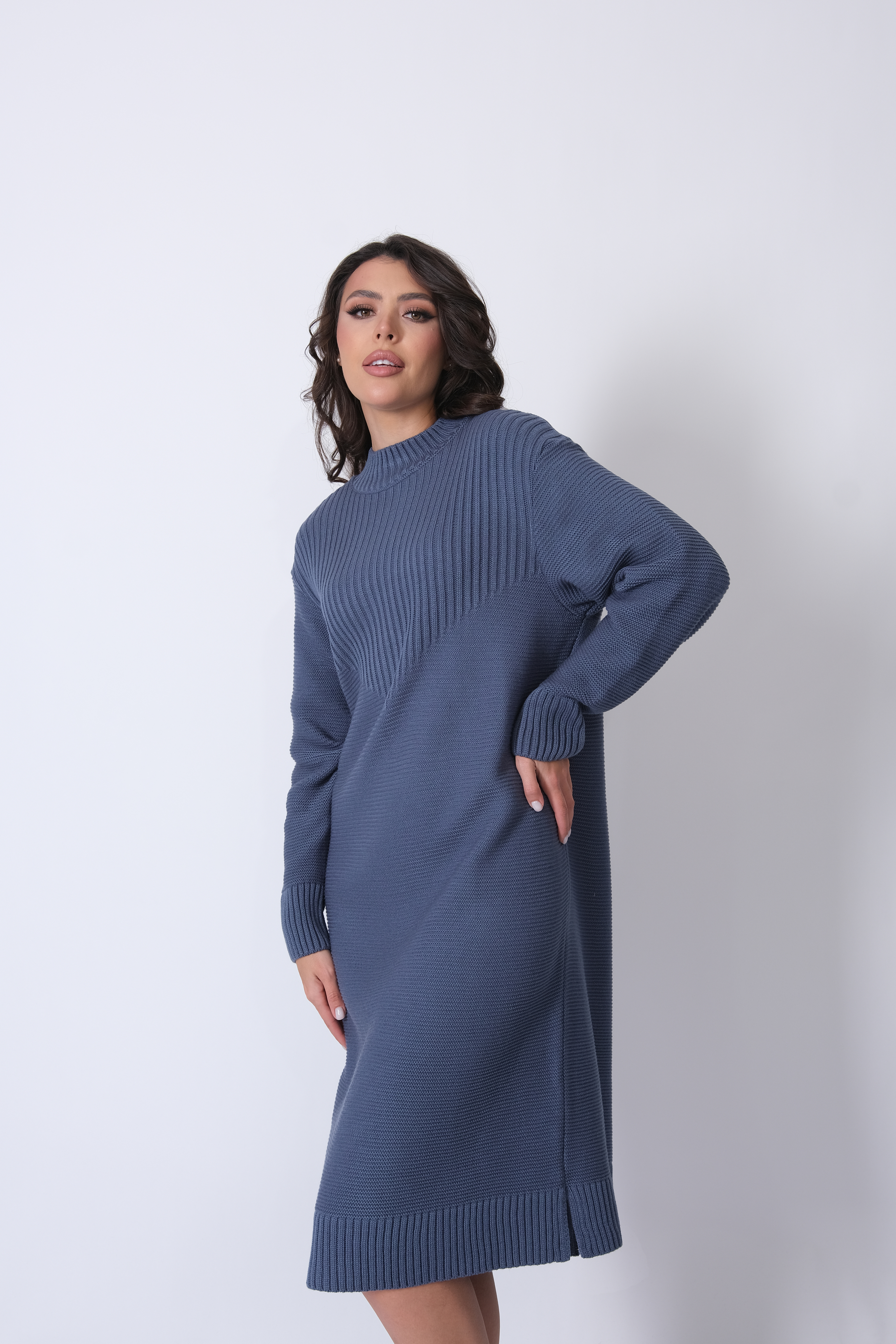 Платье прямого силуэта из трикотажного вязанного полотна с воротником-стойка, спущенным плечом и рукавом полной длины. Кокетка спинки и полочки выполнено переплетением образующим рельефный вертикальный рисунок.