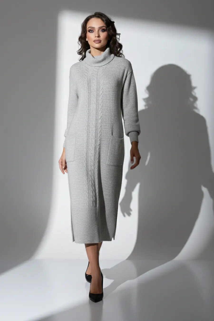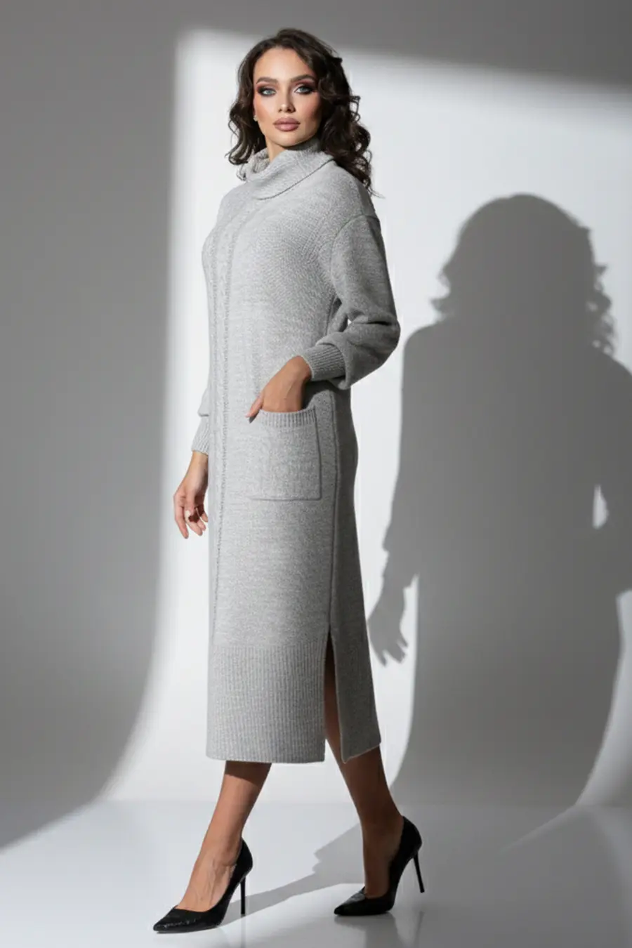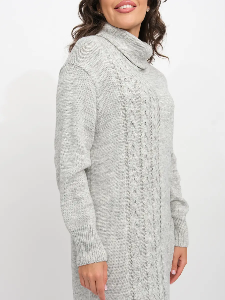 Трикотажное, однотонное платье-свитер прямого силуэта с отложным воротником-стойка. Длинные рукава с приспущенным плечом. Внизу платья небольшие разрезы по бокам. Вертикальный узором в виде кос визуально вытянет Ваш силуэт. Материал с добавлением шерсти согреет в холодные дни. Длина миди – классика, которая будет актуальна всегда. Горло эластичное, не будет давить и мешаться, при этом будет согревать и заменит шарф. Воротник мягкий, при необходимости можно моделировать и делать отворот. . Если вы любите удобные, теплые наряды на каждый день, то эта модель для Вас.