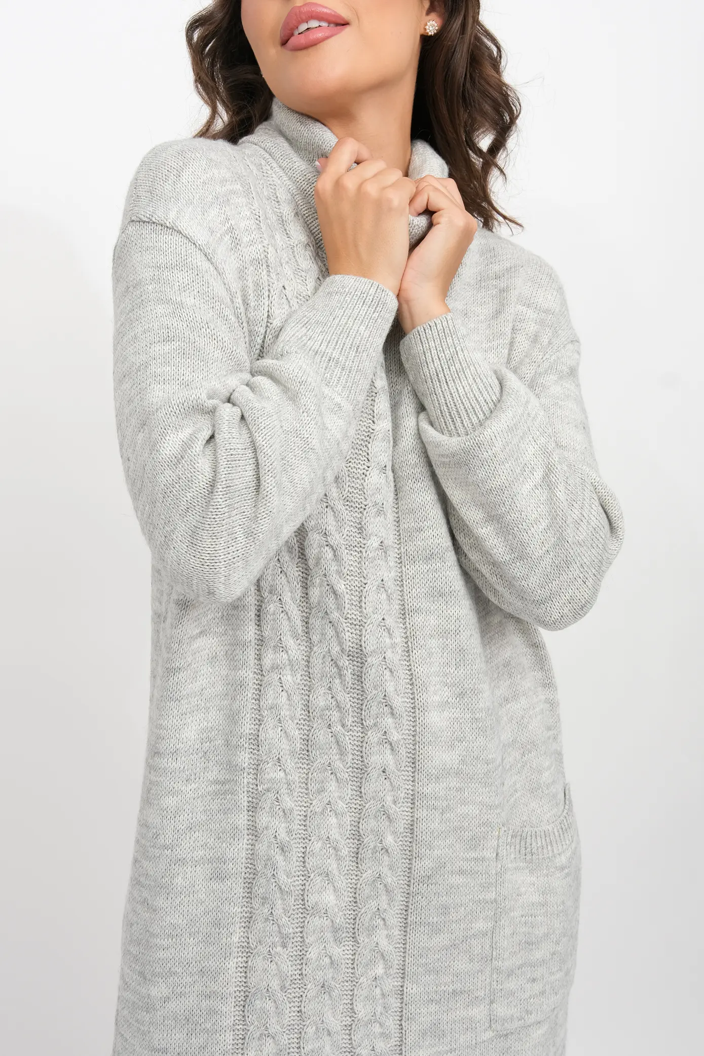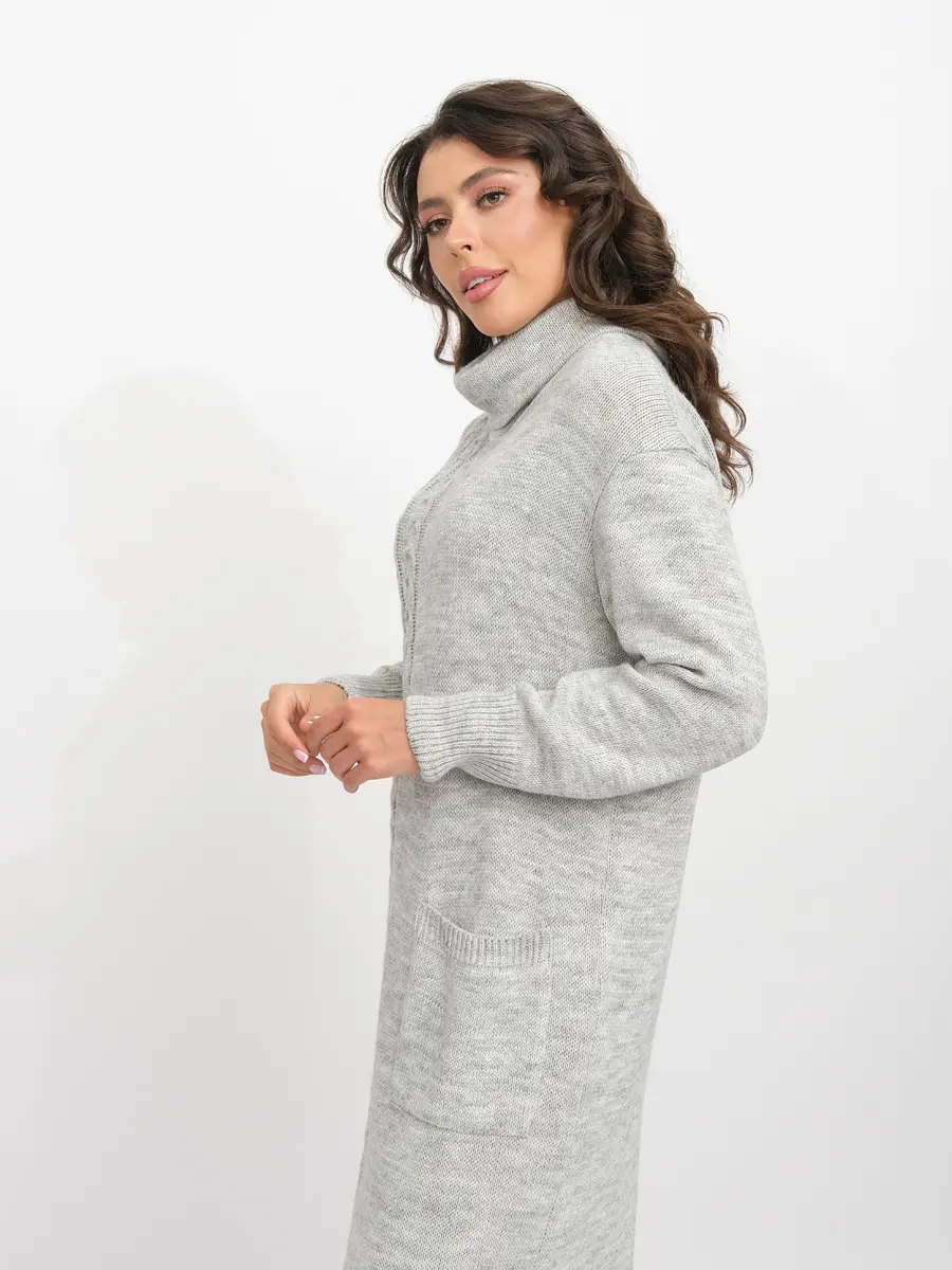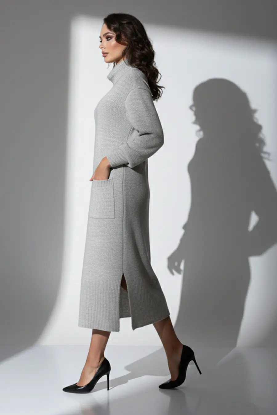 Трикотажное, однотонное платье-свитер прямого силуэта с отложным воротником-стойка. Длинные рукава с приспущенным плечом. Внизу платья небольшие разрезы по бокам. Вертикальный узором в виде кос визуально вытянет Ваш силуэт. Материал с добавлением шерсти согреет в холодные дни. Длина миди – классика, которая будет актуальна всегда. Горло эластичное, не будет давить и мешаться, при этом будет согревать и заменит шарф. Воротник мягкий, при необходимости можно моделировать и делать отворот. . Если вы любите удобные, теплые наряды на каждый день, то эта модель для Вас.