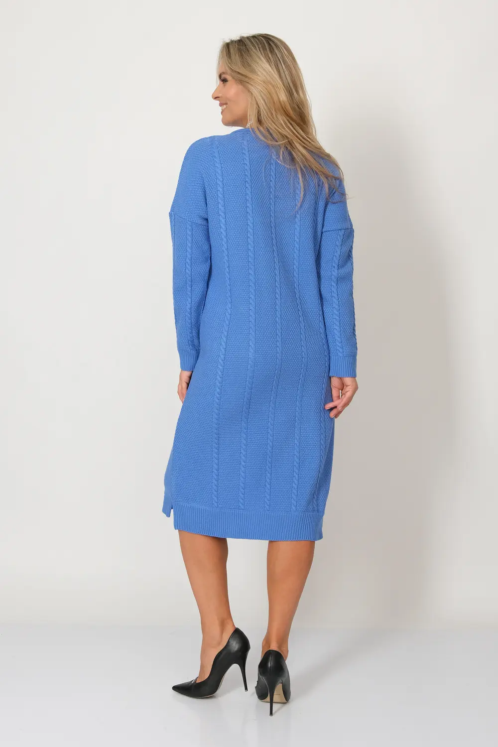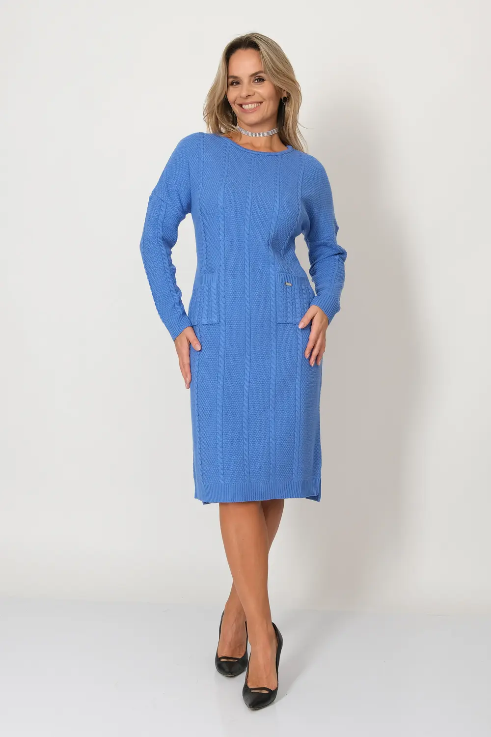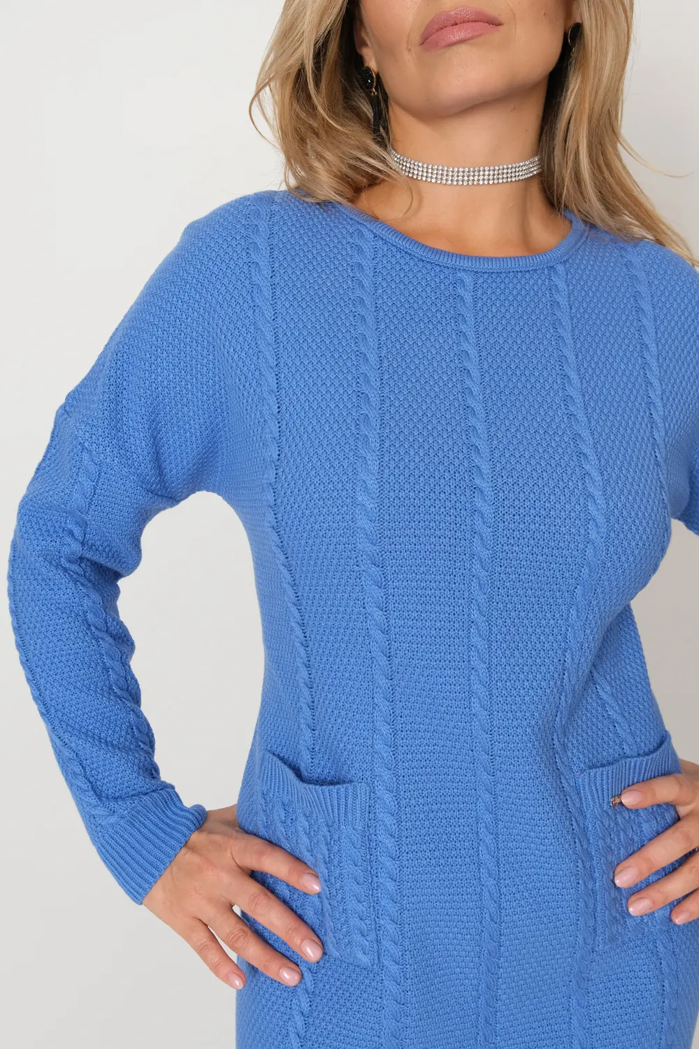 Вязанное женское платье полуприлегающего силуэта с круглой горловиной. Платье с длинным рукавом. Два кармана по бокам ниже уровня талии. Выполнено структурным переплетением с вертикальными косами, которые добавят стройности Вашей фигуре.