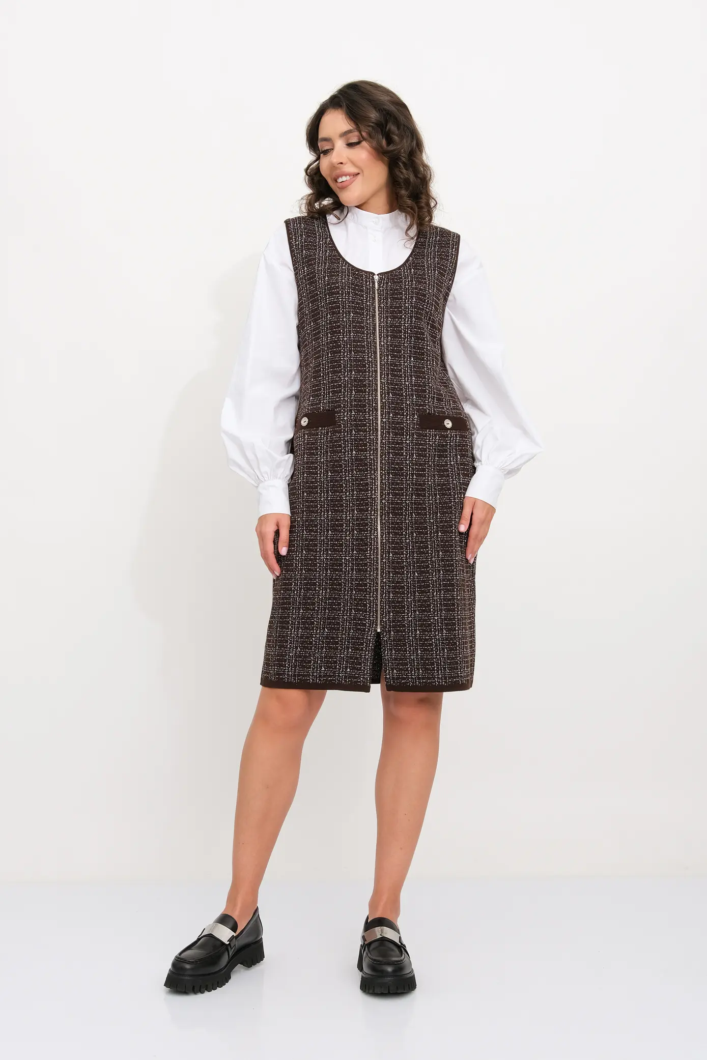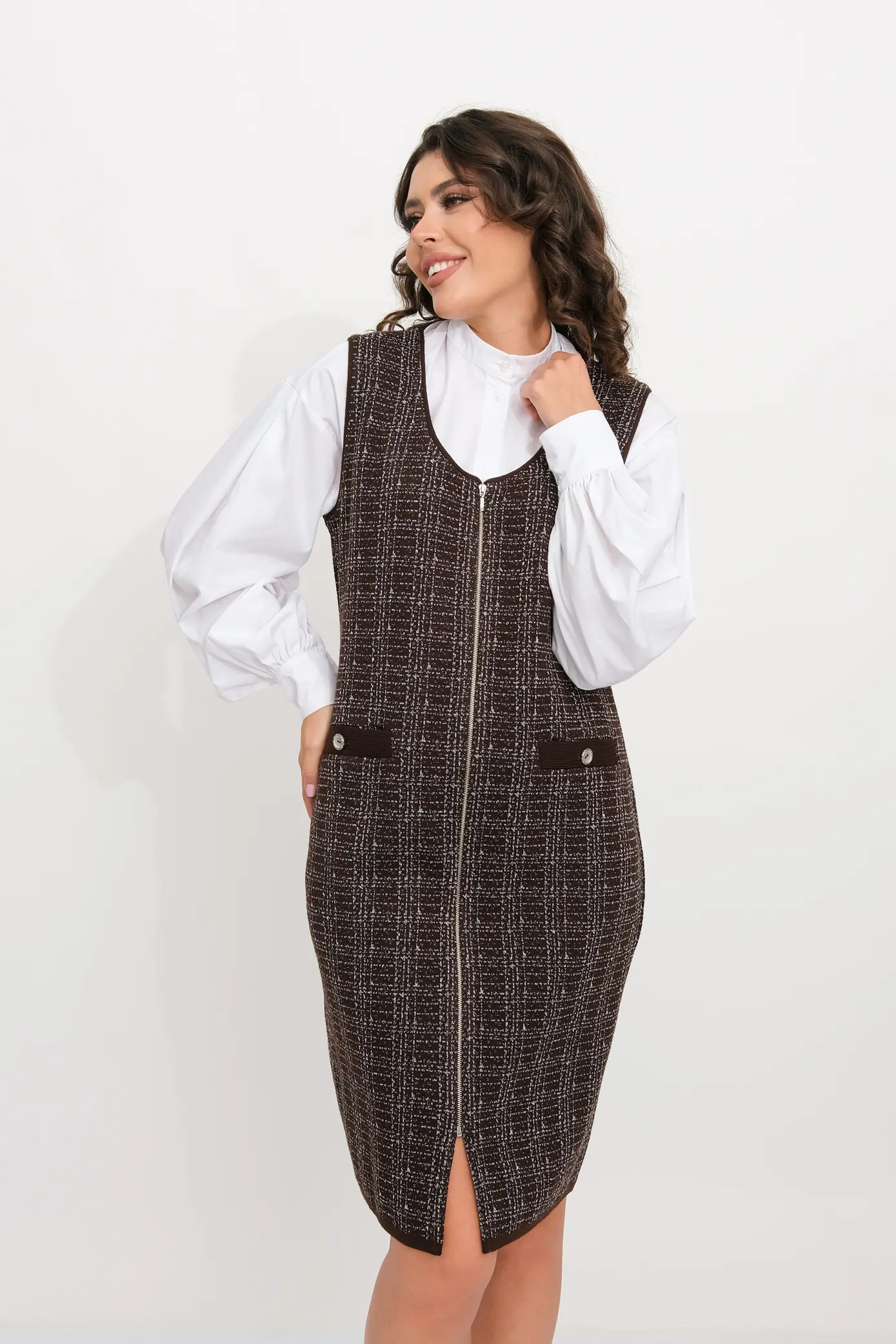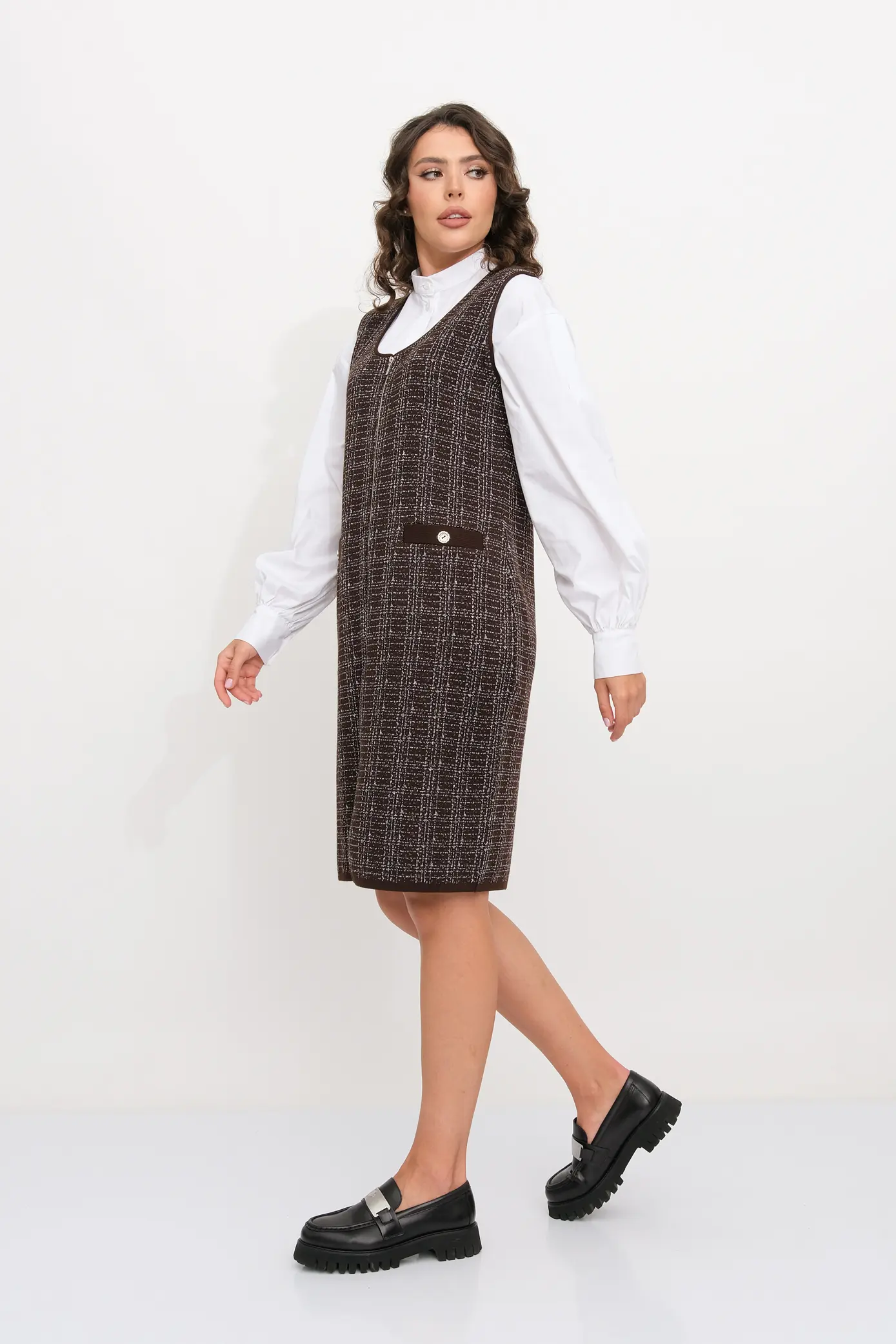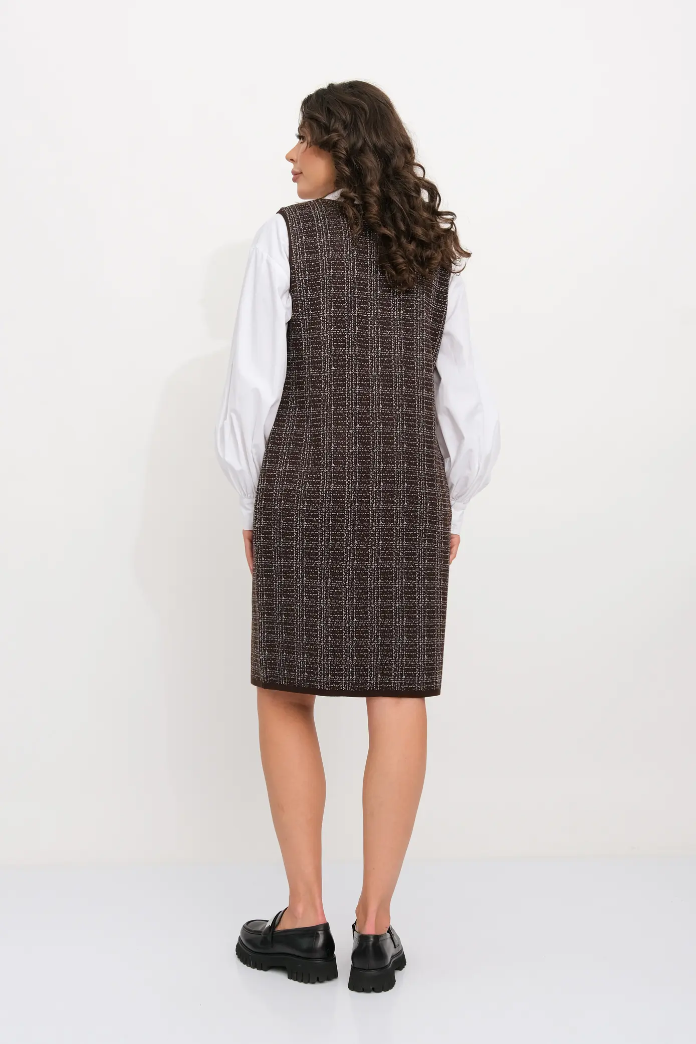 Вязаное женское платье-сарафан полуприлегающего силуэта. Застежка - молния. Выполнено жаккардовым структурным переплетением рисунок клетка. Платье-сарафан для офисного, повседневного и делового стиля, будет отлично сочетаться с водолазками, рубашками, блузками, джемперами или футболками.
