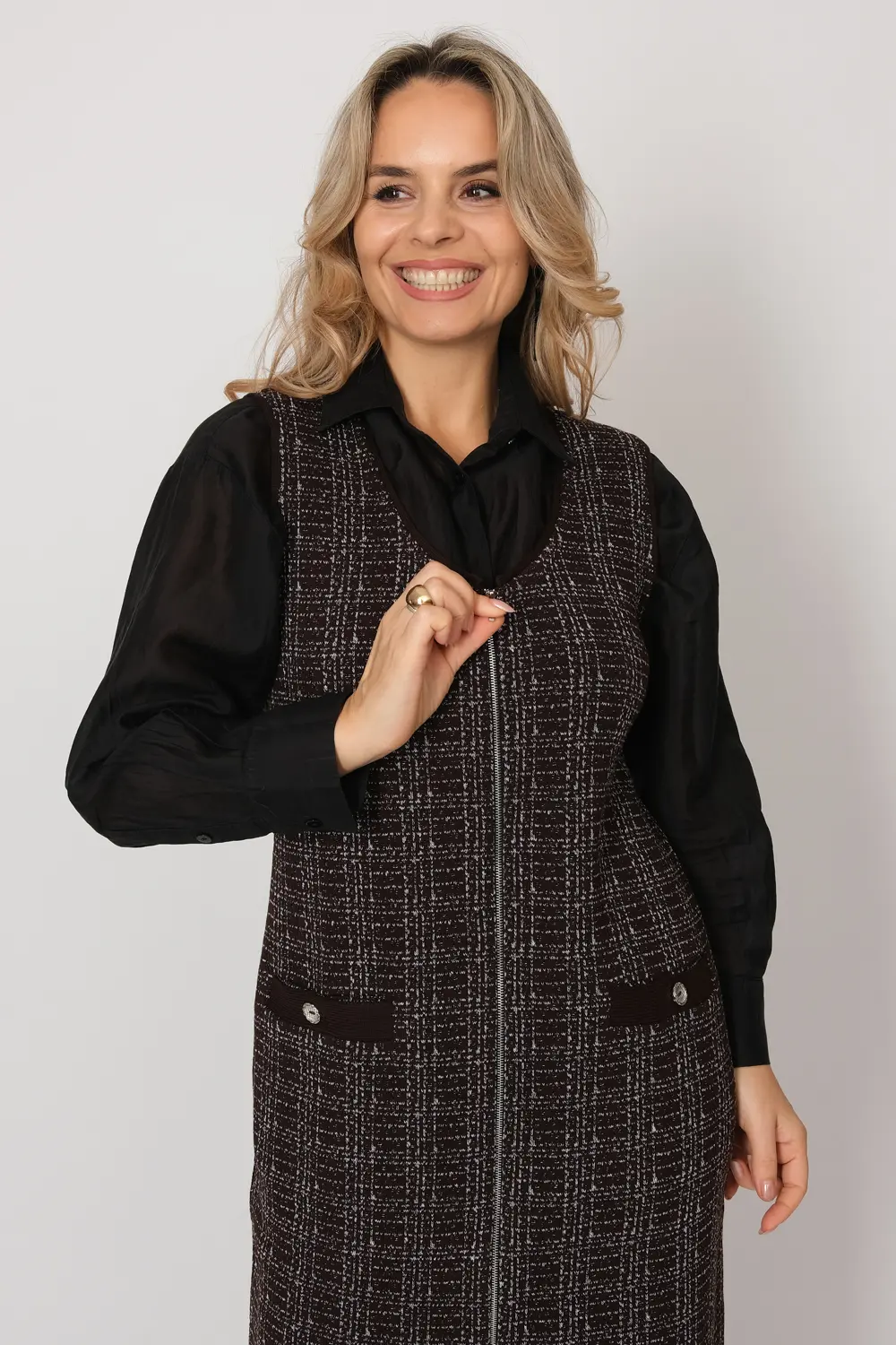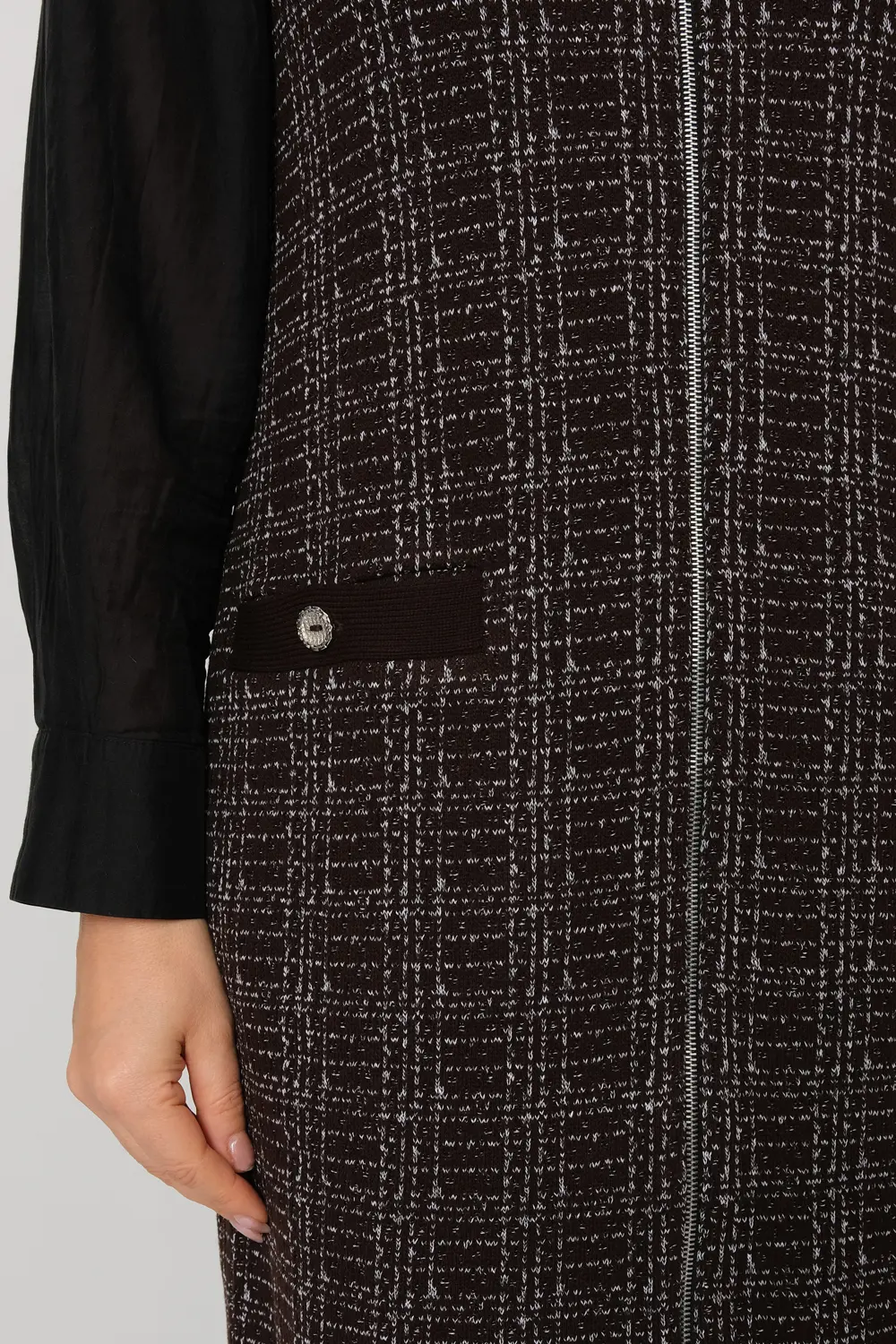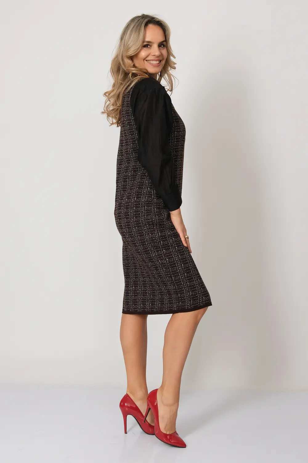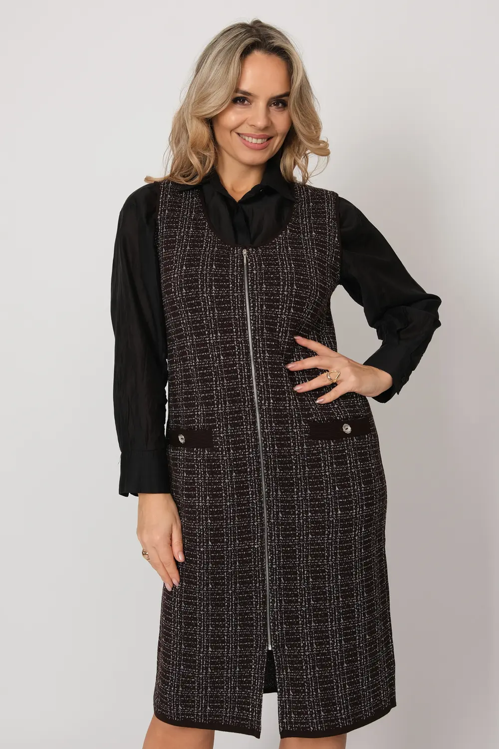 Вязаное женское платье-сарафан полуприлегающего силуэта. Застежка - молния. Выполнено жаккардовым структурным переплетением рисунок клетка. Платье-сарафан для офисного, повседневного и делового стиля, будет отлично сочетаться с водолазками, рубашками, блузками, джемперами или футболками.