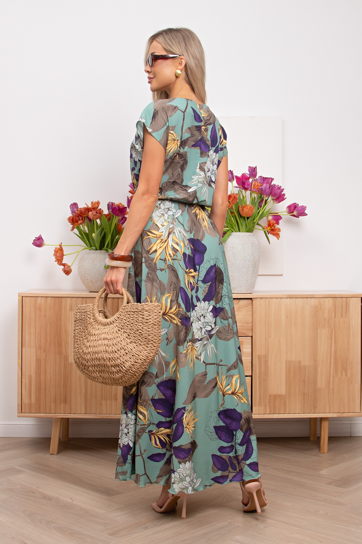 Воздушное платье полуприлегающего силуэта с цветочным принтом. Короткие спущенные рукава. Горловина на внутренней обтачке оформлена "лодочкой". Модель отрезная по талии, собрана на резинку. Низ ровный, без разрезов.