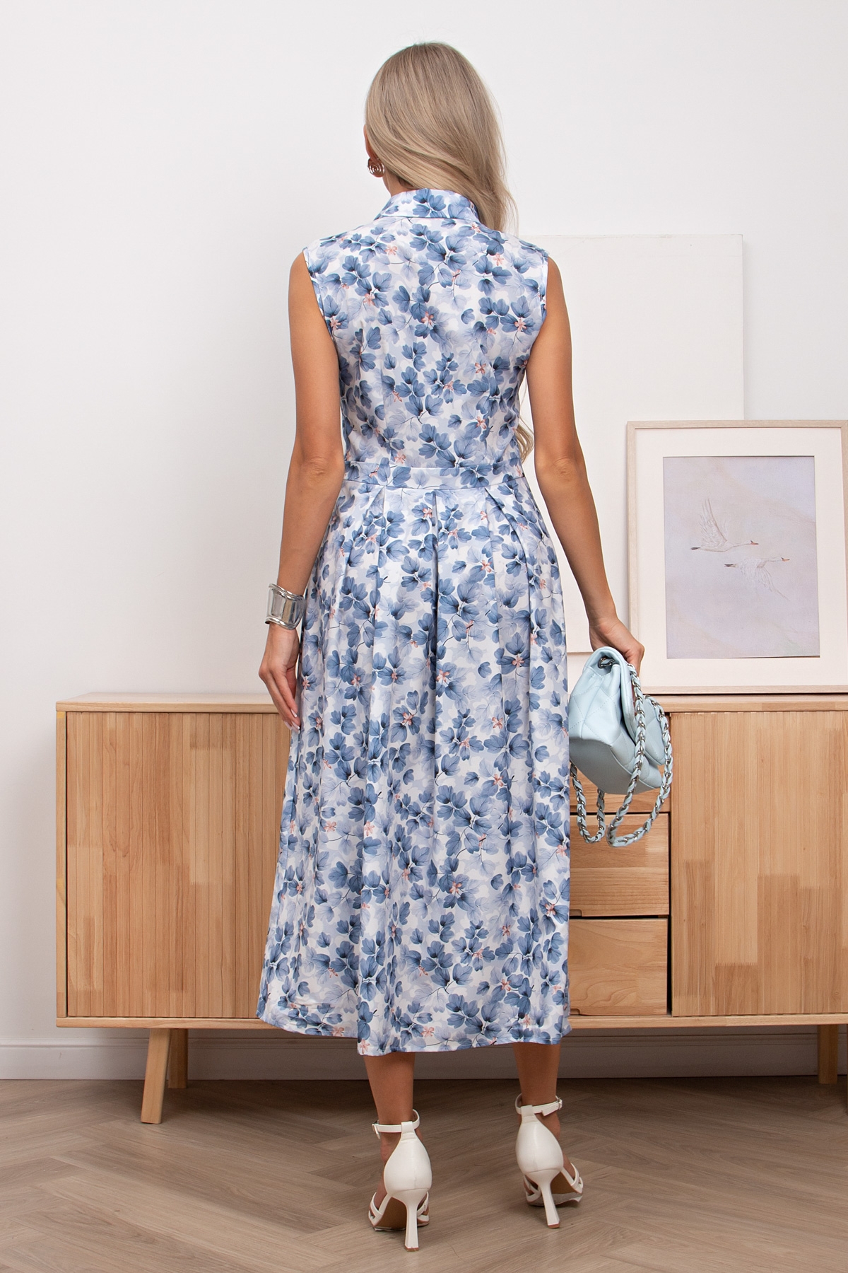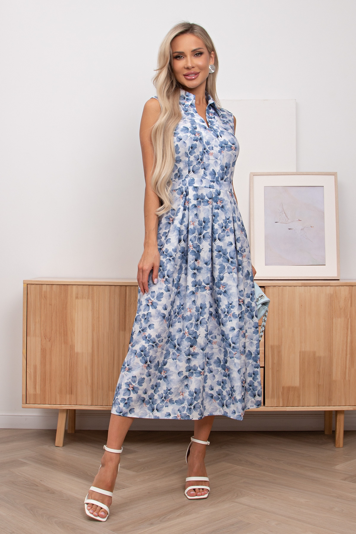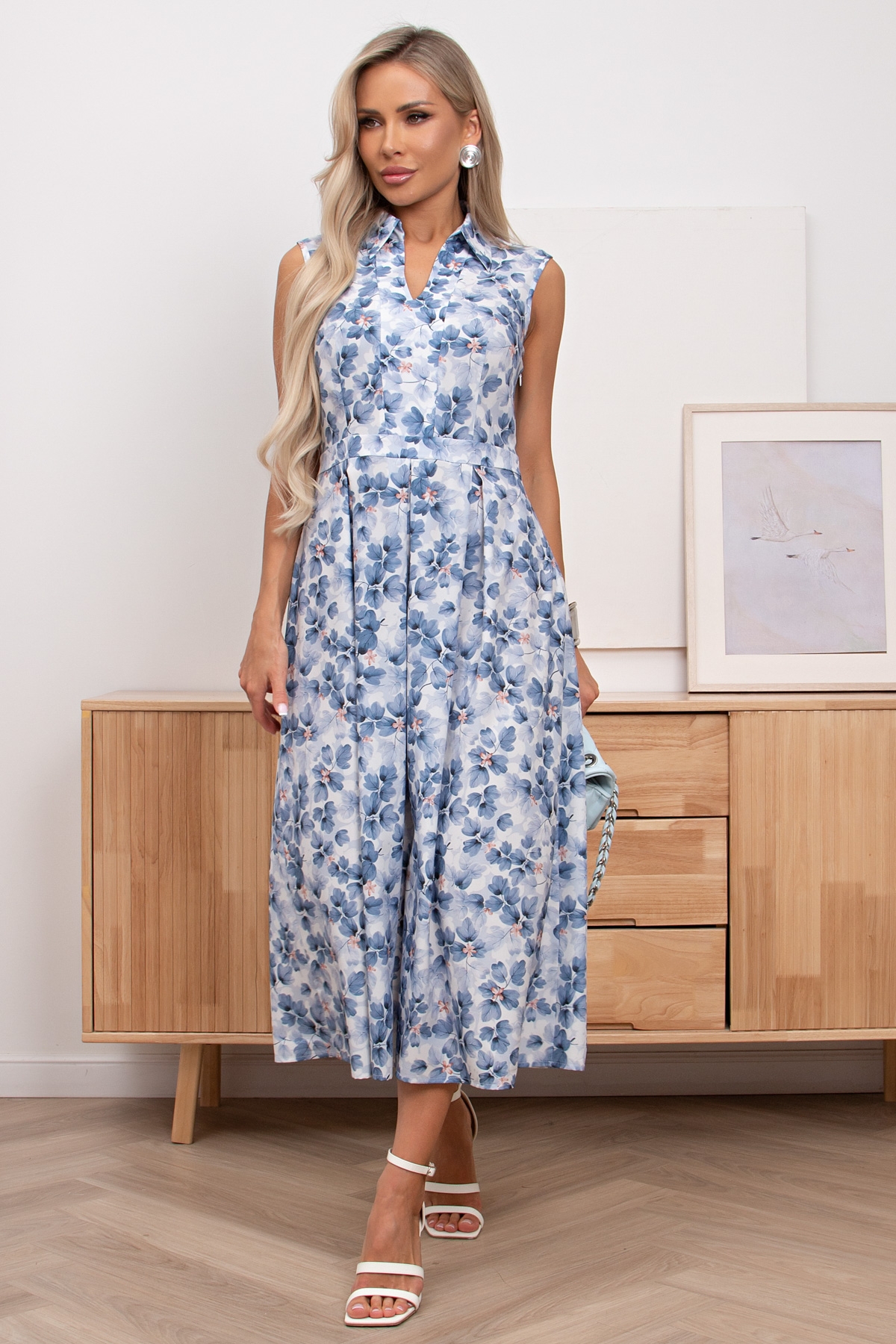 Легкое летнее платье приталенного силуэта из текстильного полотна. V-образная горловина оформлена отложным воротником на стойке. Модель отрезная по линии талии на втачном поясе. По юбке встречные складки.С боку застежка на потайную молнию . Низ ровный ,без разрезов.