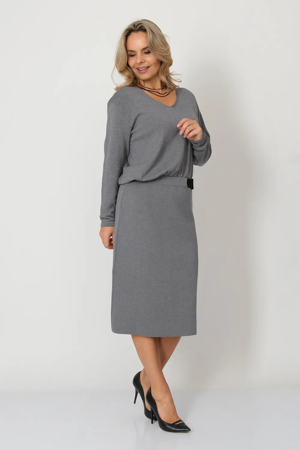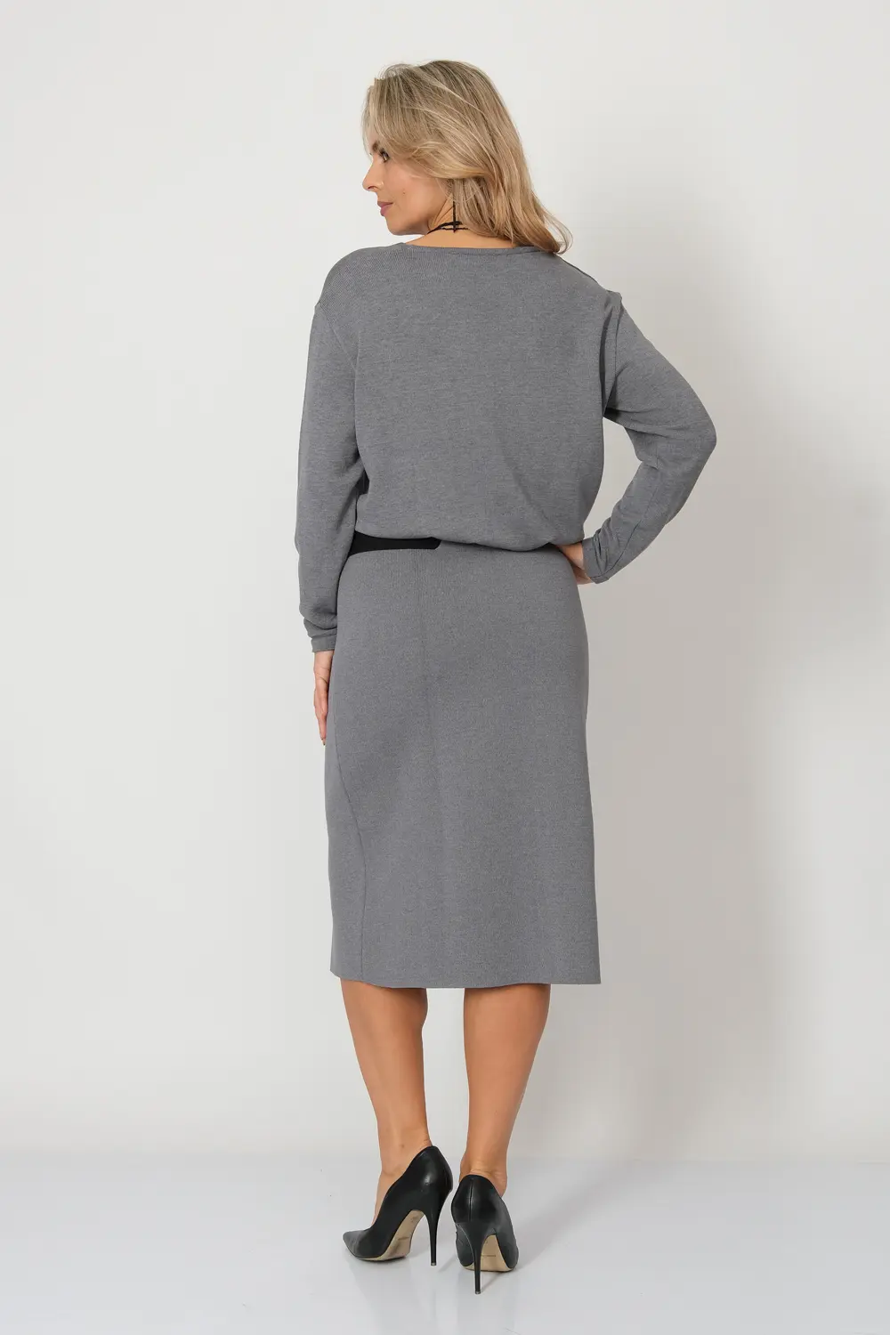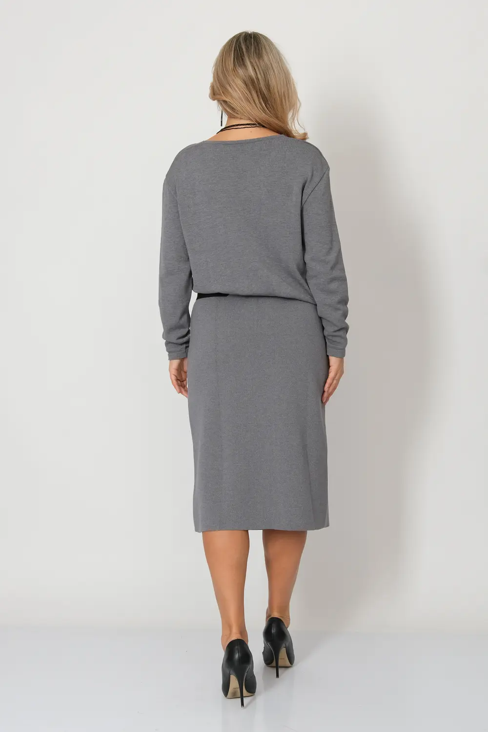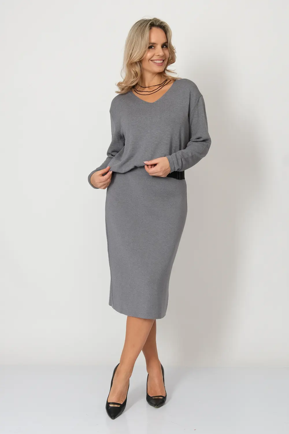 Вязаное элегантное женское платье, отрезное по талии . Спущенное плечо, рукава длинные. V-образный вырез. По талии проложен пояс с пряжкой, драпировка с напуском по правому боку.