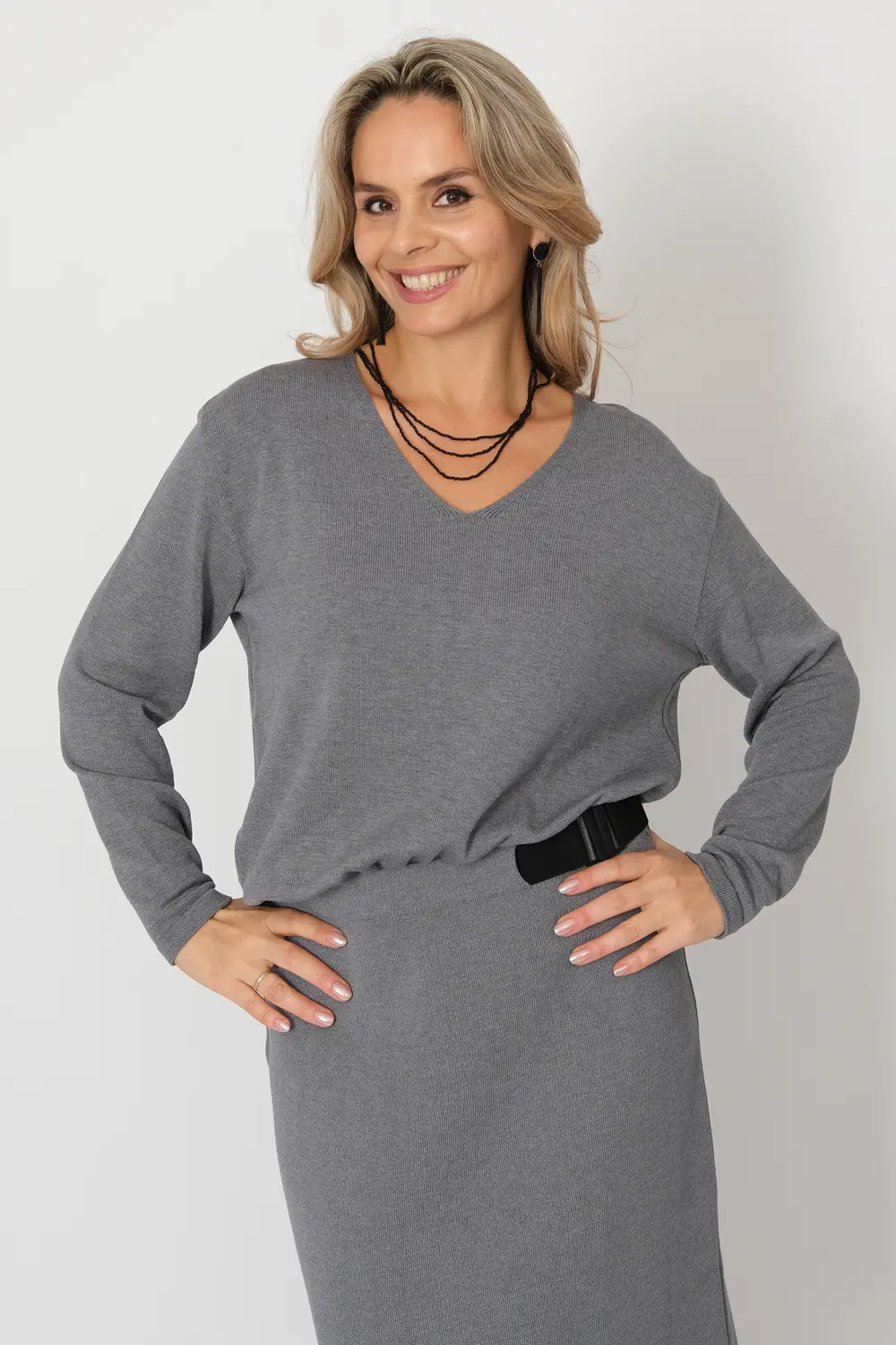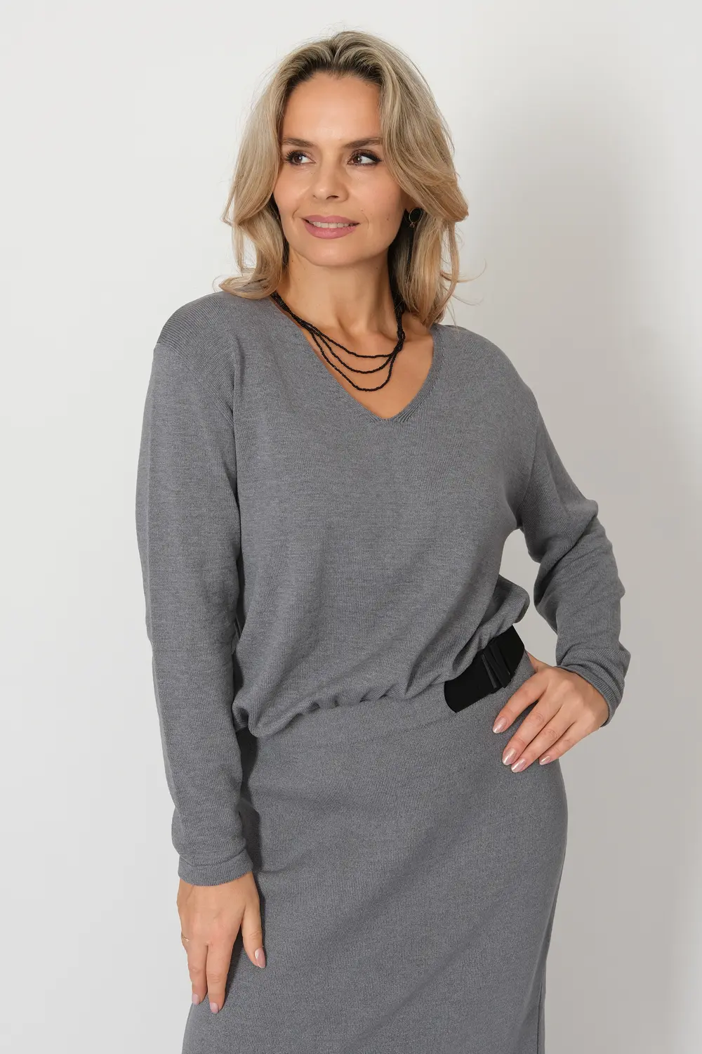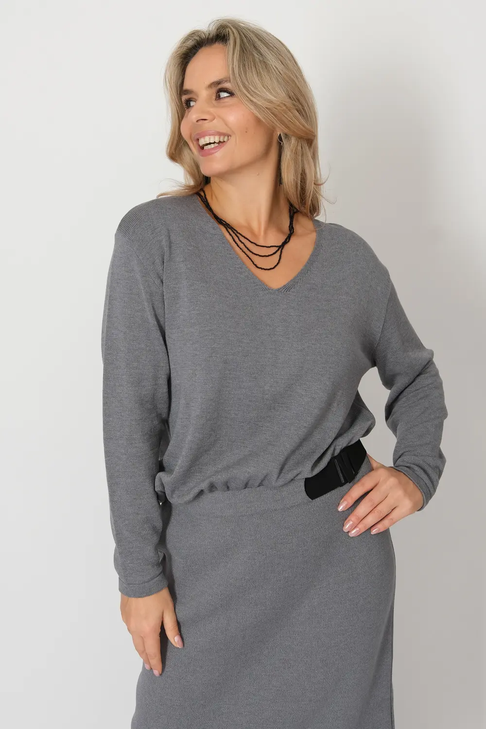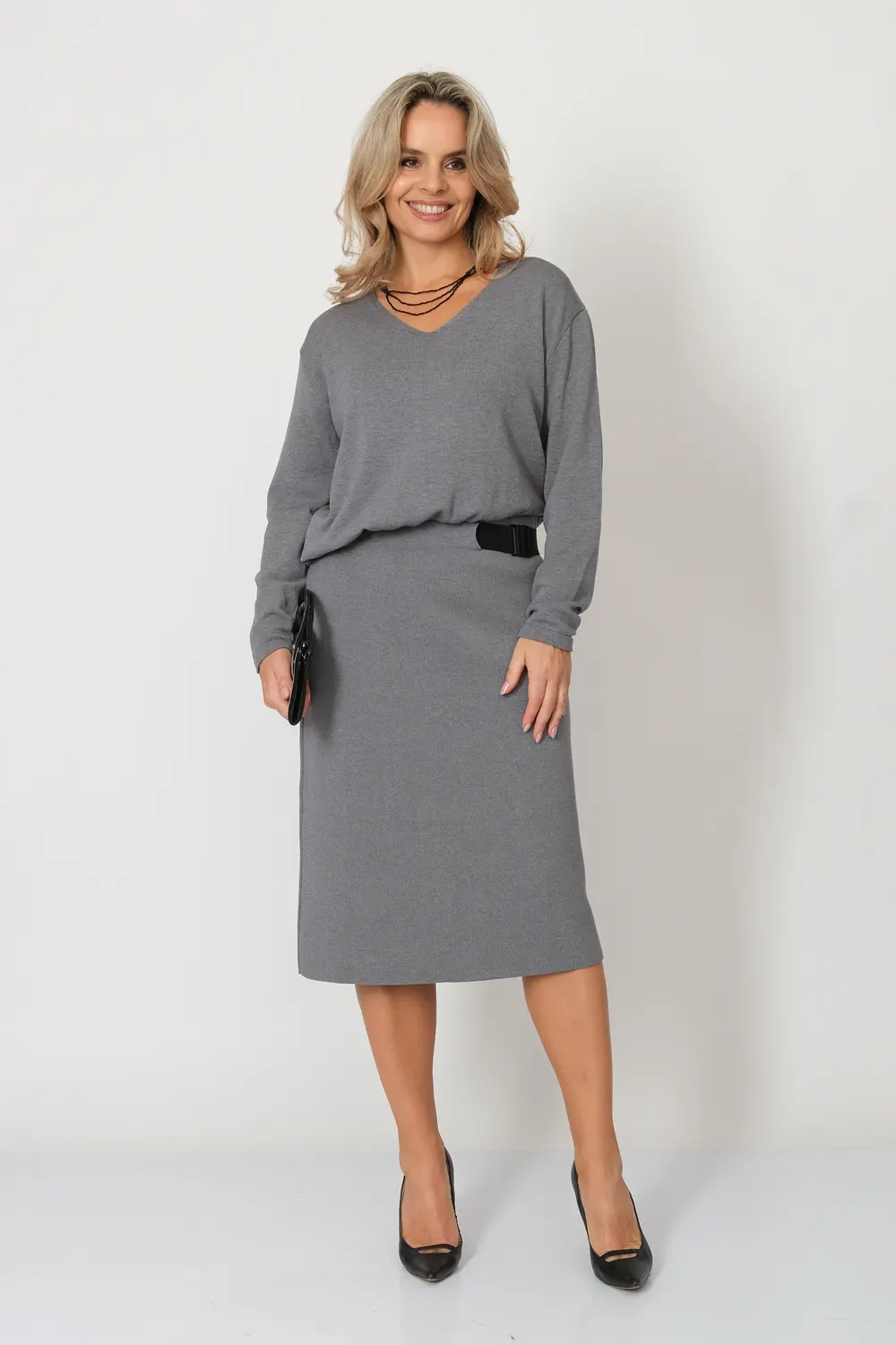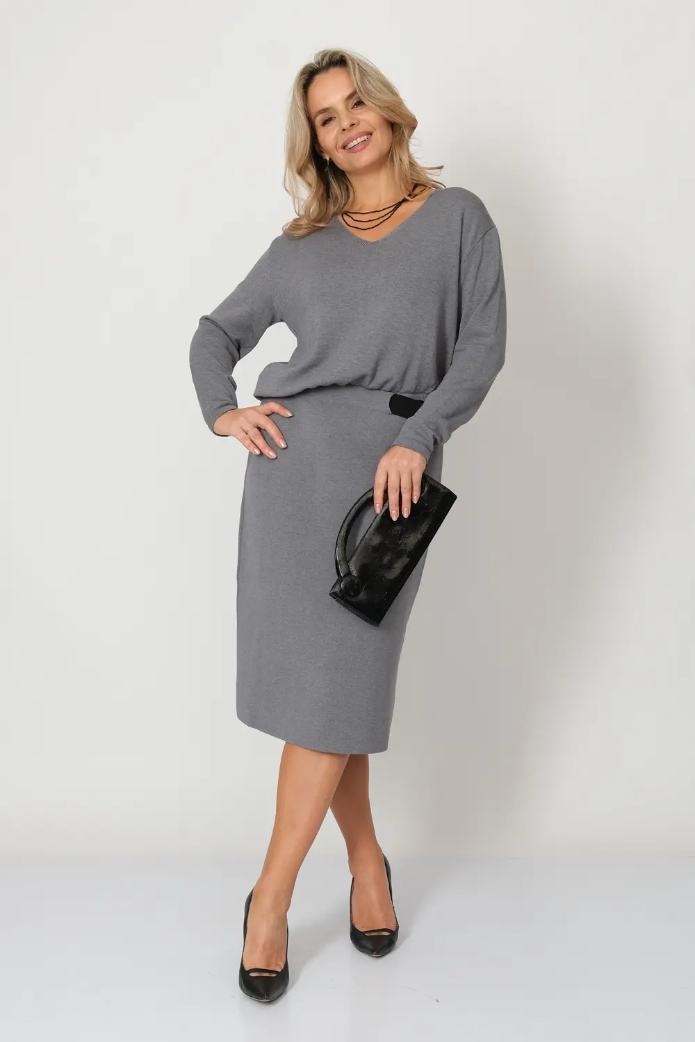 Вязаное элегантное женское платье, отрезное по талии . Спущенное плечо, рукава длинные. V-образный вырез. По талии проложен пояс с пряжкой, драпировка с напуском по правому боку.