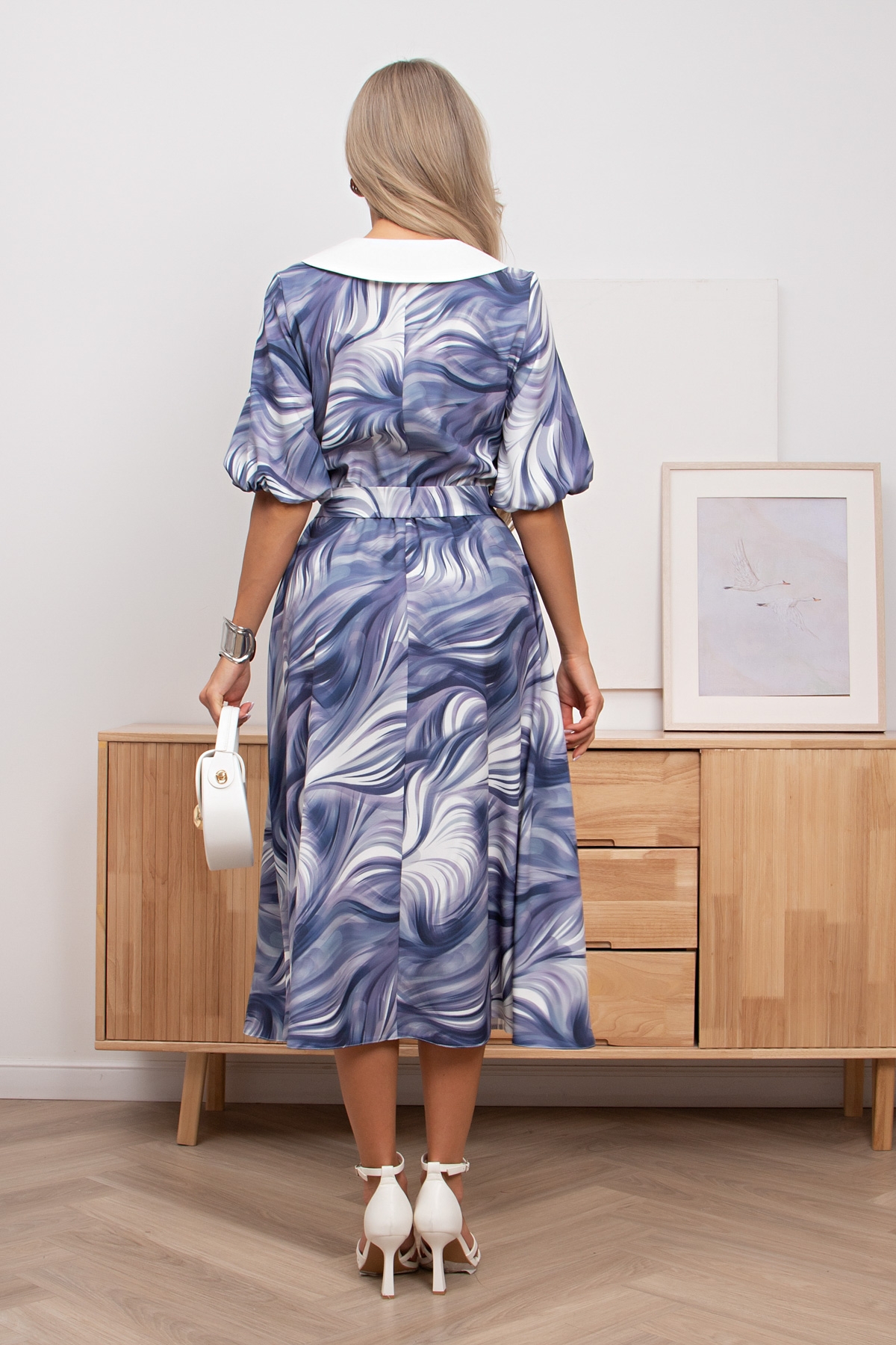 Женственное платье приталенного силуэта из плательной ткани.V- образная горловина оформлена отложным воротником. Втачной рукав -фонарик. Модель обрезная по линии талии присборена на резинку. Низ ровный ,без разрезов. Пояс из основной ткани в комплекте.