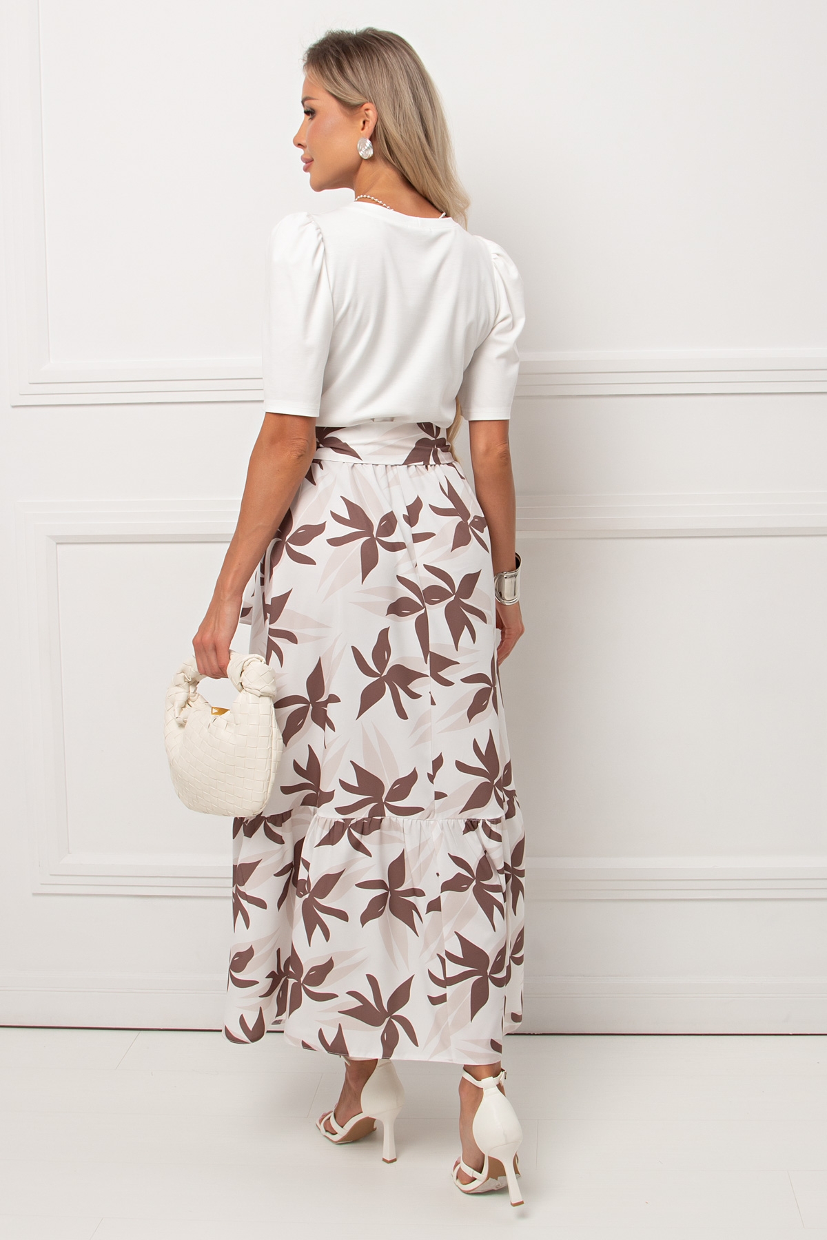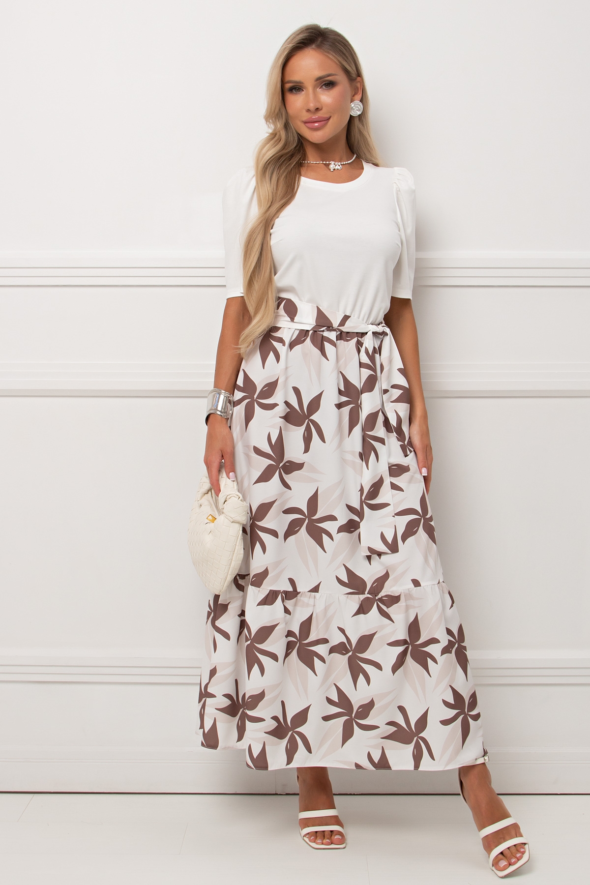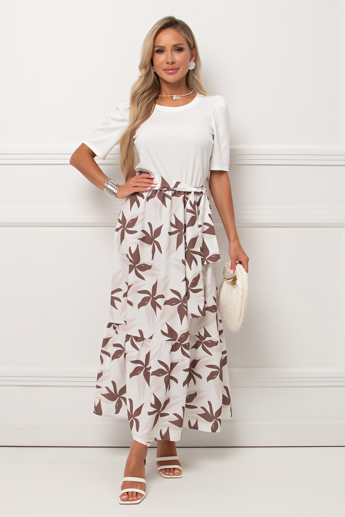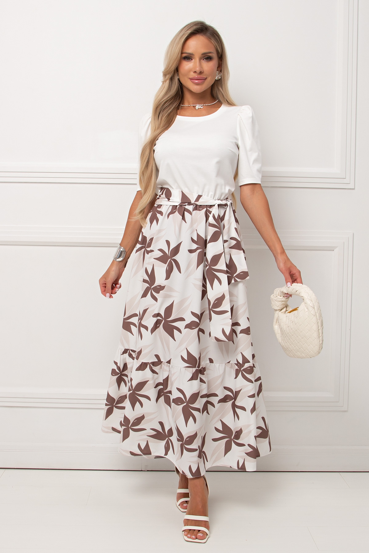 Платье приталенного силуэта. Верхняя часть платья из трикотажного полотна, нижняя из легкой ткани Ниагара. Округлая горловина на внешней обтачке. Втачной рукав фонарик. Отрезная линия талии. Низ оформлен притачным воланом. Пояс из основного материала в комплекте.