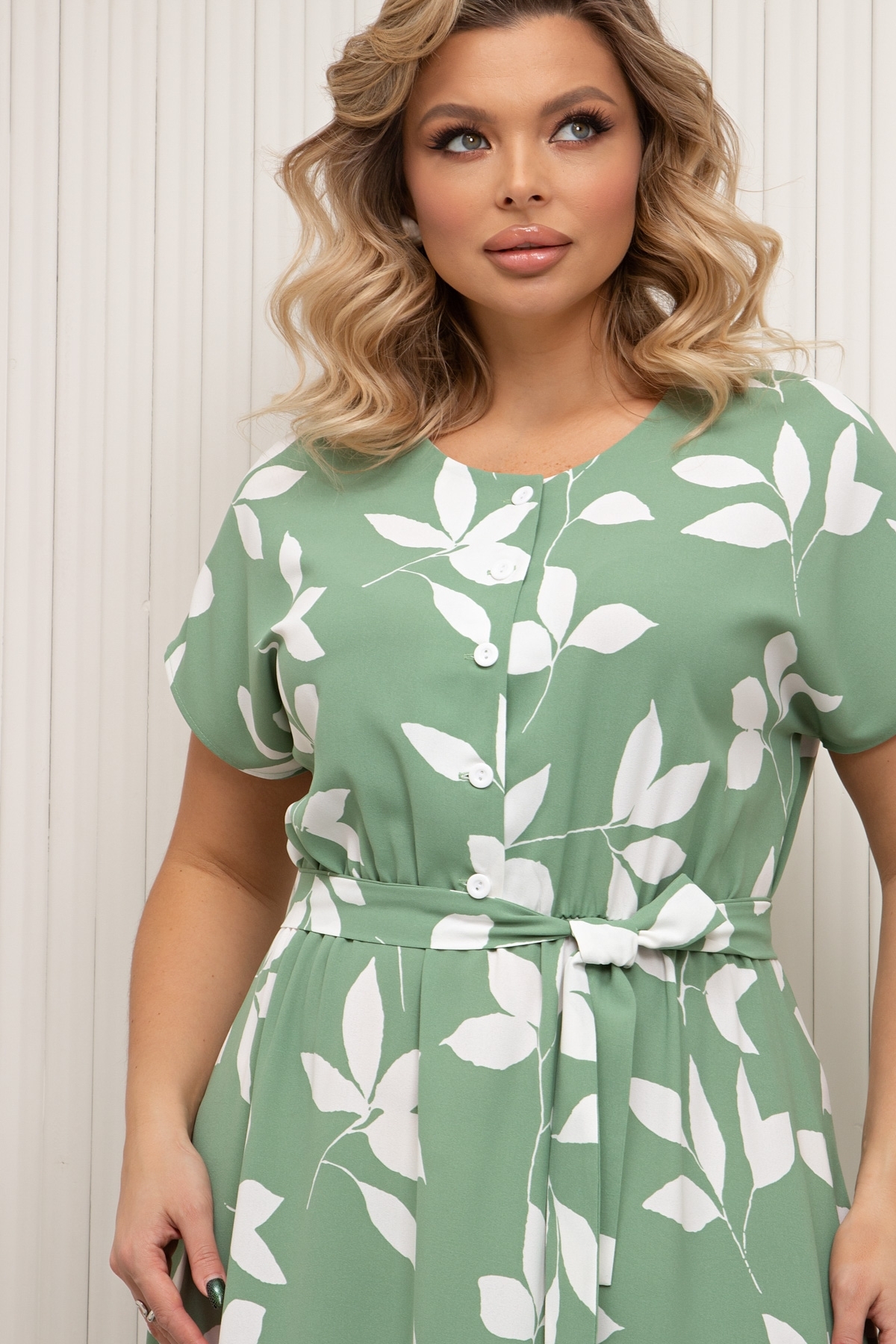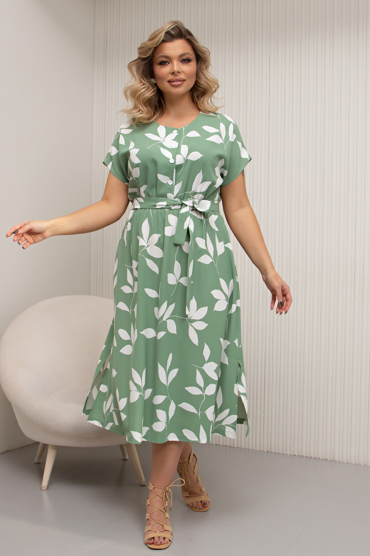 Комфортное платье приталенного силуэта. Округленная горловина на внутренней обтачке. По переду планка с застежкой на петли и пуговицы. Цельнокроеный короткий рукав. Модель отрезная по линии талии, присобрана на эластичную резинку. Низ ровный, по бокам разрезы. Тканевый пояс дополнительно подчеркнёт линию талии. Пояс пришит для того, чтобы в процессе примерки не потерялся, его можно отпороть.
